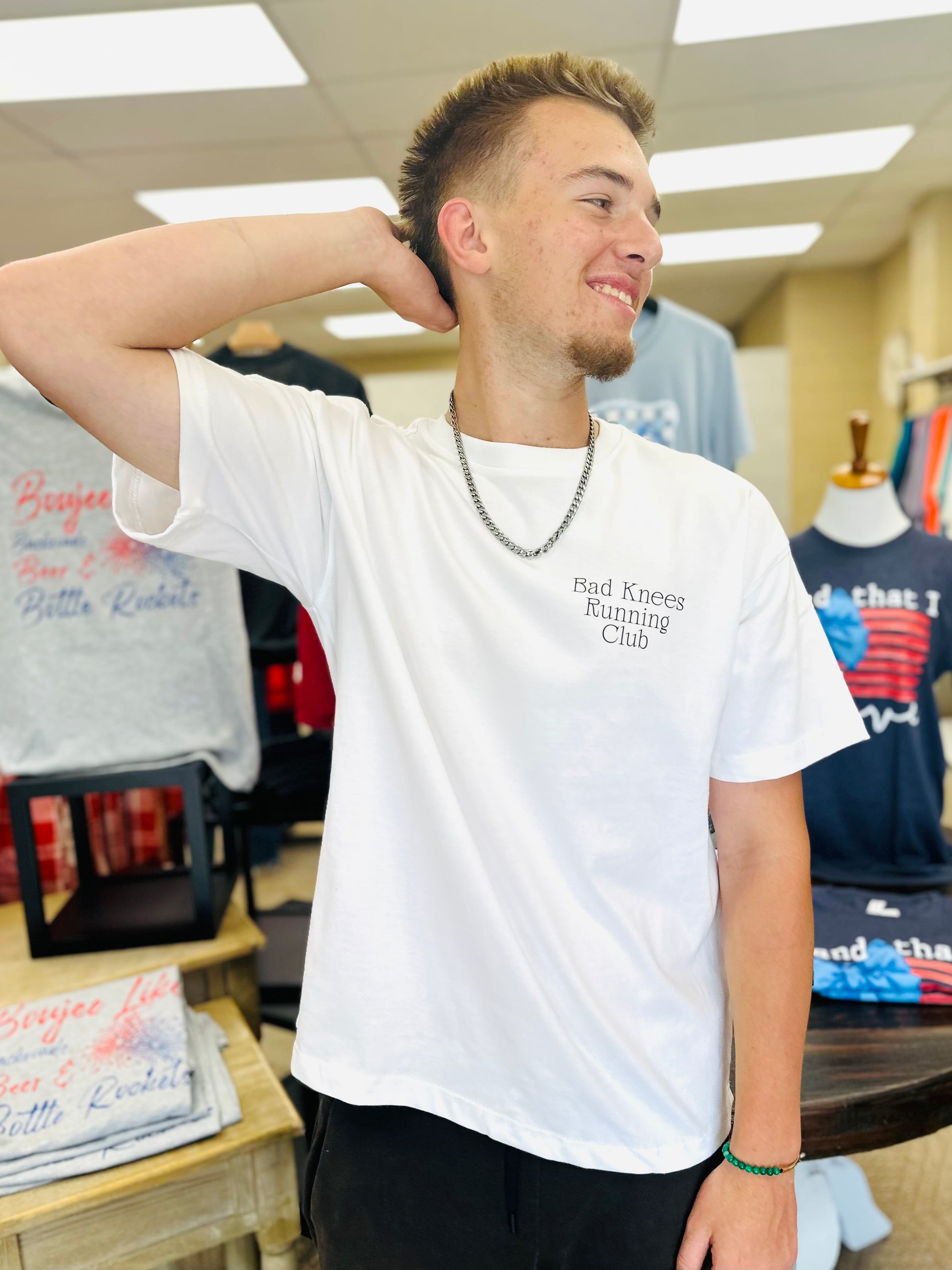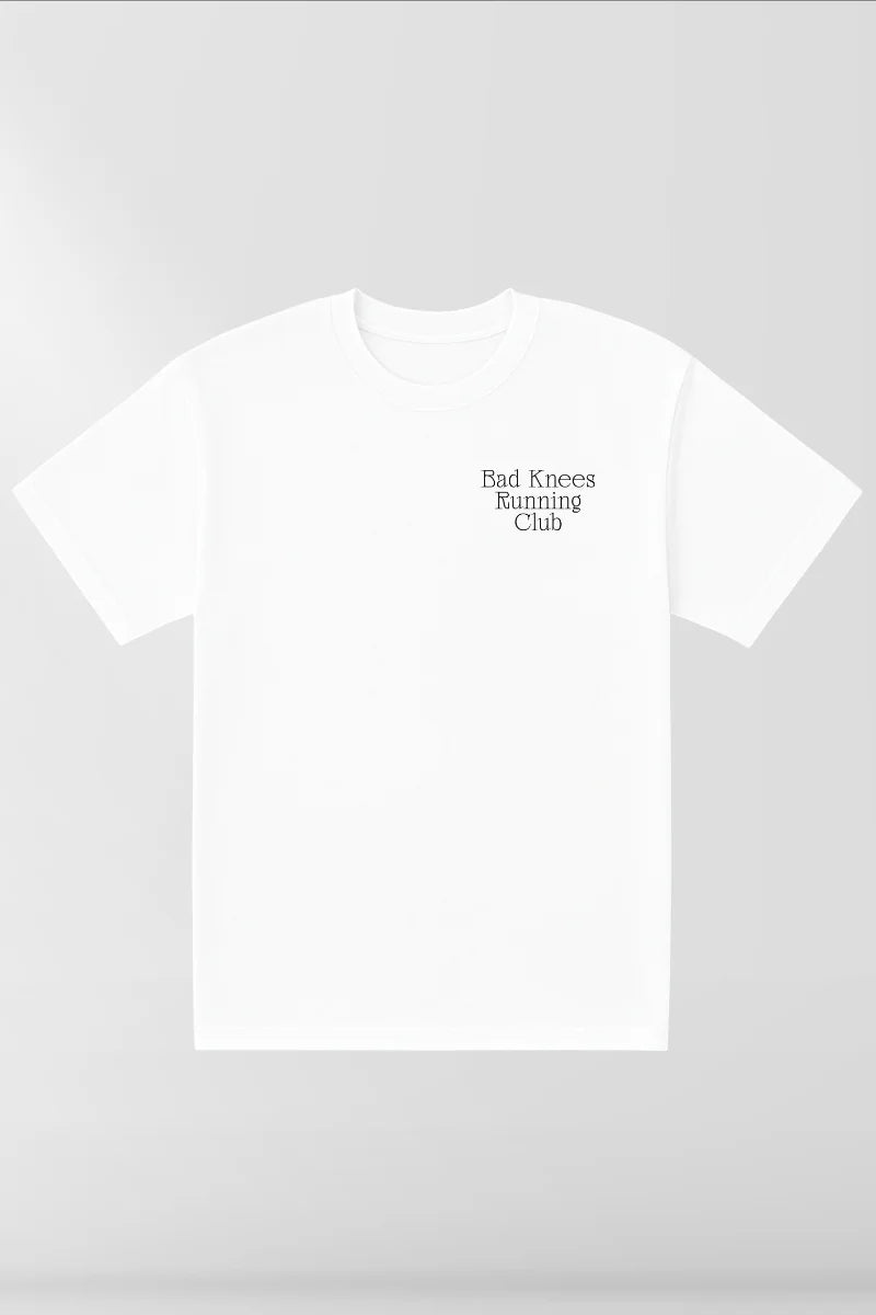 Still laced up. Still showing up. The "Bad Knees Running Club" tee is for the try-hards with tendonitis and the weekend warriors who stretch more than they run. Minimalist, witty, and weirdly motivational—this white 100% preshrunk cotton box tee gets it. You're not fast, but you're out there.