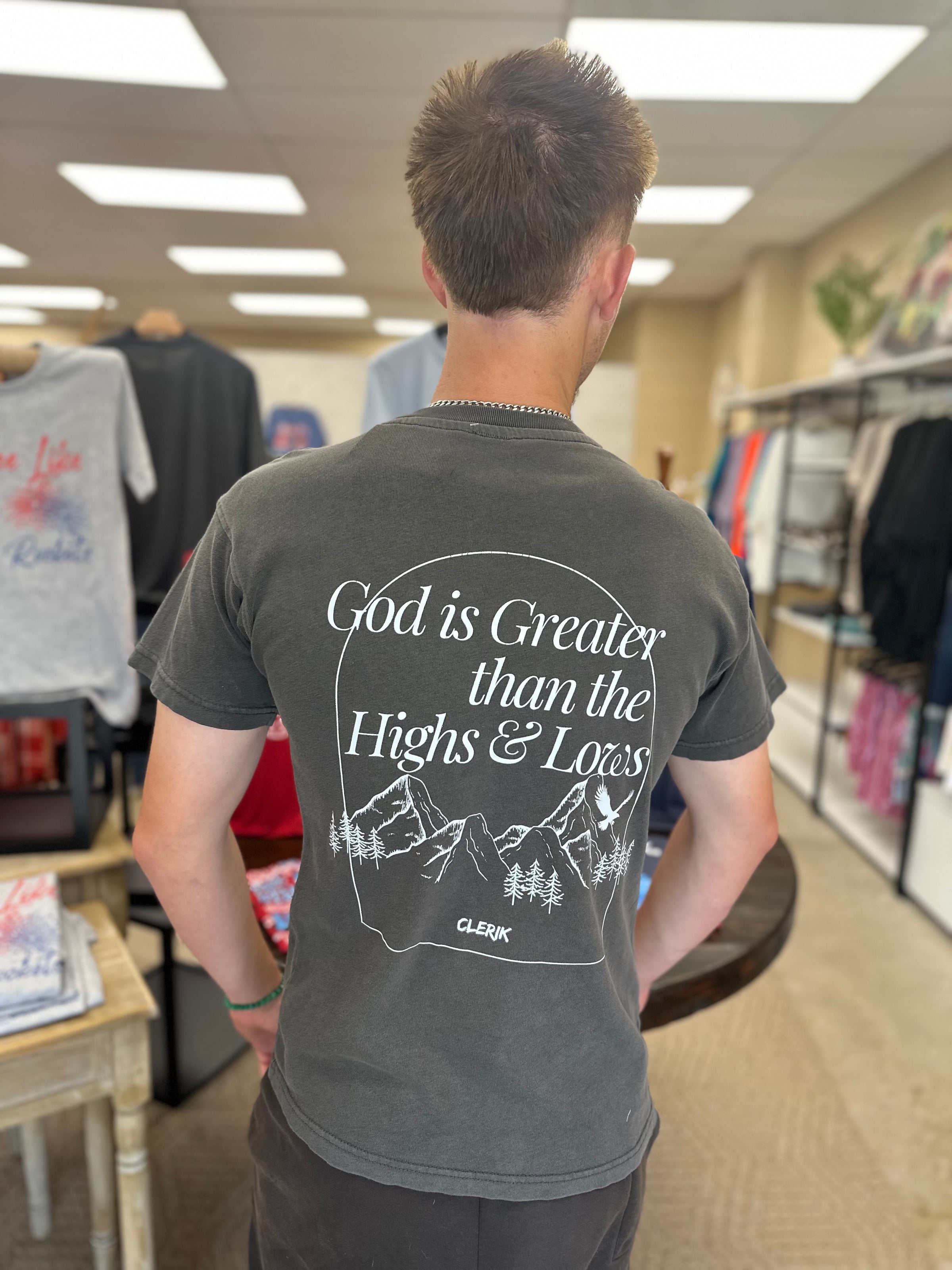 Peace isn't about the perfect day—it's about knowing who's got you through all of them. The "God is Greater than the Highs & Lows" tee features a minimalist mountain scene on our black 100% preshrunk cotton box tee, framed like a window of perspective. Simple, bold, and centered in truth.