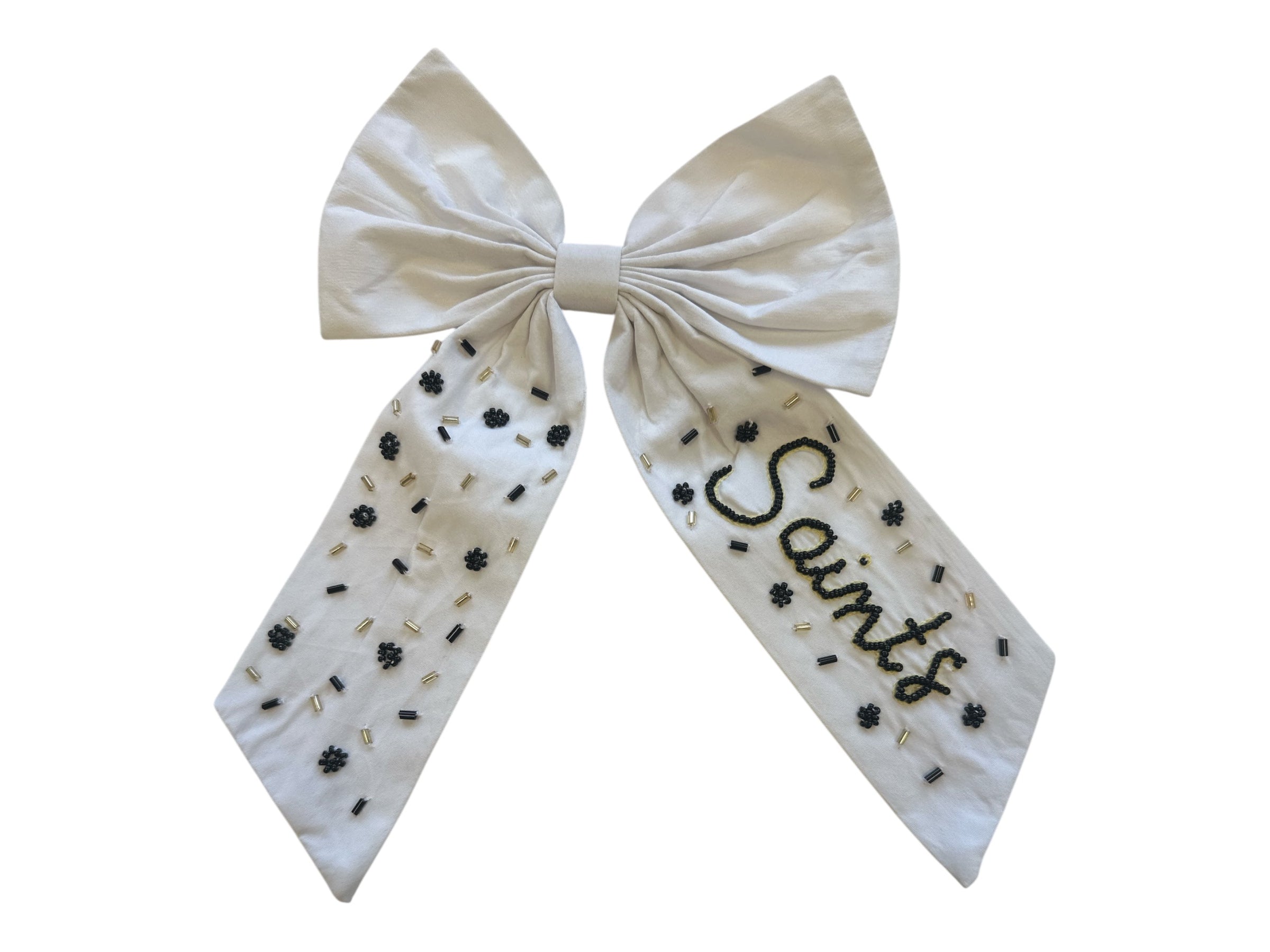 Cheer on your team with the Game Day Bow β Saints! Featuring striking black and gold colors, this oversized bow is perfect for showing your Saints pride at games, tailgates, or spirited gatherings. Crafted from quality ribbon with a secure clip, itβs the ultimate accessory to complete your game day look. βοΈπ€π