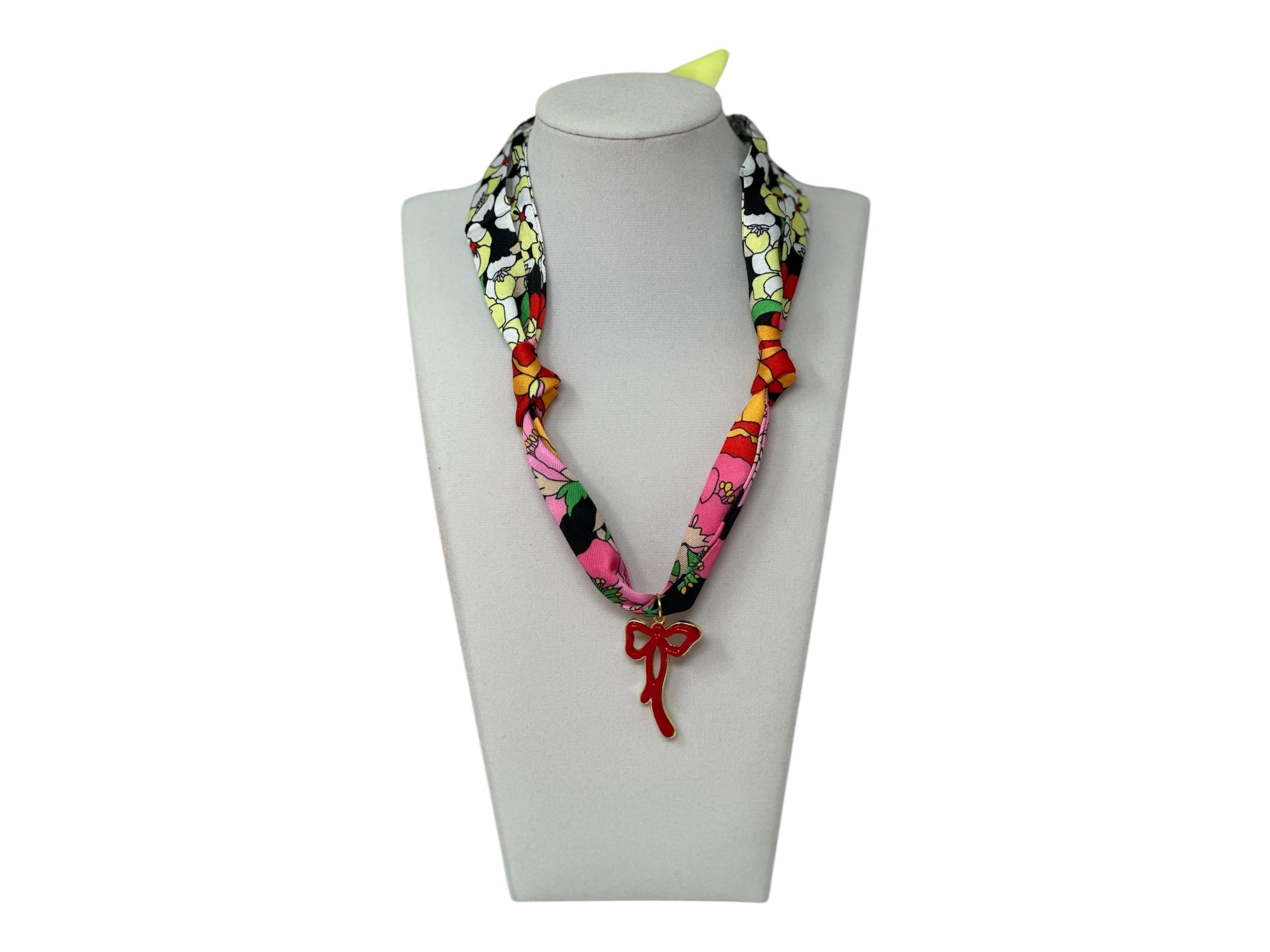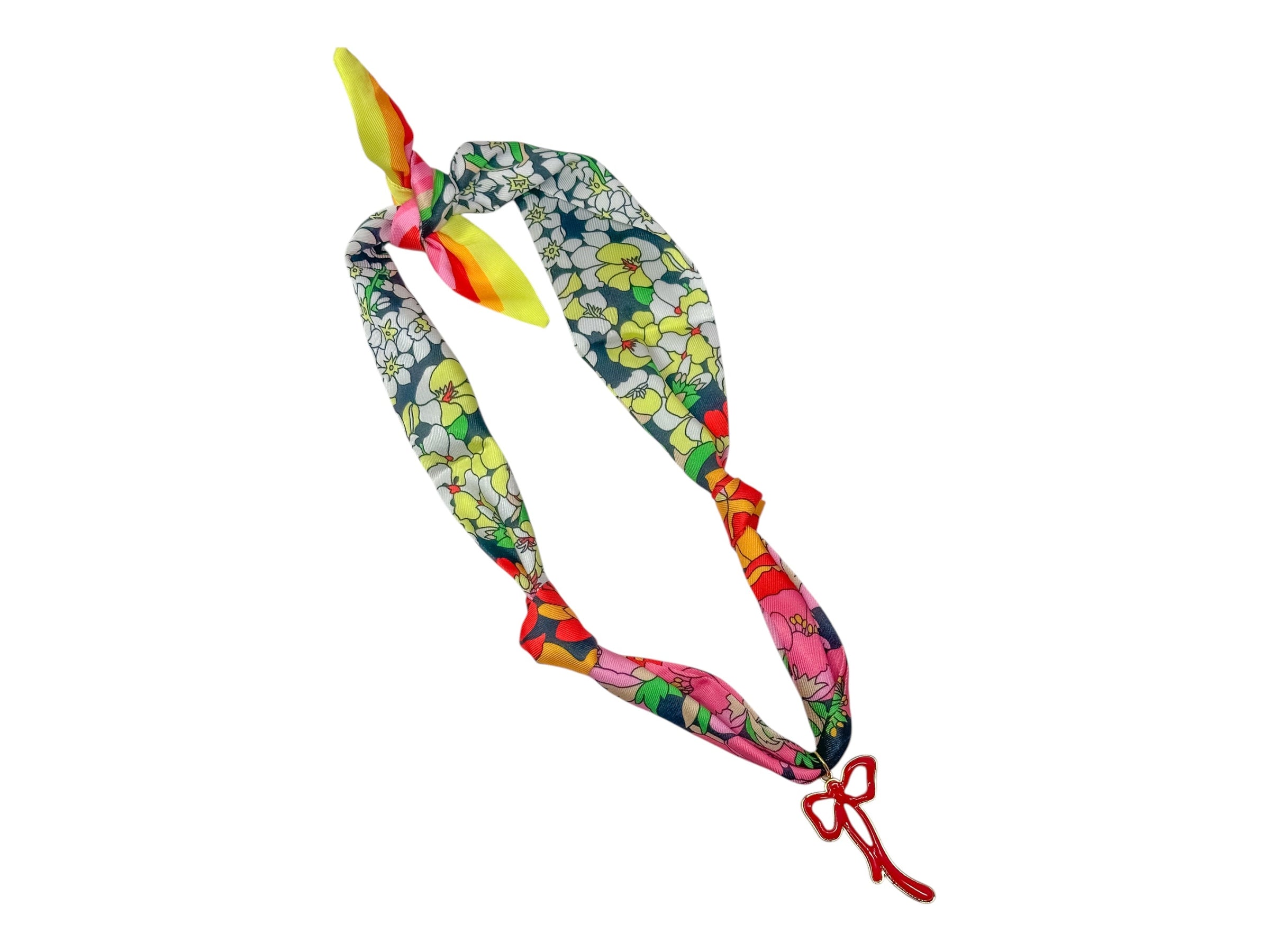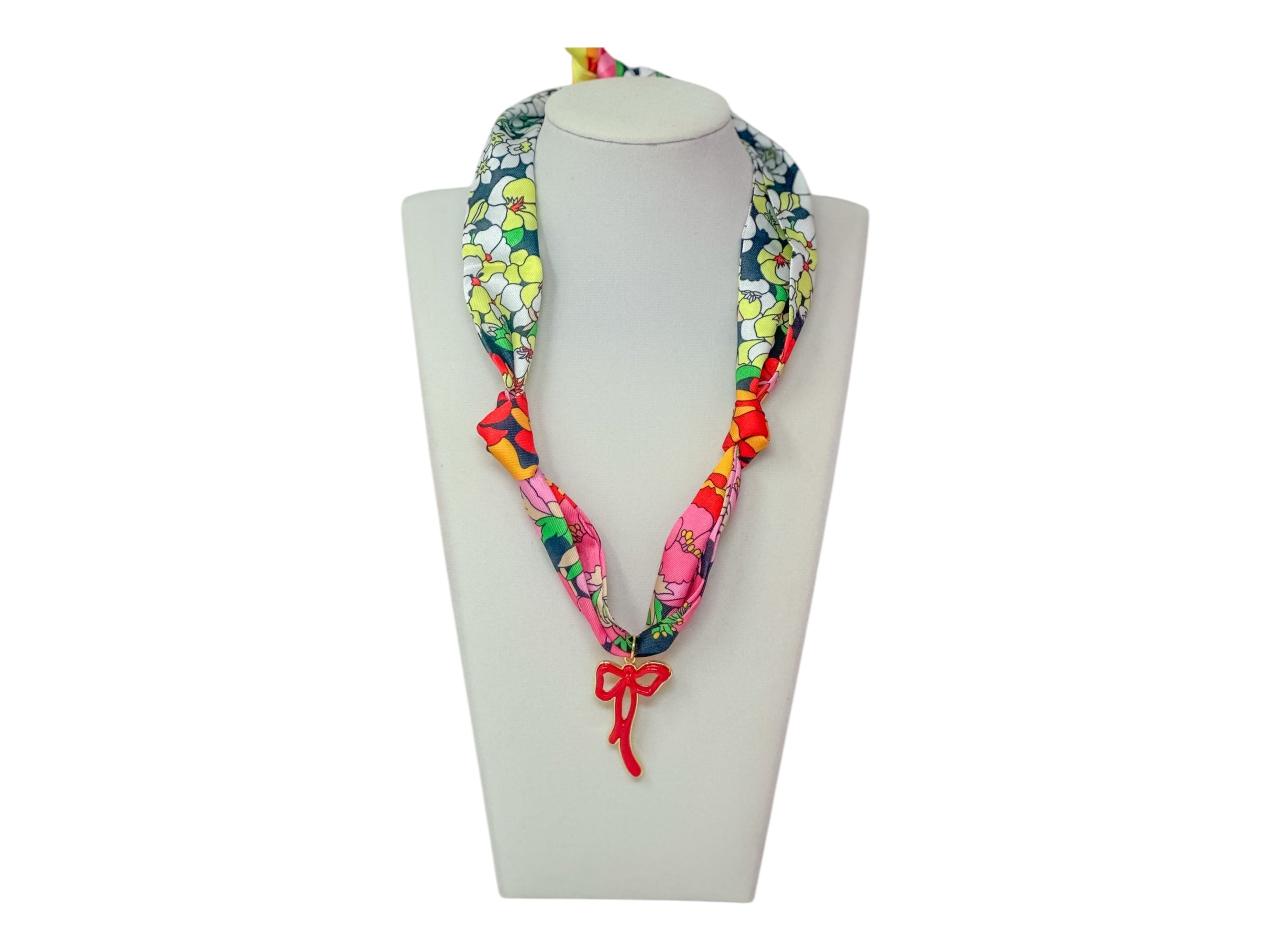 Add a playful pop of charm to your look with the Scarf Charm Necklace in Multi Black with Red Bow. This eye-catching accessory features a vibrant mix of black-toned fabric with multicolored accents, styled like a chic mini scarf. A bold red bow charm takes center stage, adding a fun and festive flair. Lightweight and easy to wear, it’s the perfect statement piece to tie together your outfit—literally and figuratively. Style it with your favorite tee or dress to instantly elevate your look.