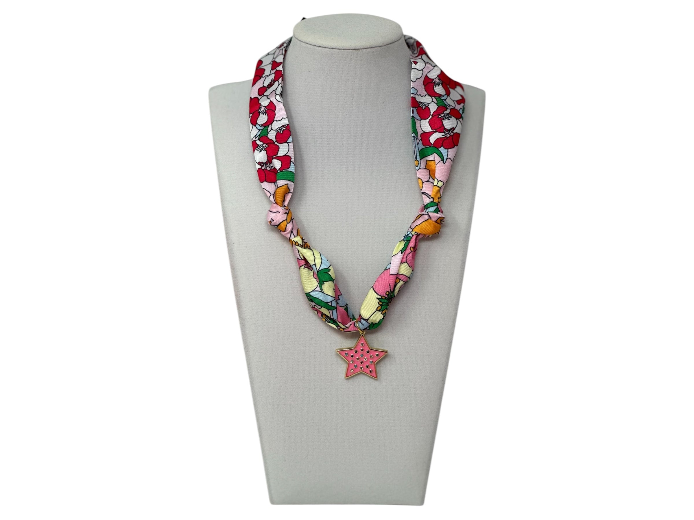 Whimsical and full of charm, the Scarf Charm Necklace in Pink Multi Flowers features a playful pink star pendant that adds a fun, feminine touch. The scarf-inspired design is crafted from soft fabric in a mix of pink floral patterns, creating a sweet and stylish accessory. Lightweight and easy to wear, this necklace brings a pop of personality to any outfit—perfect for layering or standing out on its own.
