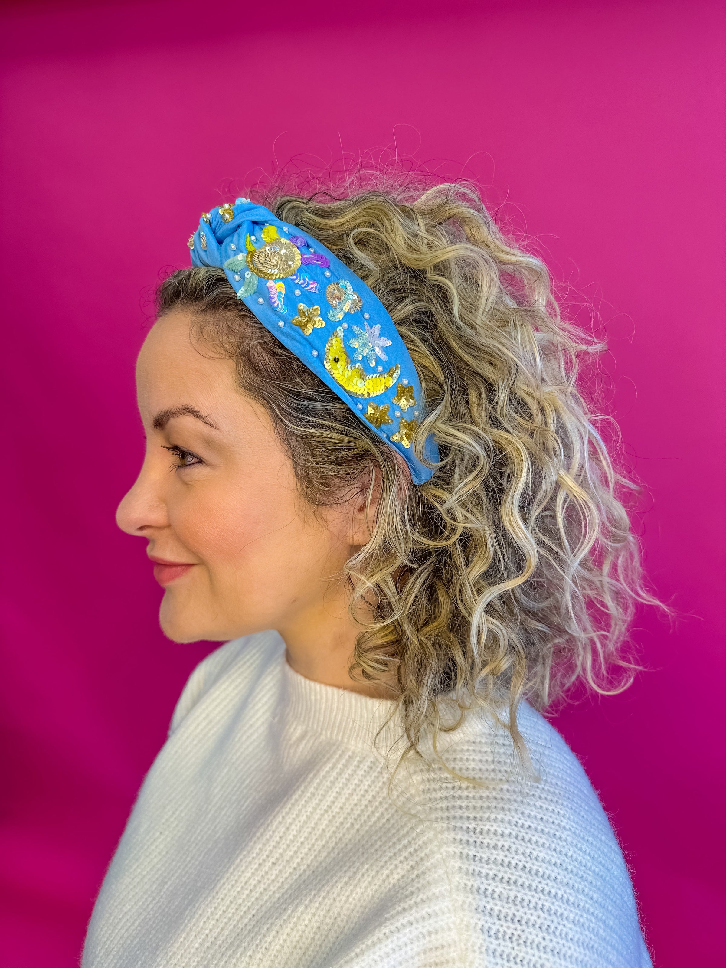 This Sun and Moon headband is so fun to wear throughout the Summer. Embellished with sequin detail. Perfect to pair with a white dress or top.