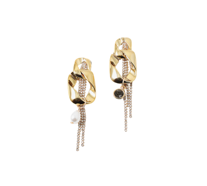These trendy gold earrings add a touch of elegance and sparkle to any outfit. Crafted with a sleek gold finish, each earring is adorned with dazzling rhinestone details that catch the light with every movement. The combination of luxurious gold and shimmering stones creates a bold yet sophisticated look, perfect for dressing up a casual outfit or complementing a formal ensemble. Whether for a night out or a special occasion, these earrings are the ultimate accessory to add a bit of glamour and shine to your jewelry collection.