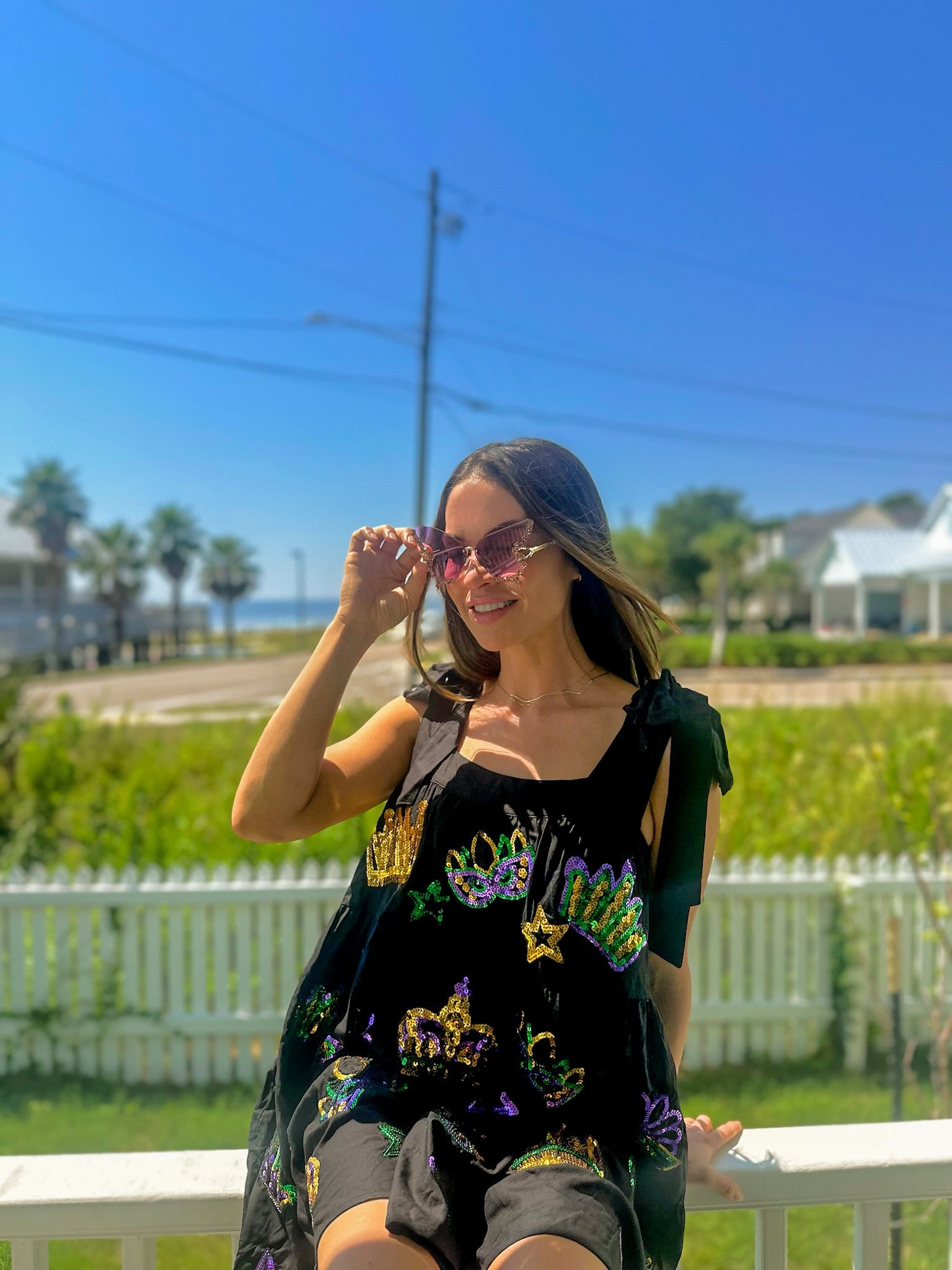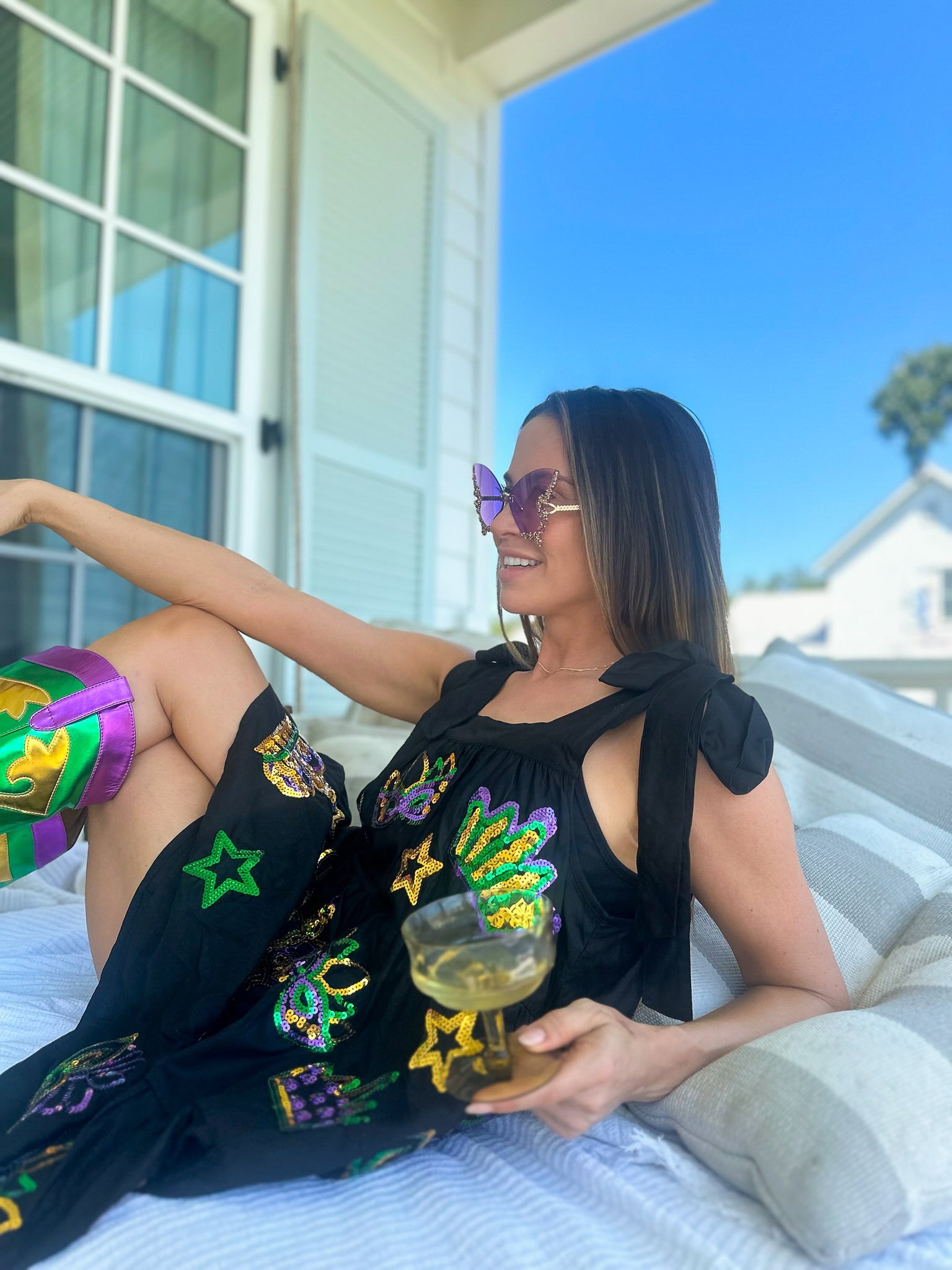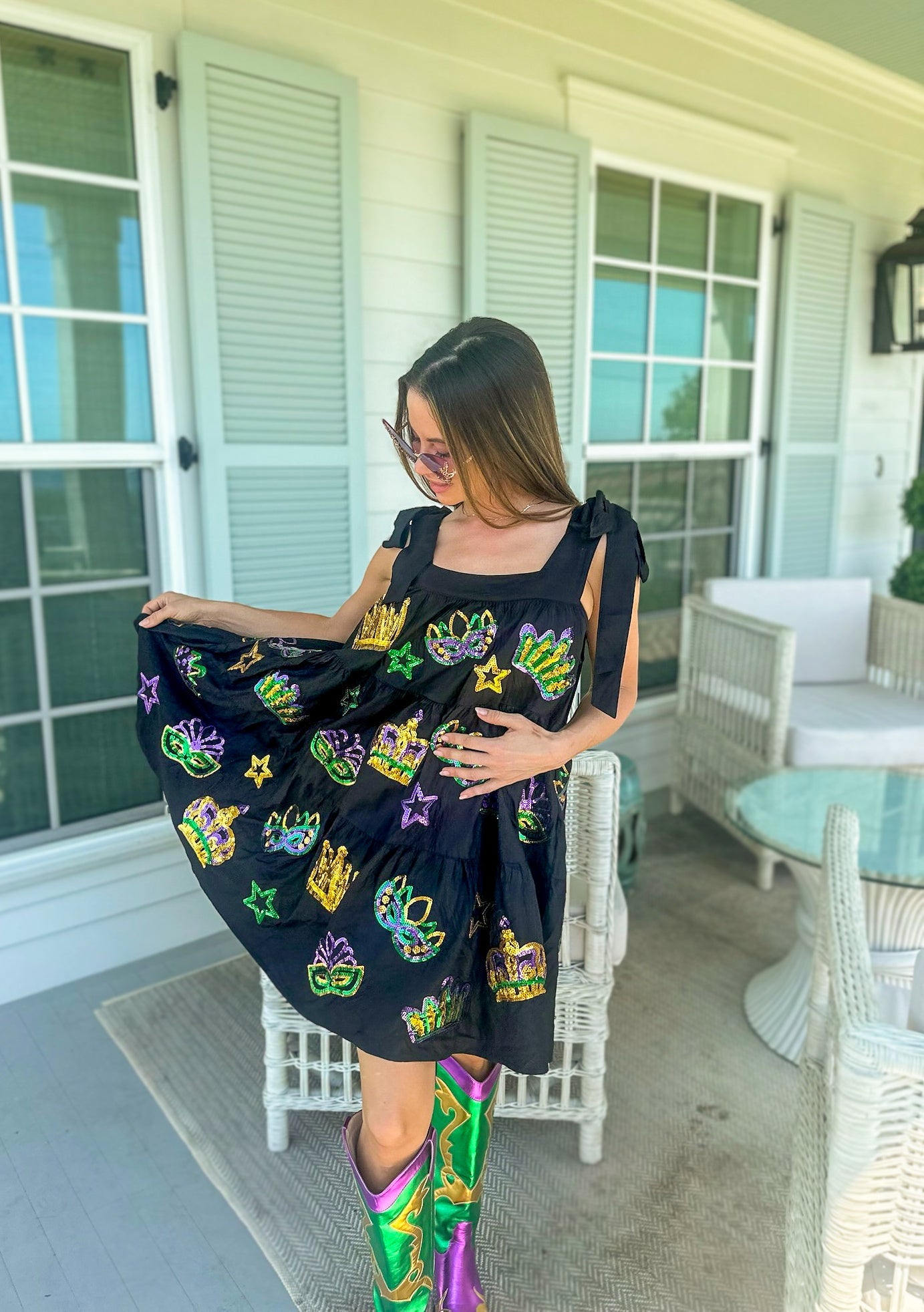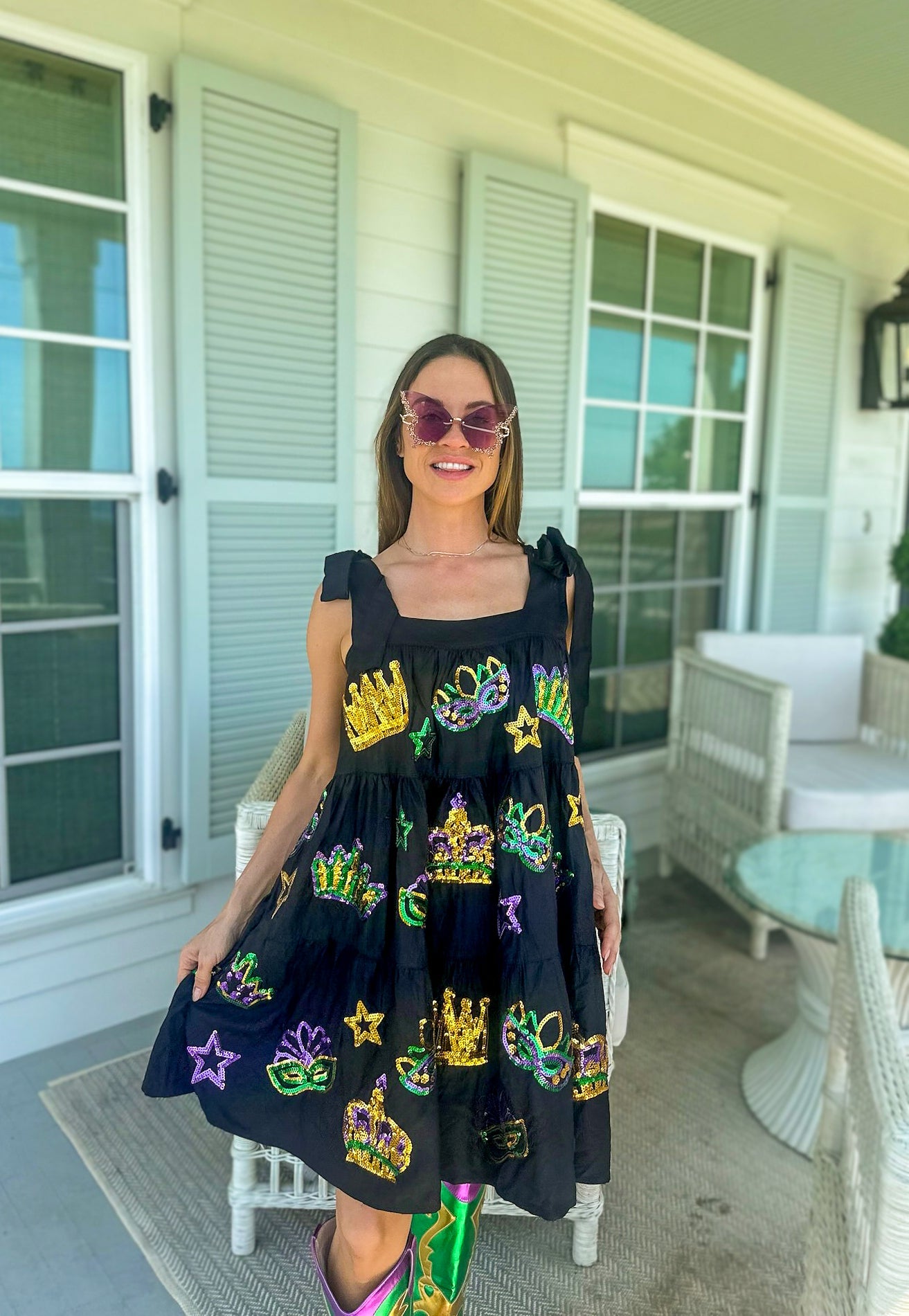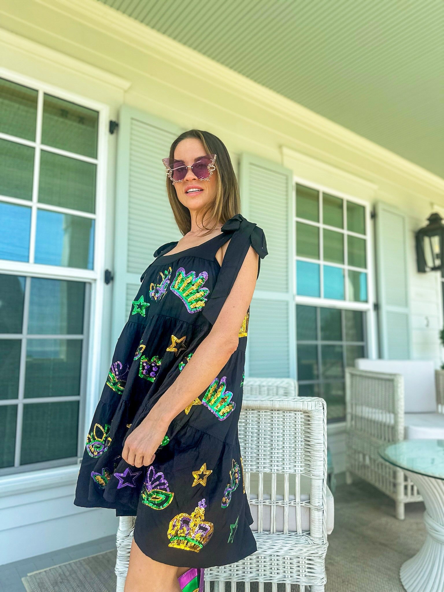 Get ready to celebrate in style with our Adult Crowns and Masks Viscose Dress! This comfortable dress features faux tie straps and side pockets for added practicality. But what really sets it apart is the sequin crowns and masks appliqué on both sides, perfect for adding some playful fun to your Mardi Gras celebrations. Don't miss out on this quirky and eye-catching dress.