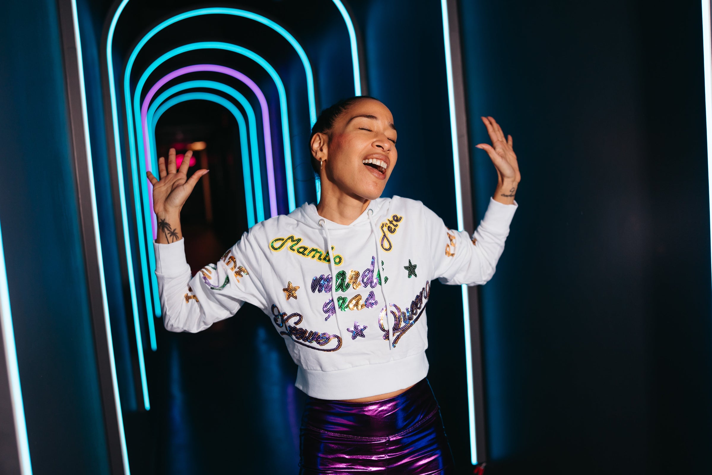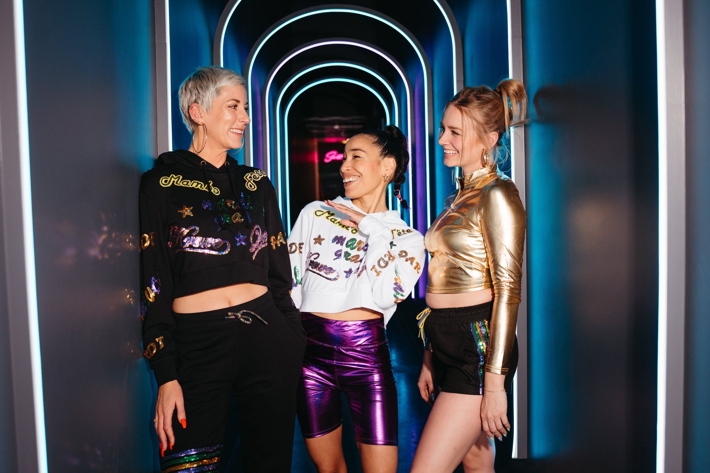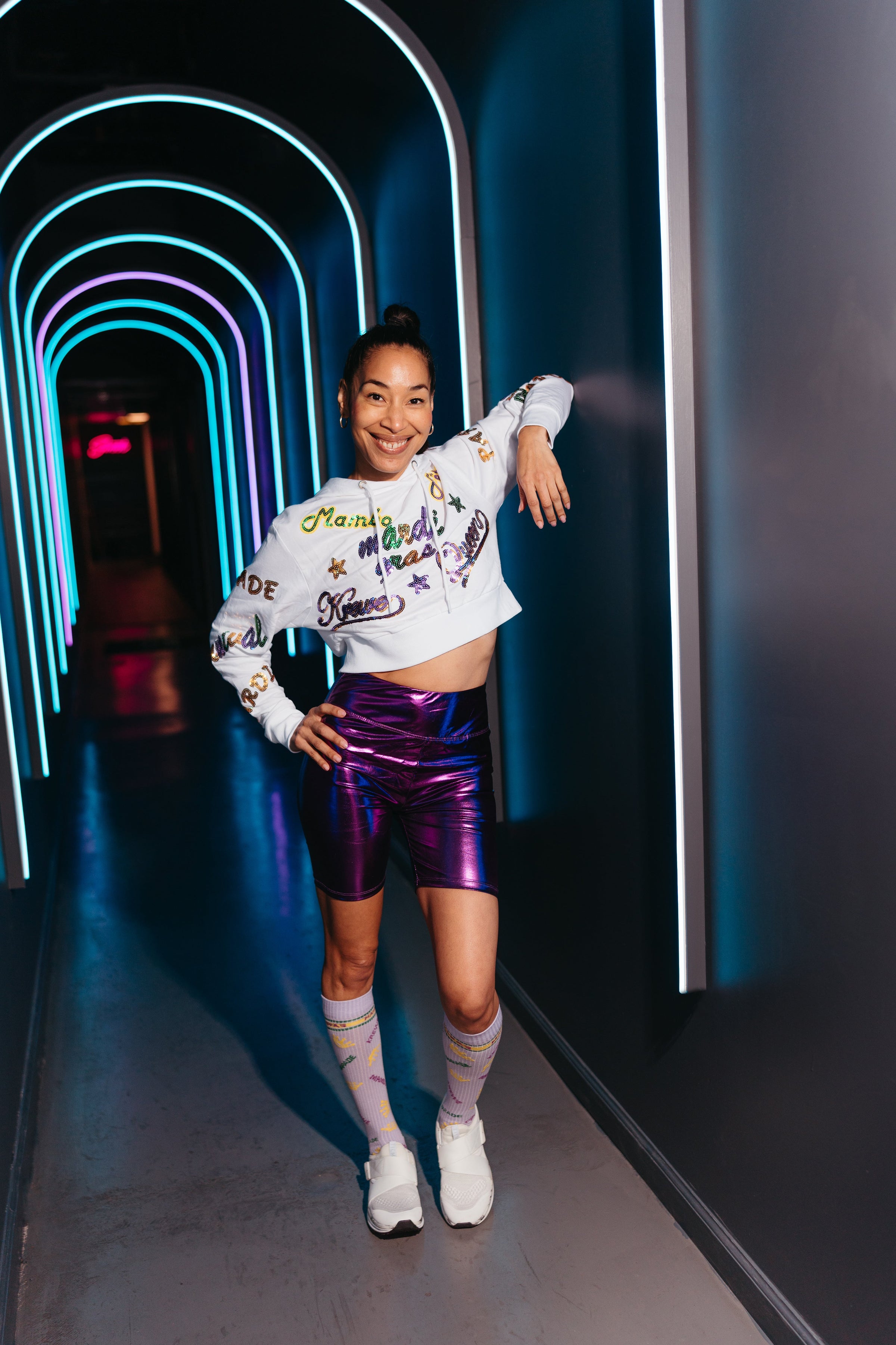 Get ready to party in style with our Adult Mardi Explosion Crop Hoodie in White! Made with soft French terry and adorned with sequin appliqués that say "Krewe," "Queen," "Mardi Gras," "Mambo," and more, this hoodie adds a touch of sparkle to your Mardi Gras wardrobe. Join the fun and show off your festive spirit with this quirky and playful crop hoodie!