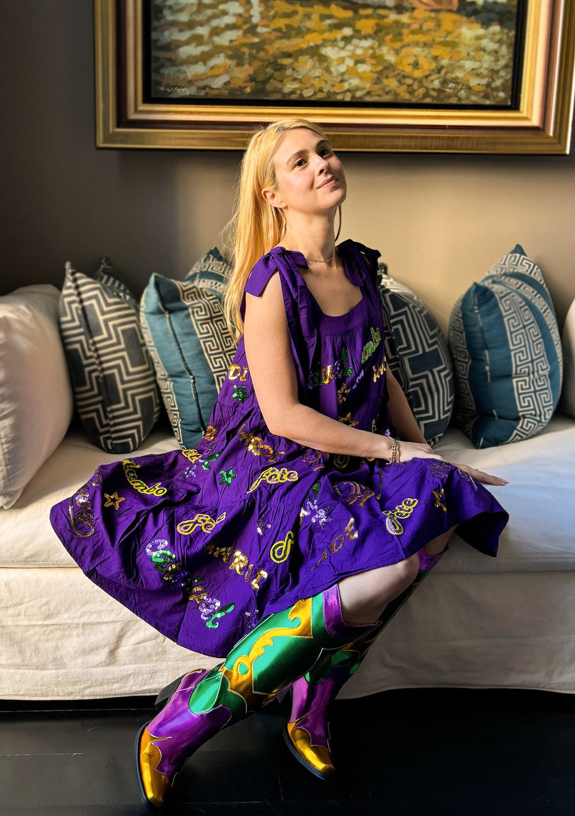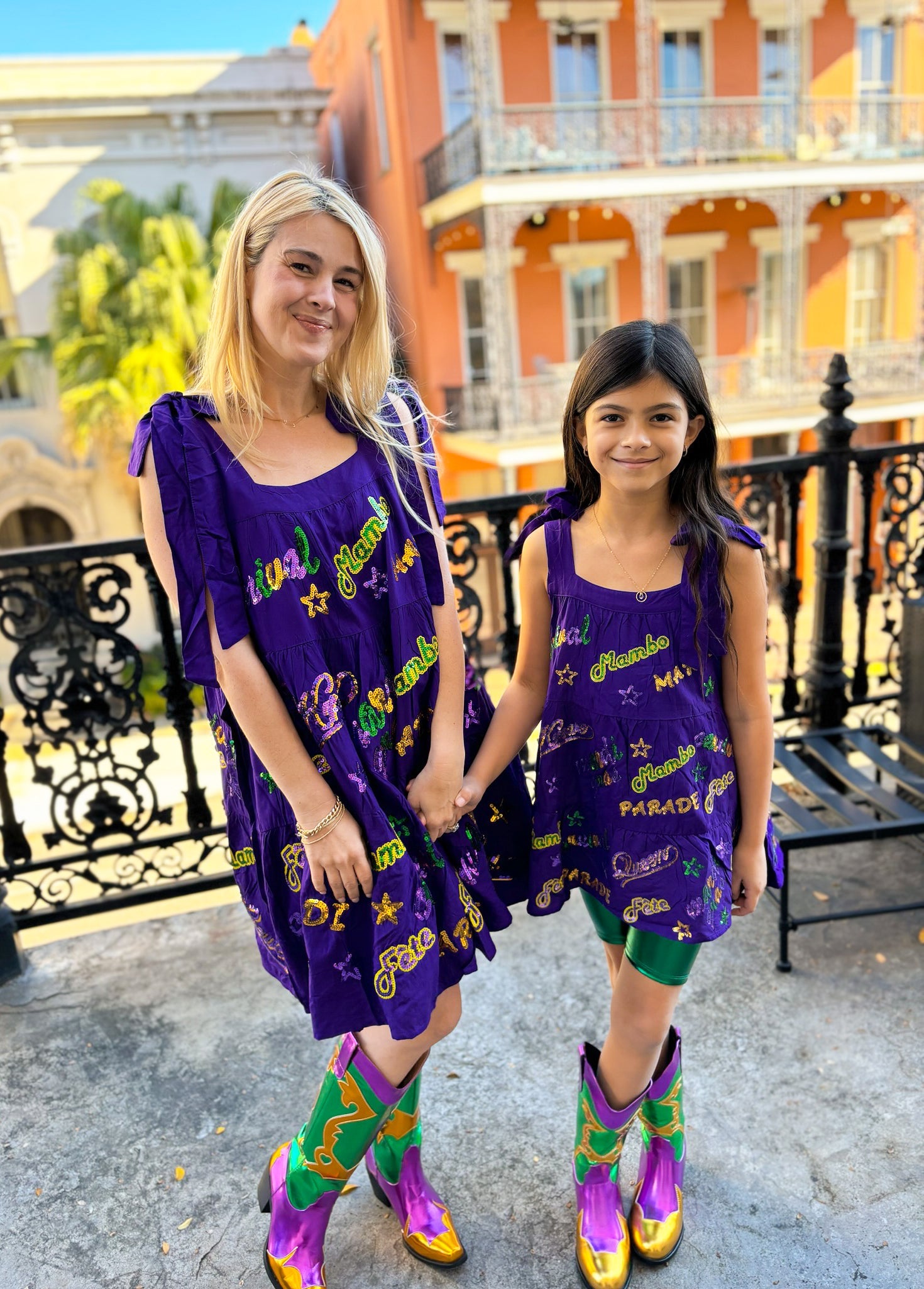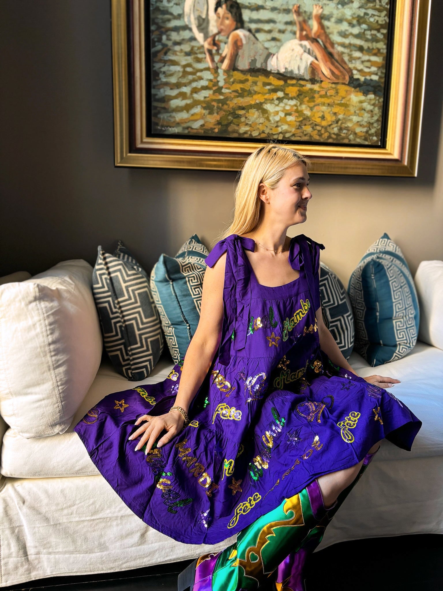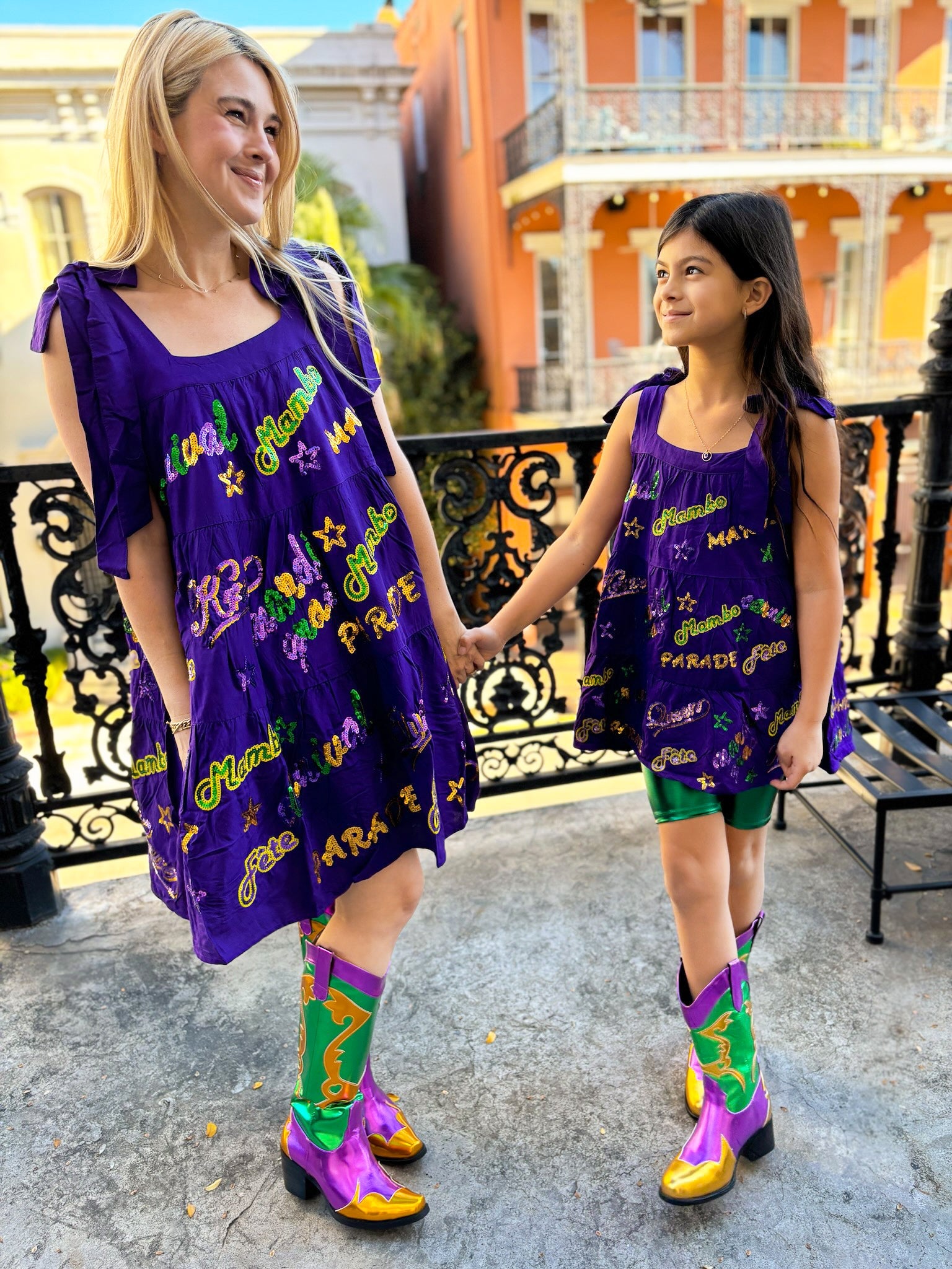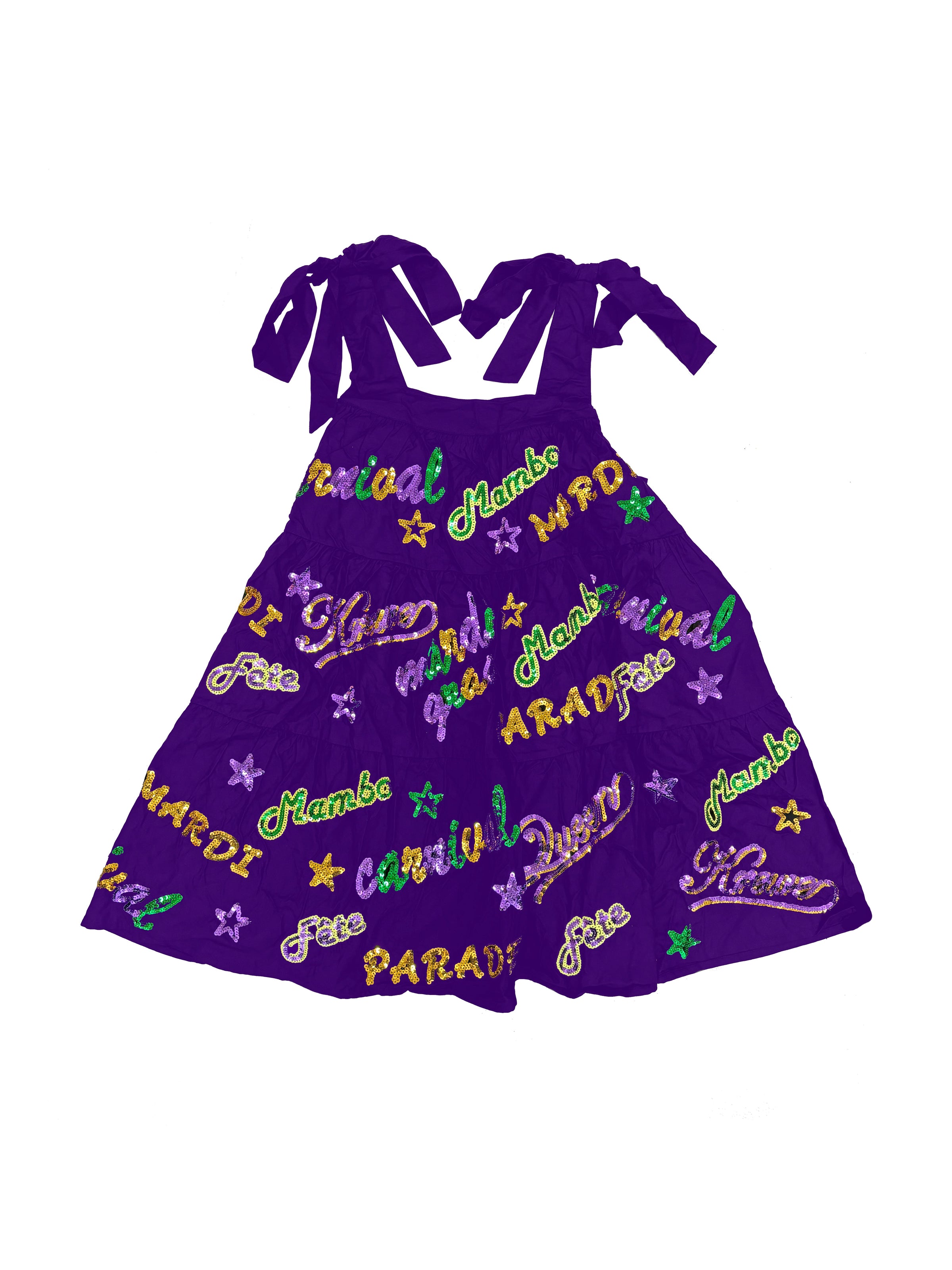 Unleash your inner party animal with our Adult Mardi Explosion Viscose Dress in vibrant purple. With a playful babydoll style, faux tie straps, and convenient side pockets, this dress is perfect for dancing the night away. And the sequin appliqués spelling out Mardi Gras words like Krewe, Mambo, and Parade will make you the center of attention. Let the good times roll!