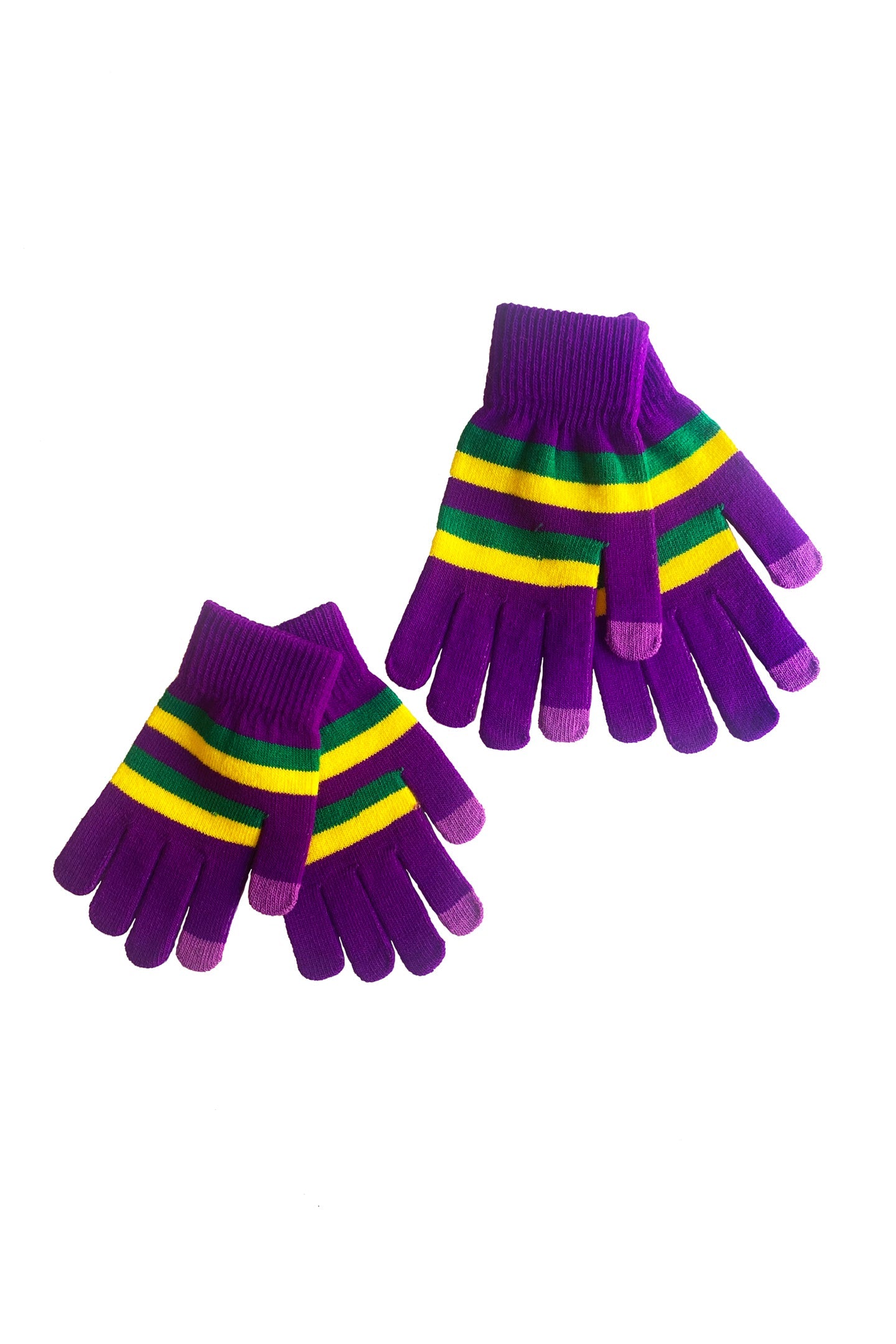 These Adult Rugby Gloves provide tactile protection, featuring a purl knit construction and touch screen capability. The pattern includes a classic winter Mardi Gras rugby stripe in purple, green and gold. Stay warm and connected in the winter months with these stylish rugby gloves.