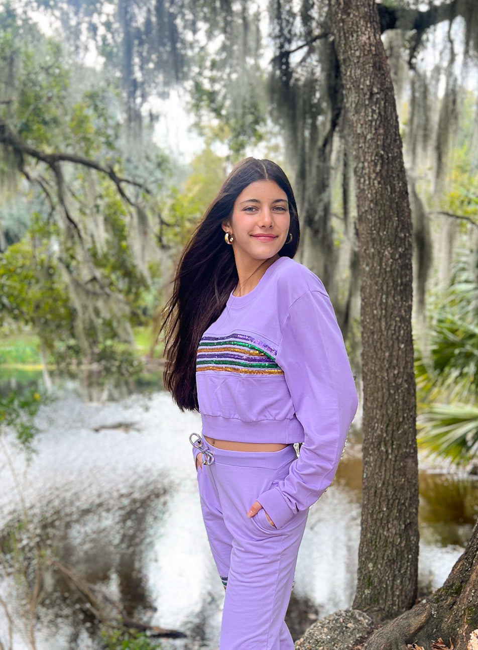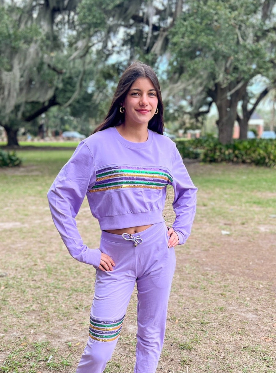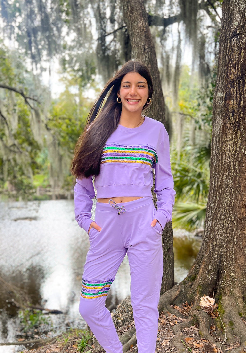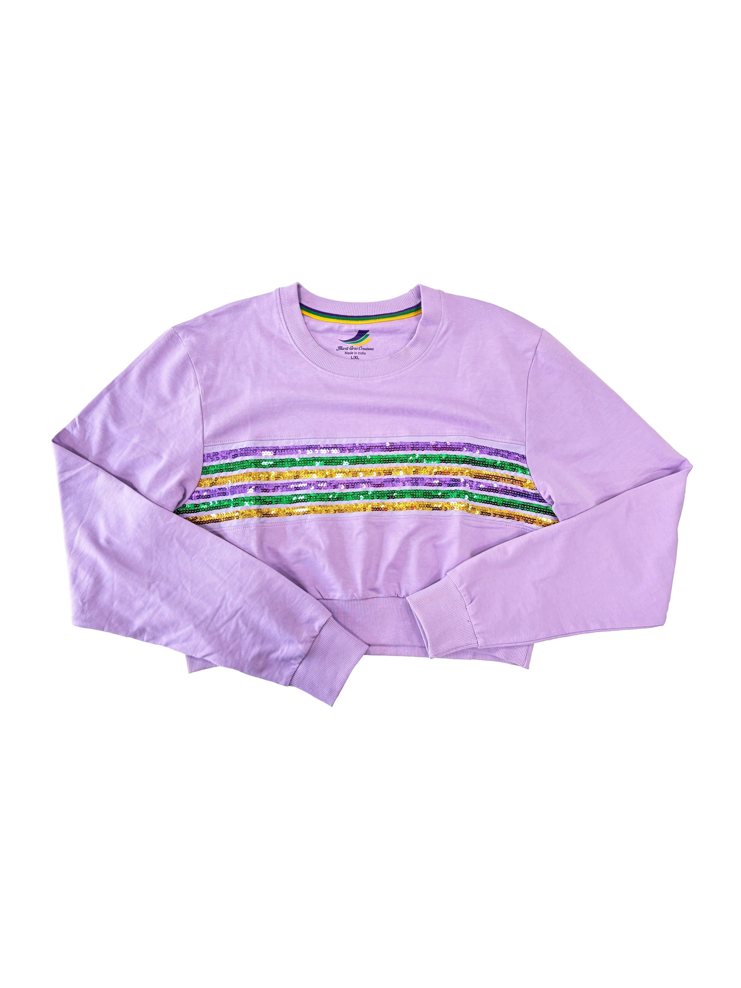 Add some sparkle to your Mardi Gras look with our Adult Sequin Stripes French Terry Crop. Featuring purple, green, and gold stripes, this crop top is perfect for a comfy and stylish celebration. The cropped length adds a playful twist to any outfit and the style pairs perfectly with the matching Lavender French Terry Joggers.