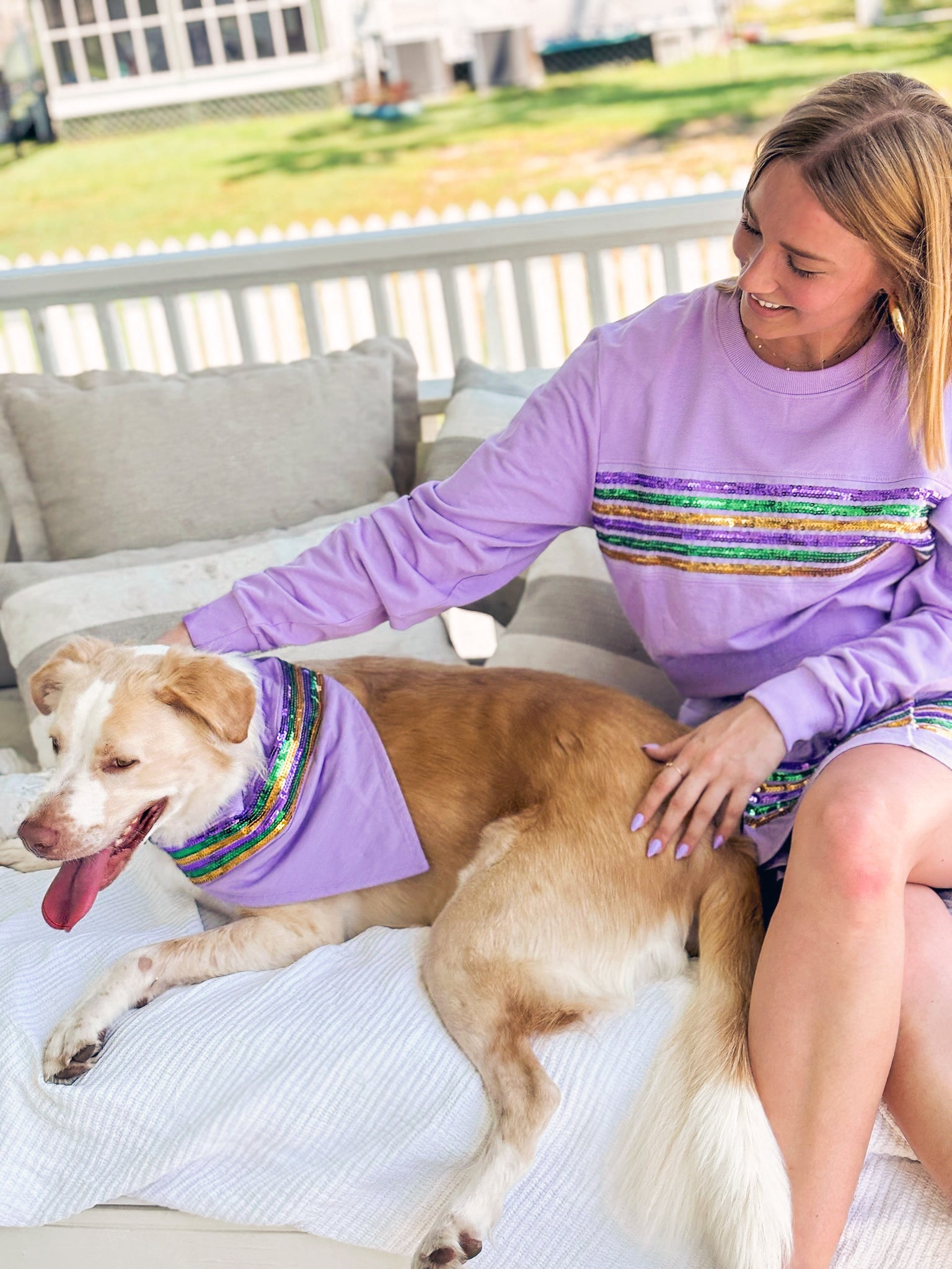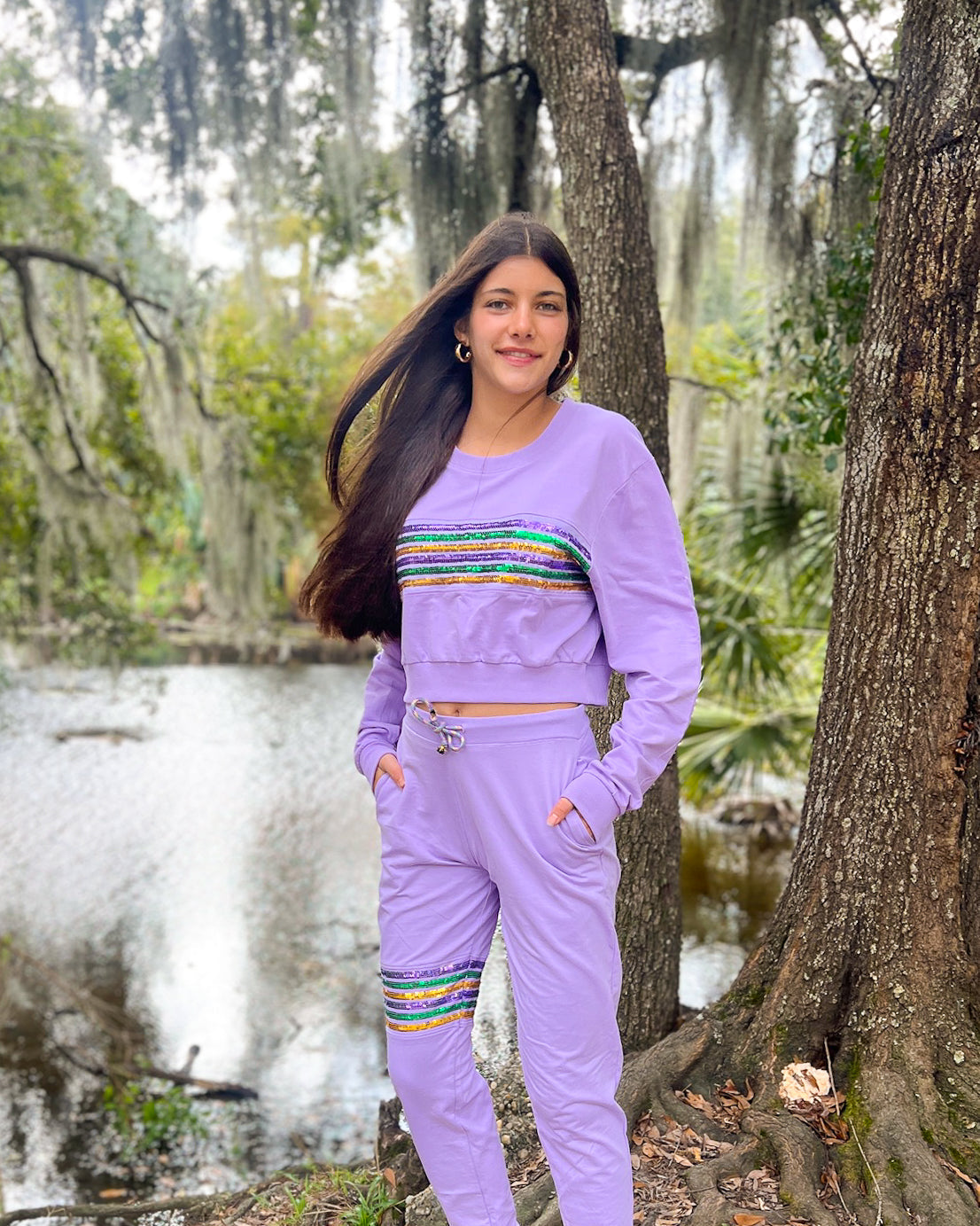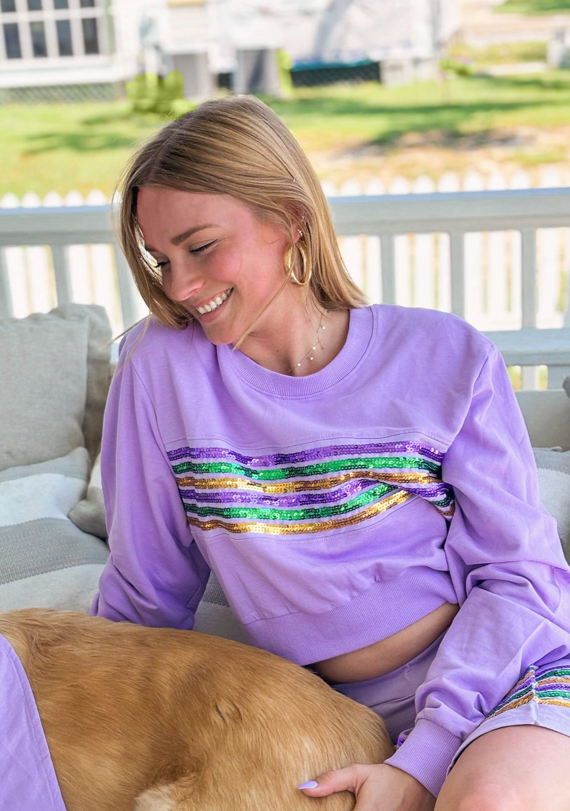 Add some sparkle to your Mardi Gras look with our Adult Sequin Stripes French Terry Crop. Featuring purple, green, and gold stripes, this crop top is perfect for a comfy and stylish celebration. The cropped length adds a playful twist to any outfit and the style pairs perfectly with the matching Lavender French Terry Joggers.