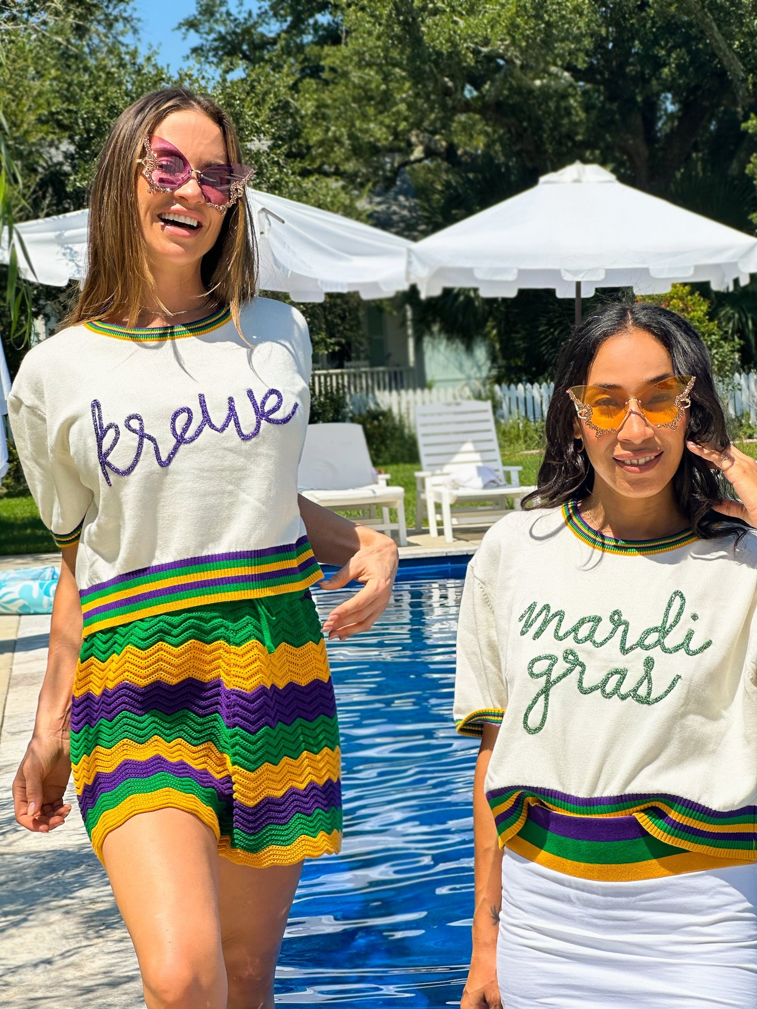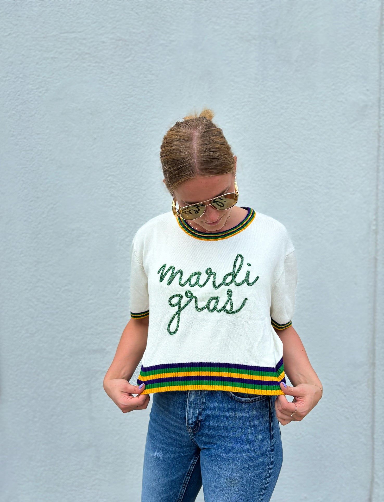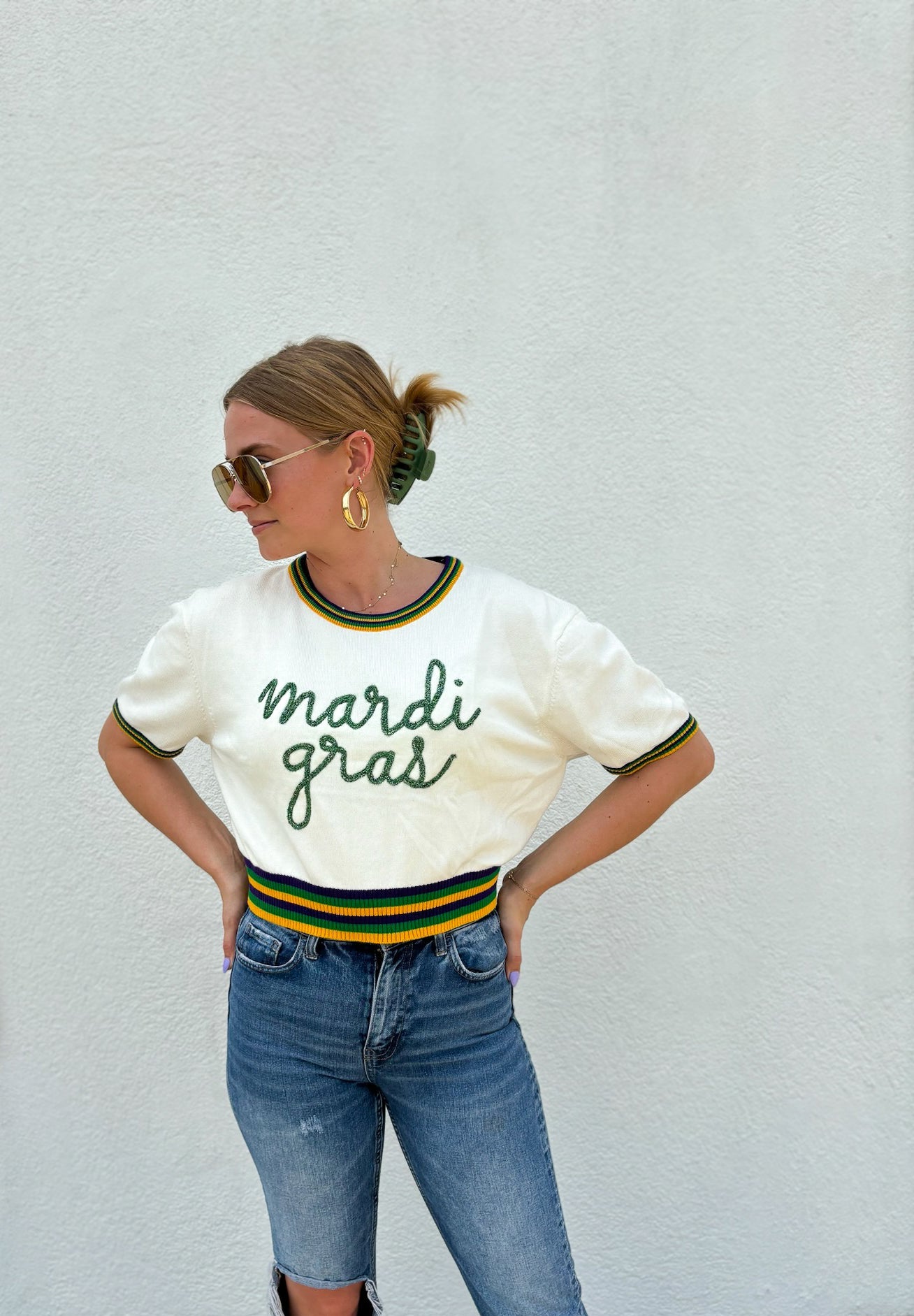Get ready to party with our Mardi Gras Adult Short Sleeve Tinsel Crop! This knit top features purple, green, and gold ribbing on the hem, sleeves, and neck, as well as green glitter tinsel spelling out "Mardi Gras" for a festive touch. Perfect for showing off your Mardi Gras spirit in a playful and stylish way!