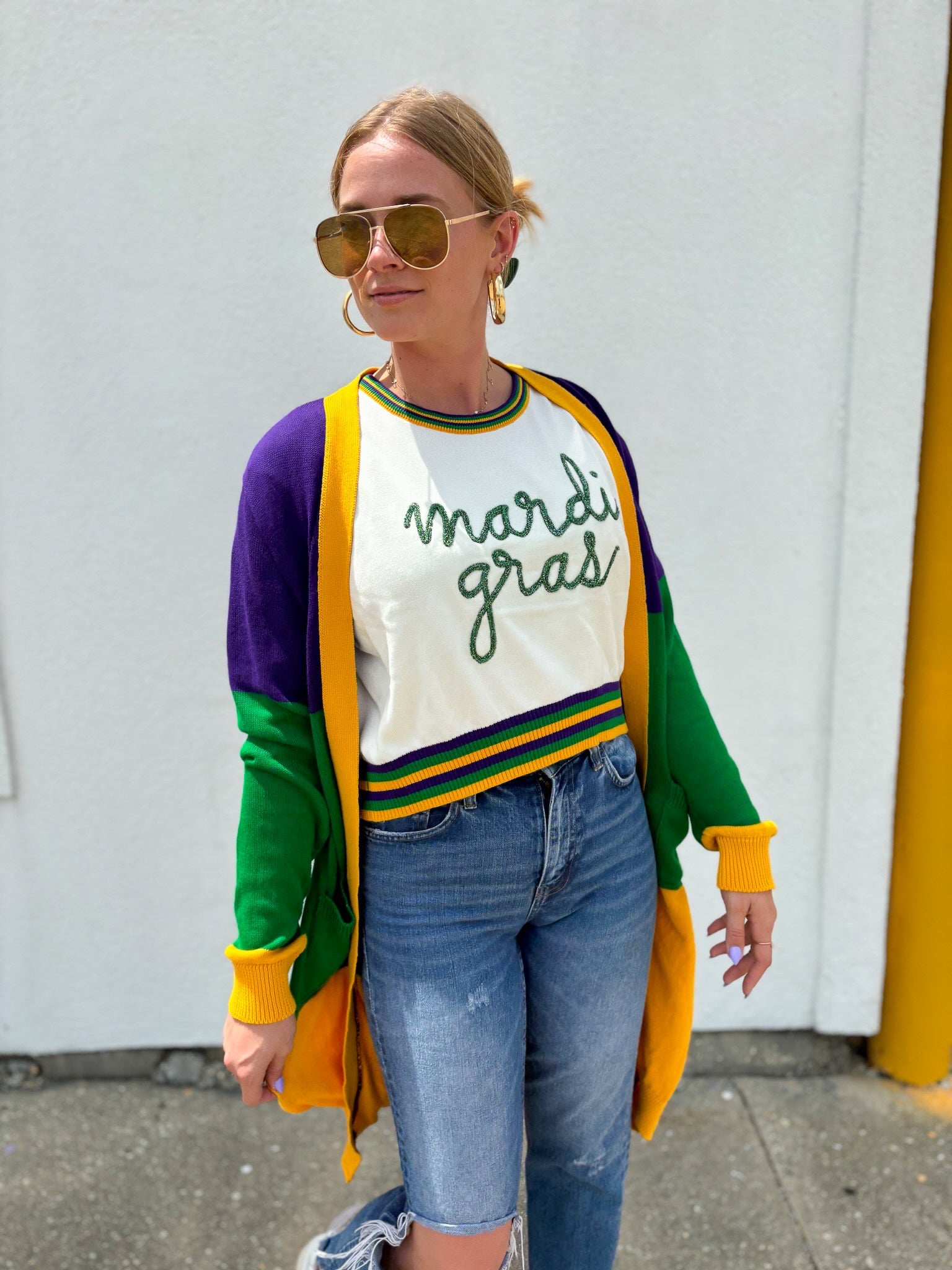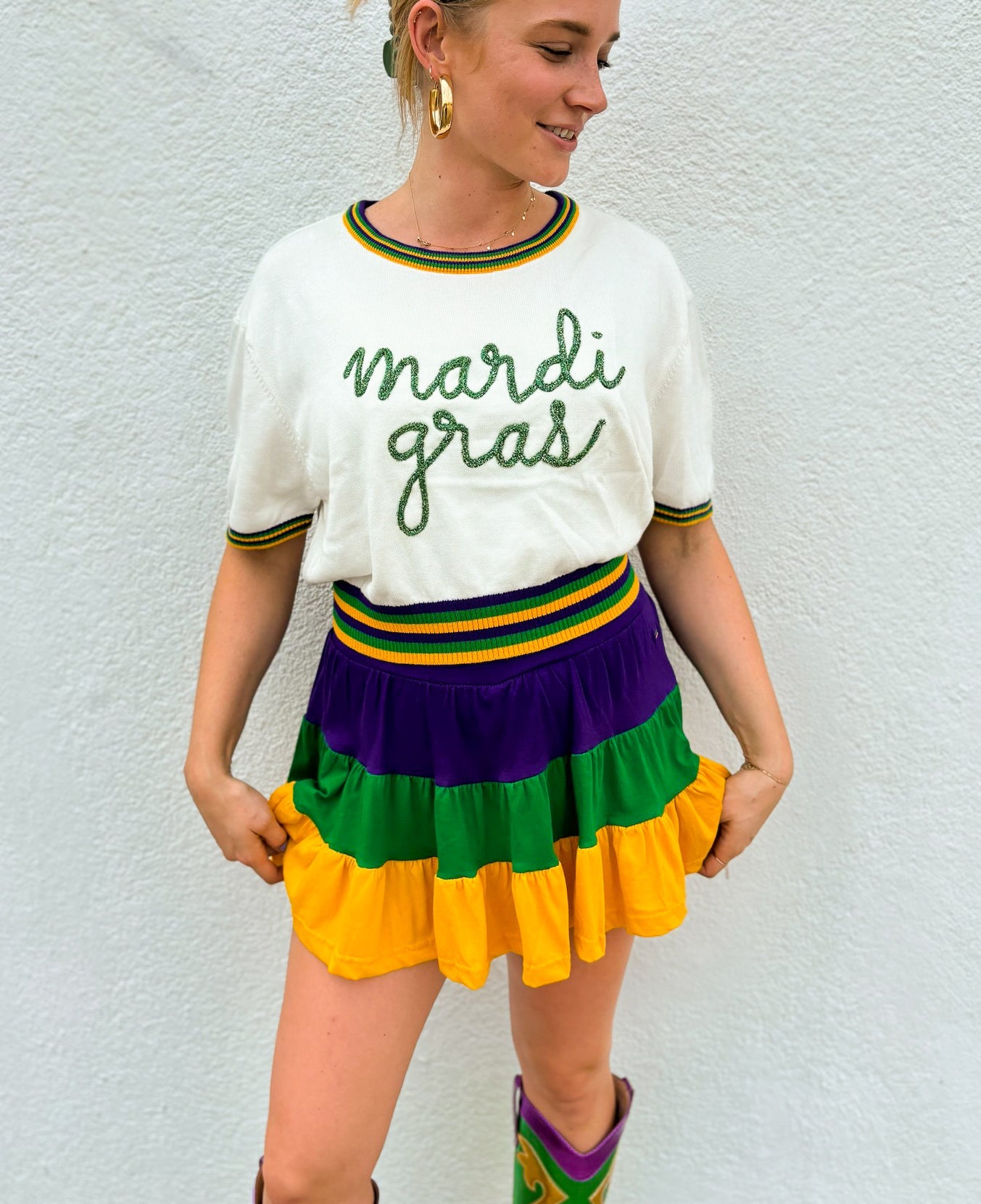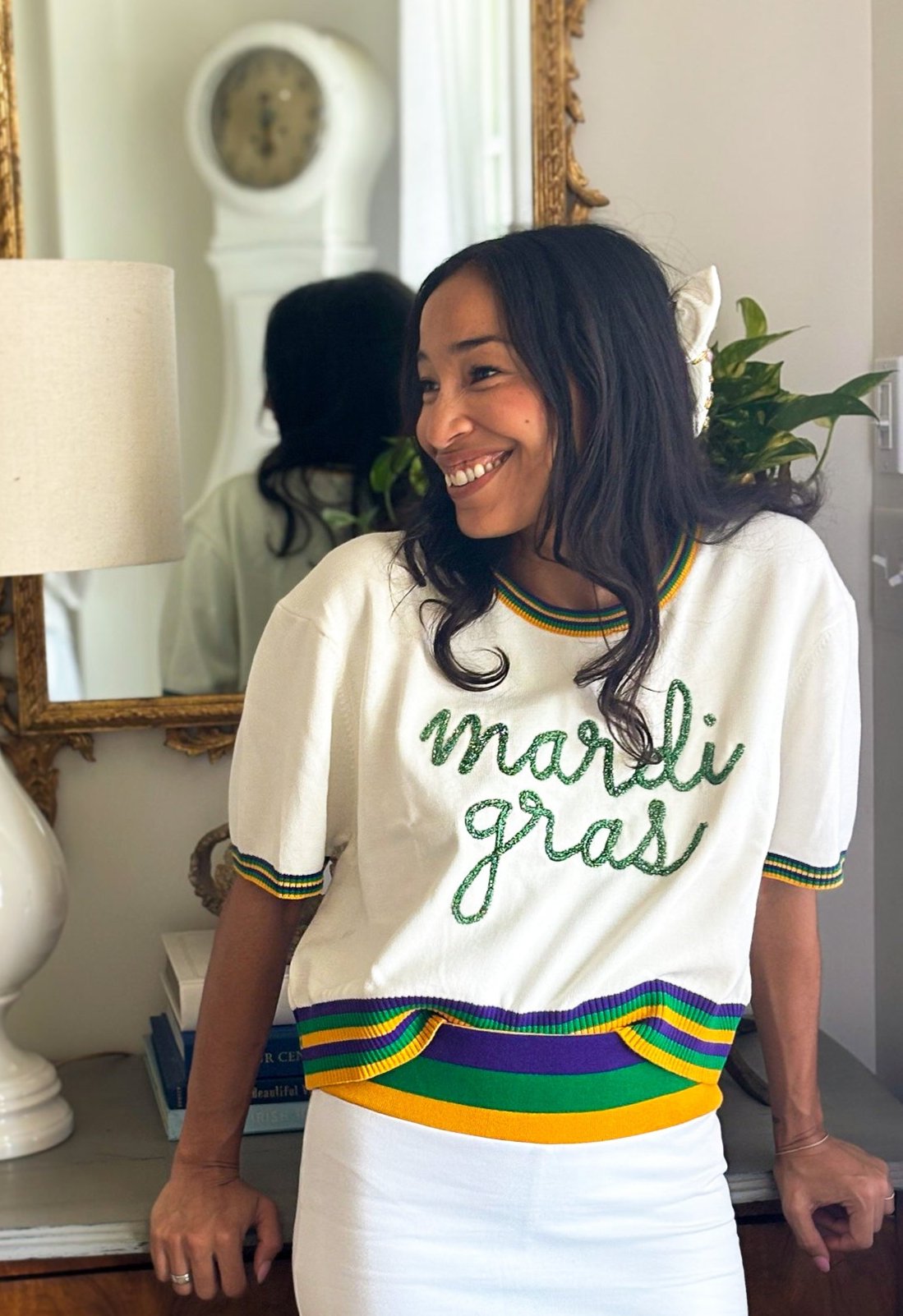 Get ready to party with our Mardi Gras Adult Short Sleeve Tinsel Crop! This knit top features purple, green, and gold ribbing on the hem, sleeves, and neck, as well as green glitter tinsel spelling out "Mardi Gras" for a festive touch. Perfect for showing off your Mardi Gras spirit in a playful and stylish way!