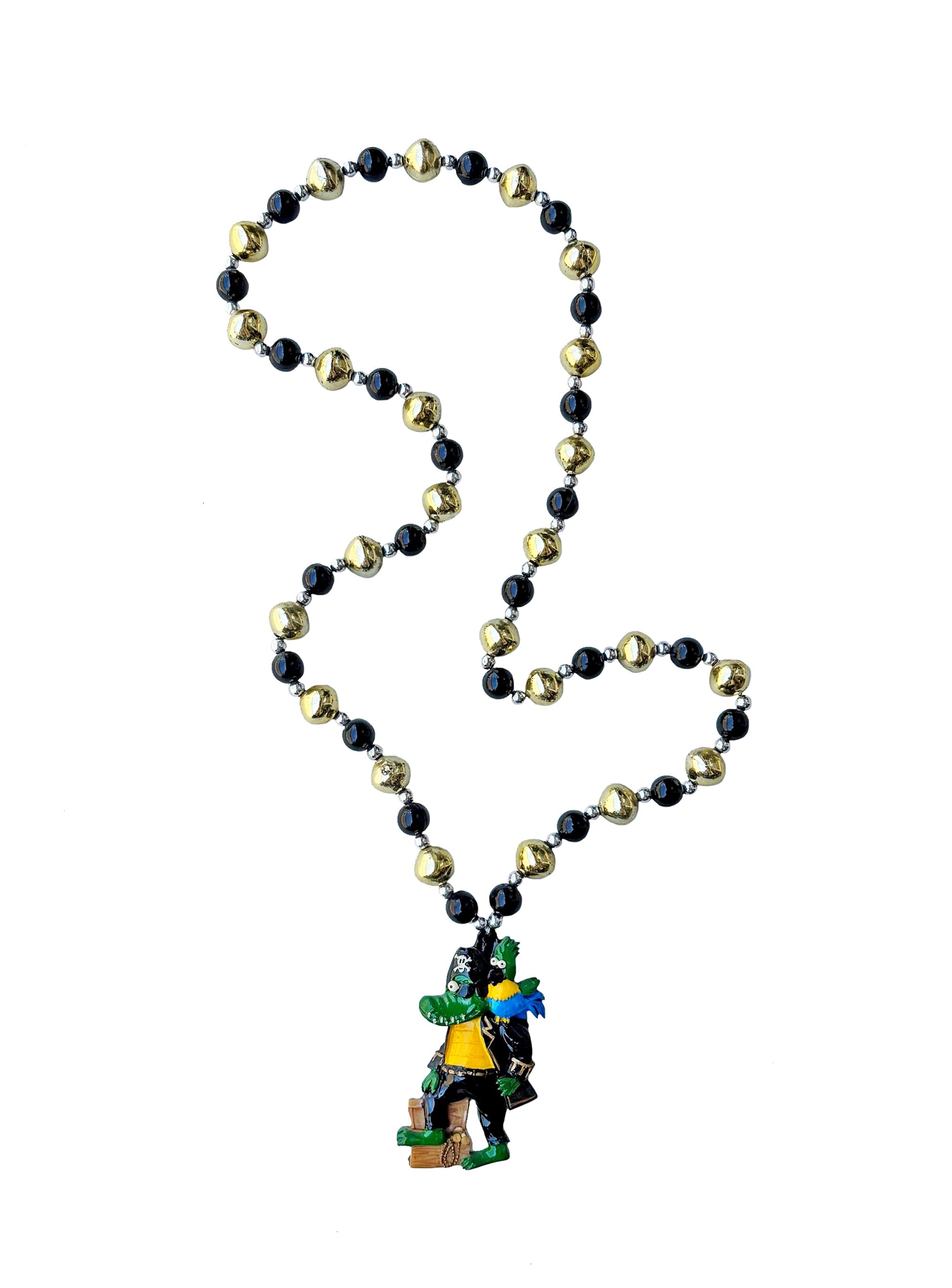 Ahoy, party-goers! Meet our mischievous Alligator Pirate Medallion, the perfect swamp-sailing companion for your Gasparilla adventures! Dangling from striking black and gold specialty beads, this scaly buccaneer brings bayou charm to the high seas of celebration. Watch heads turn as your reptilian rogue steals the spotlight at every parade. Treasure hunting has never been this fun!