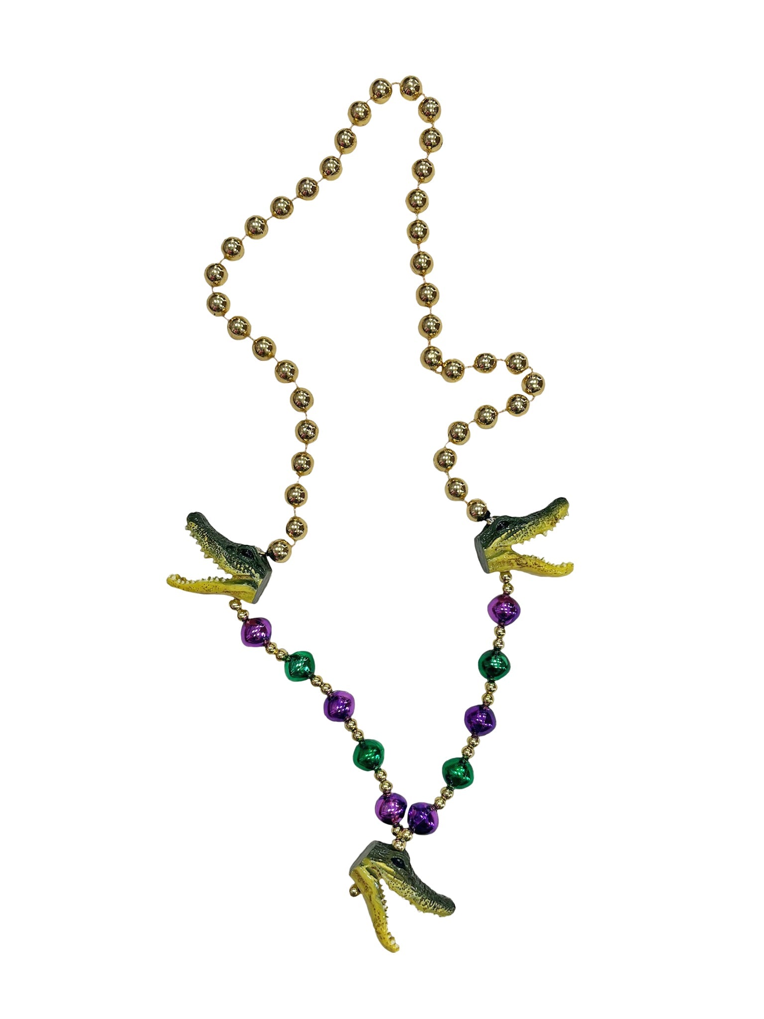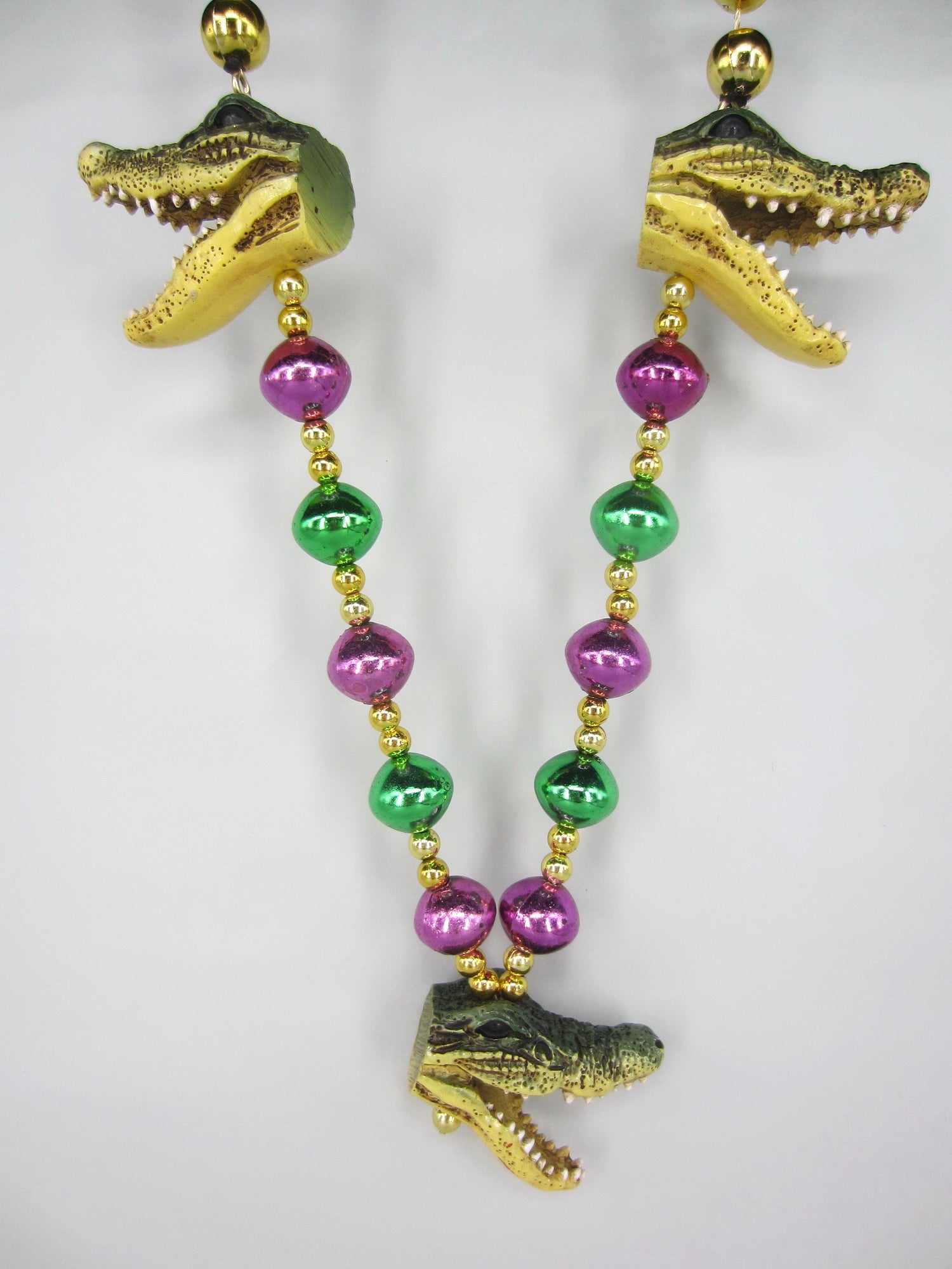Bring a little gator bite to your Mardi Gras celebration with these beads which feature 3 resin alligator heads spaced evenly around the bottom of the 42" long, 12 mm hand strung beads of purple, green, and gold.
