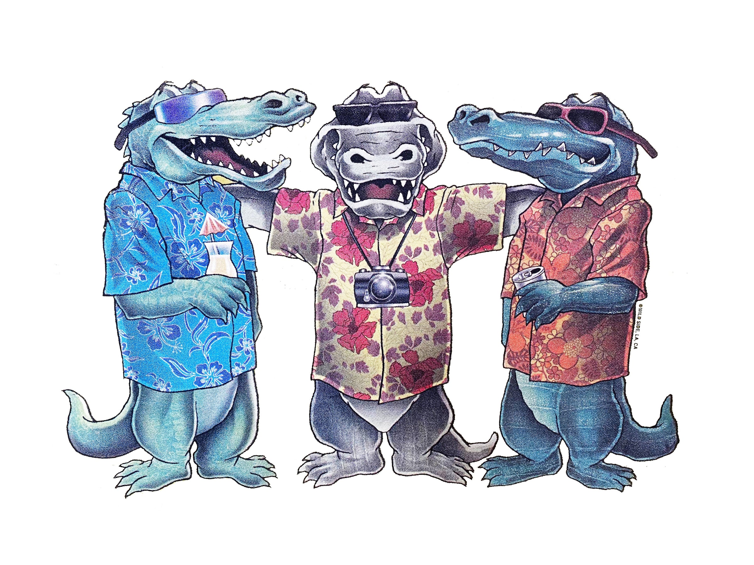 Join these three stylish alligators on a tropical getaway with this trio t-shirt. These fun-loving gators are dressed to impress in their Hawaiian shirts, adding a playful touch to your wardrobe. Perfect for anyone looking for a quirky and unique t-shirt to add to their collection.