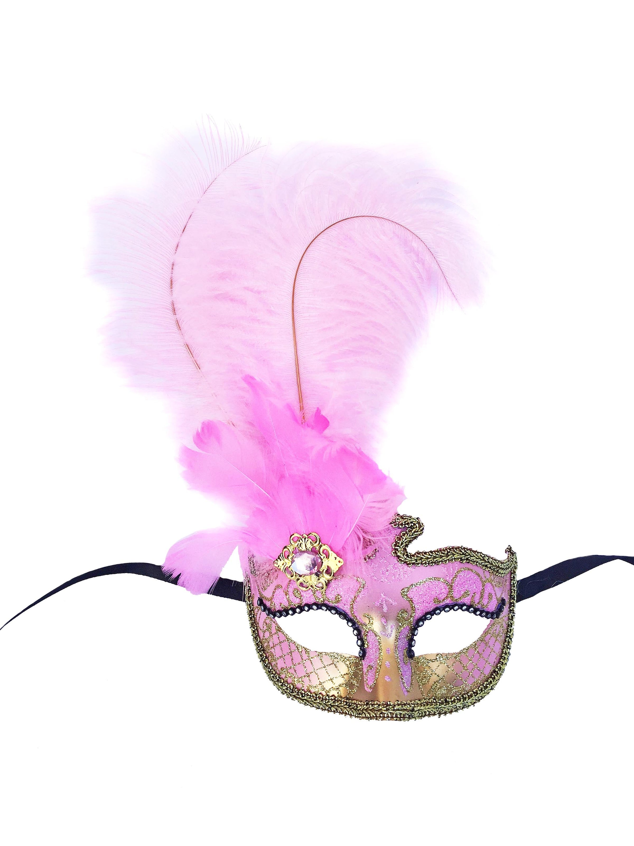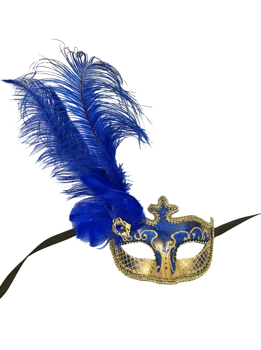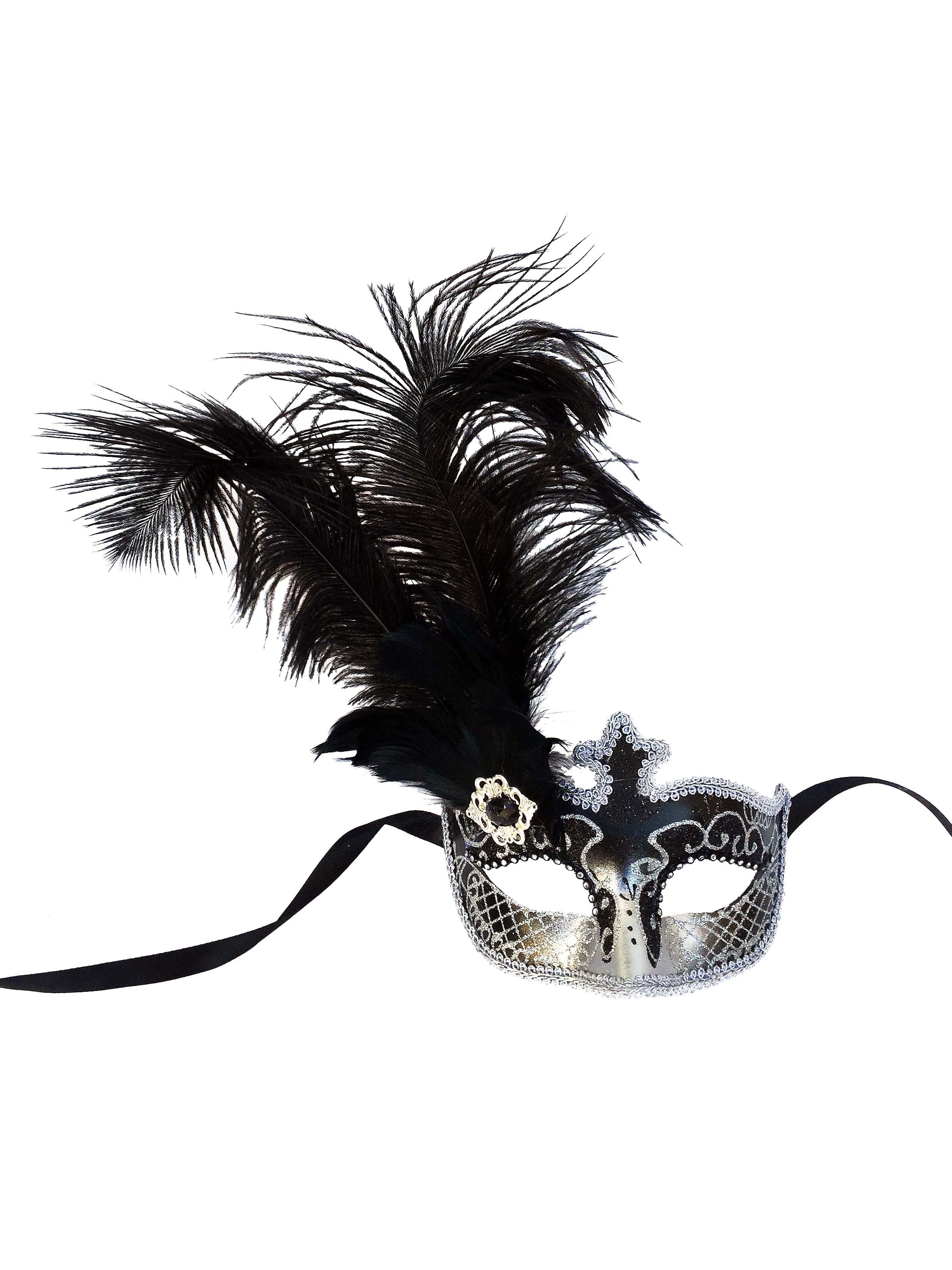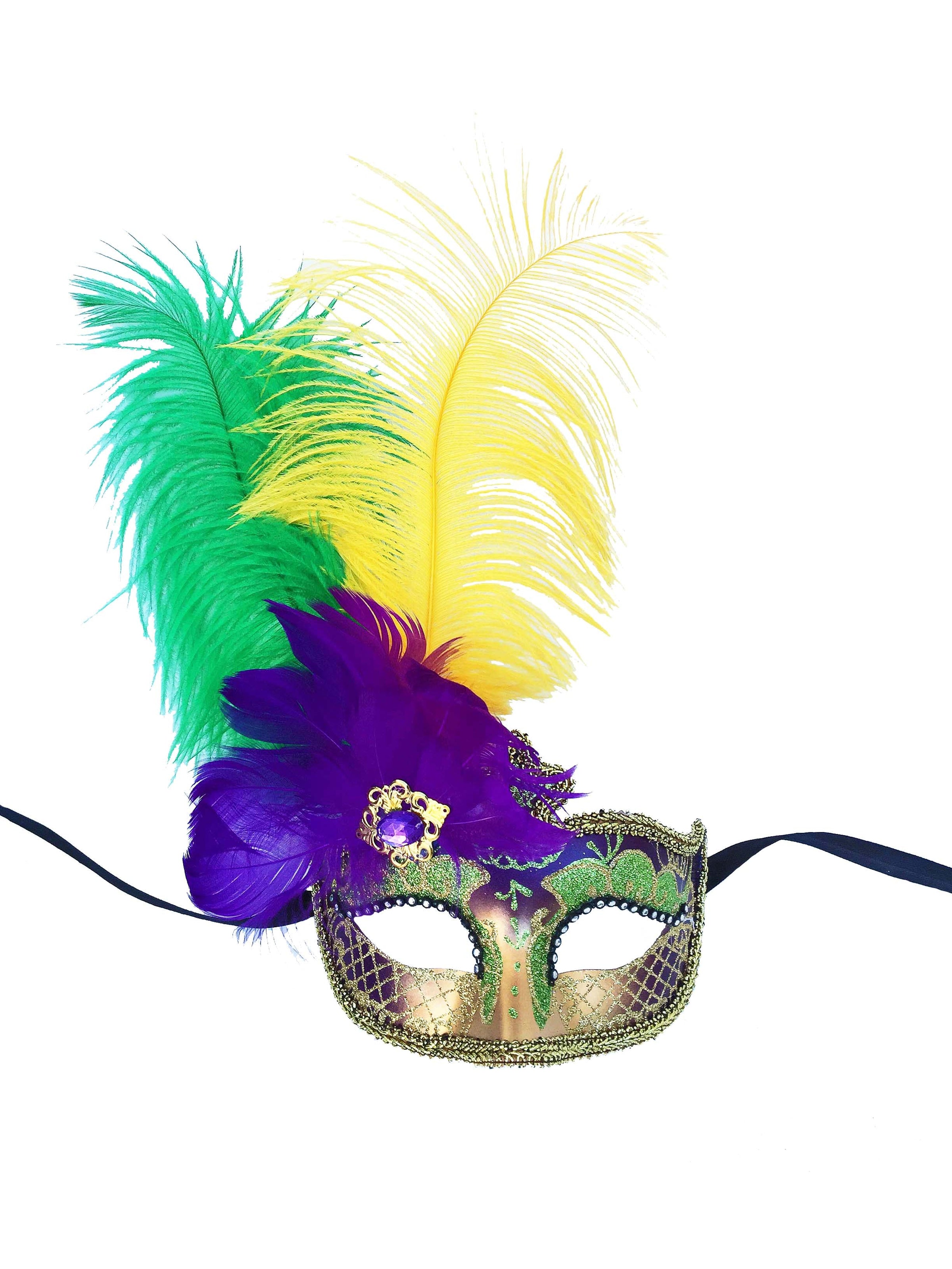 This Anarkali mask has gold or silver glittered accents across the face of the mask done in swirls and criss cross patterns. The eyelet holes are accented with small round gold beads. Each mask comes with 2 large plumes and shorter feathers attached over the right eye with a gold accented jewel matching the color of the mask. Each mask also comes with black ribbons to tie on.