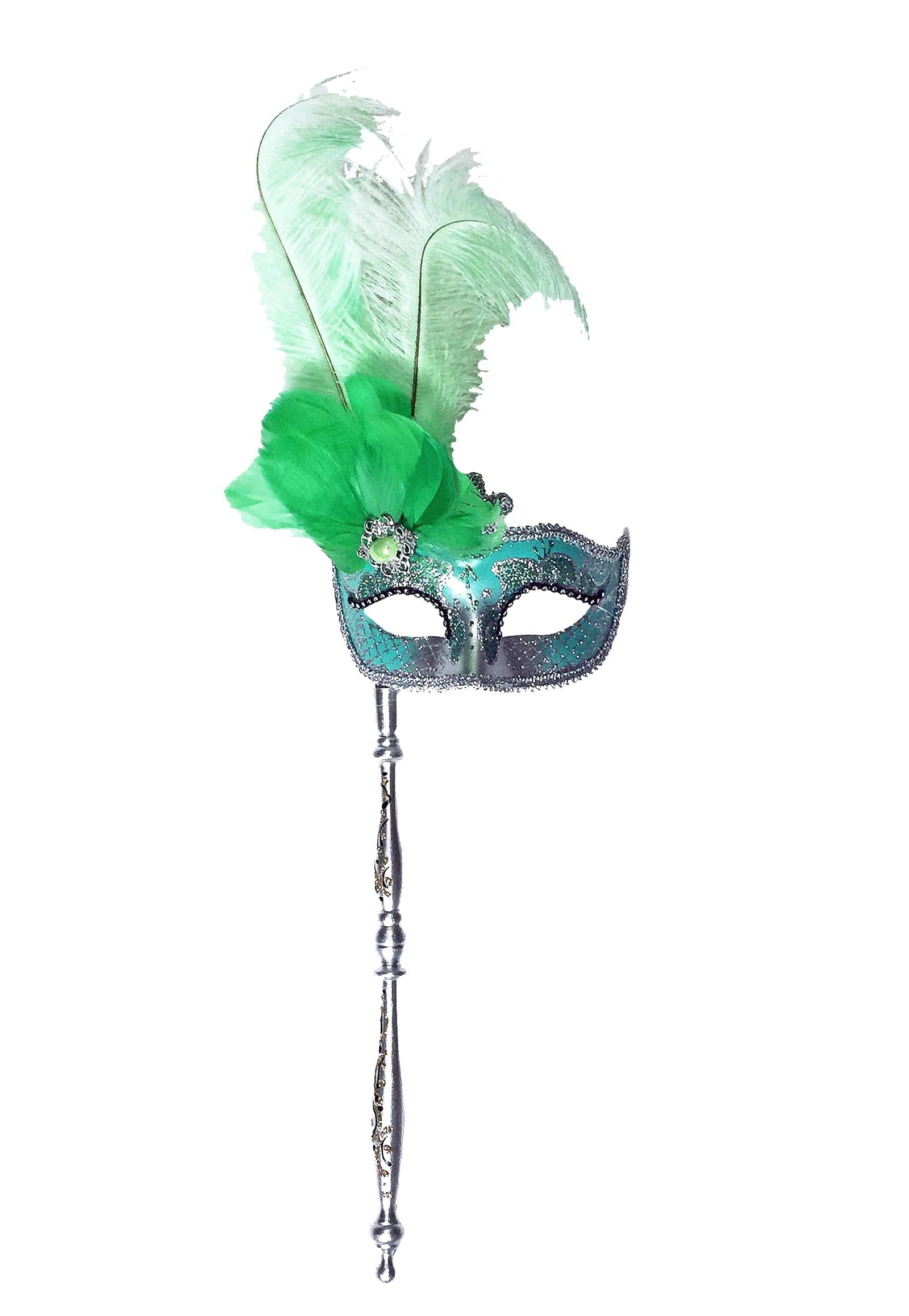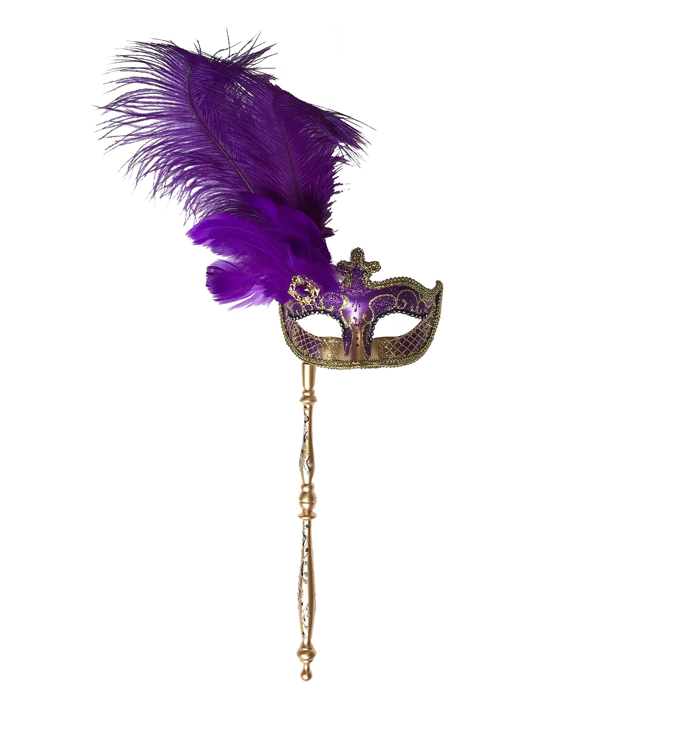 This Anarkali mask has gold or silver glittered accents across the face of the mask done in swirls and criss cross patterns. The eyelet holes are accented with small round gold beads. Each mask comes with 2 large plumes and shorter feathers attached over the right eye with a gold accented jewel matching the color of the mask. Each mask also comes a gold or silver detachable stick that is decorated with matching glitter swirls.