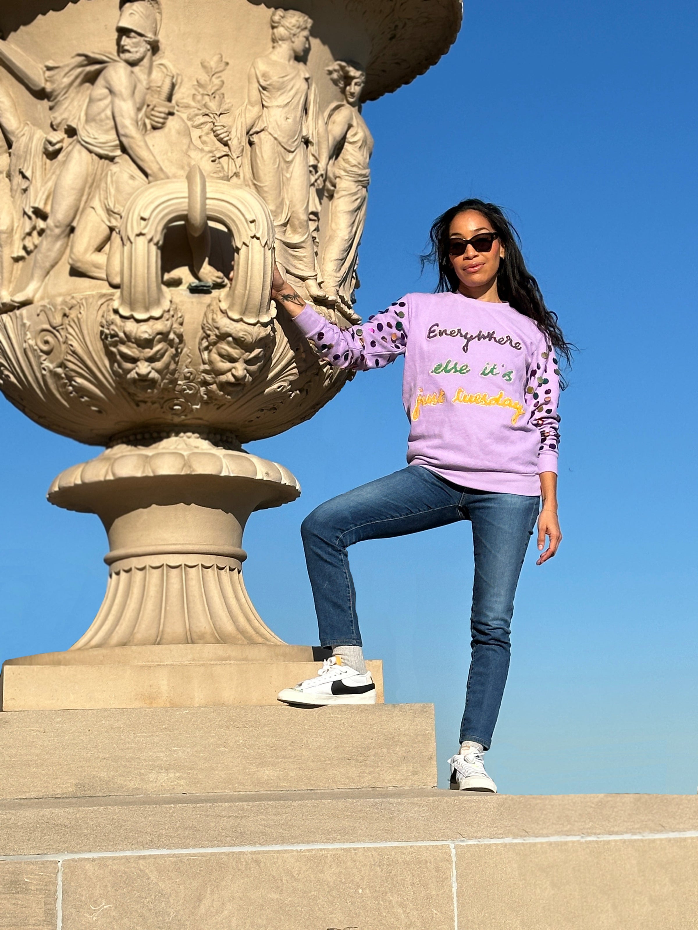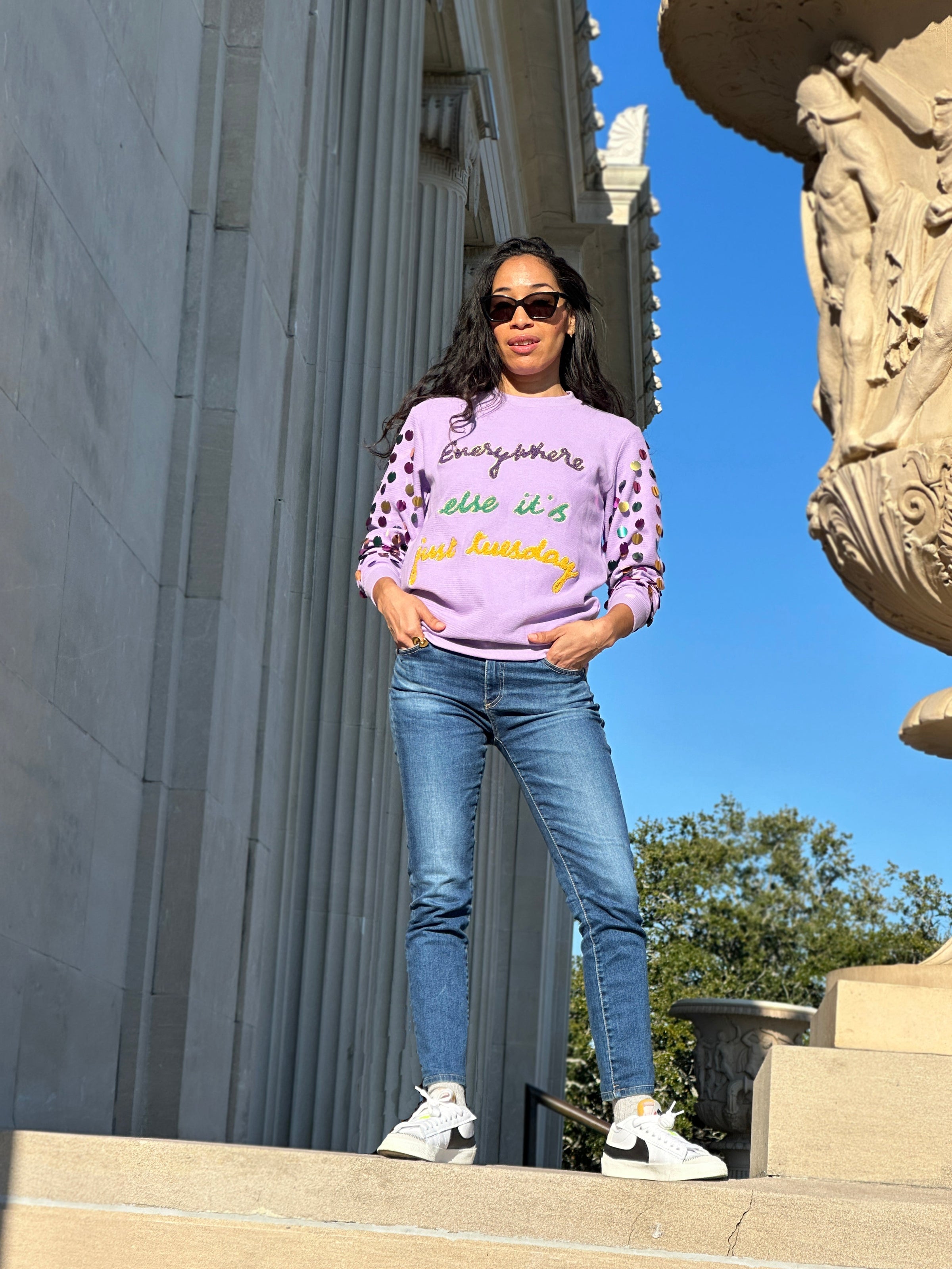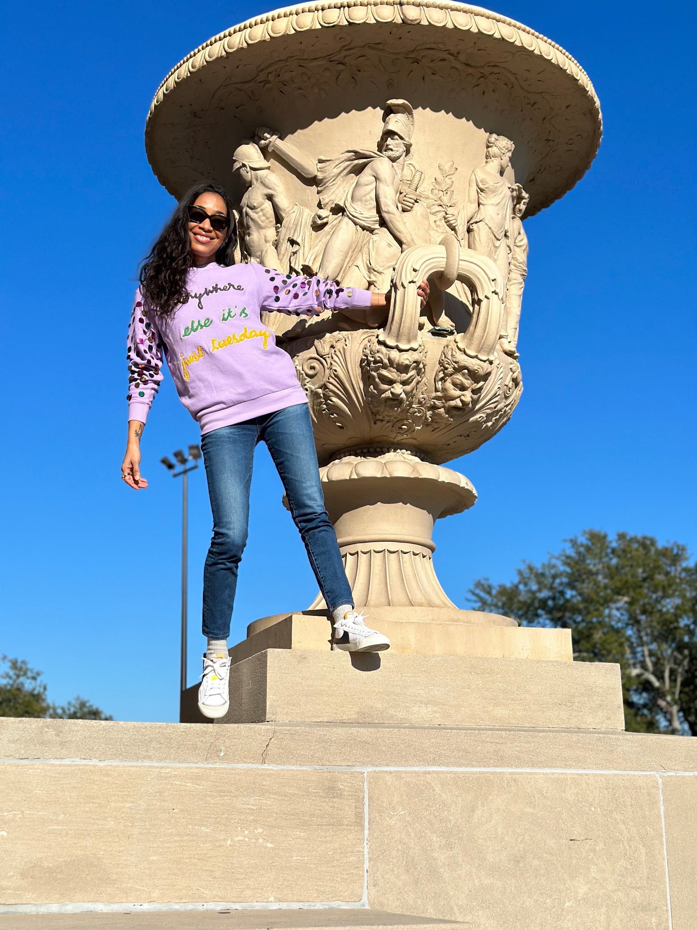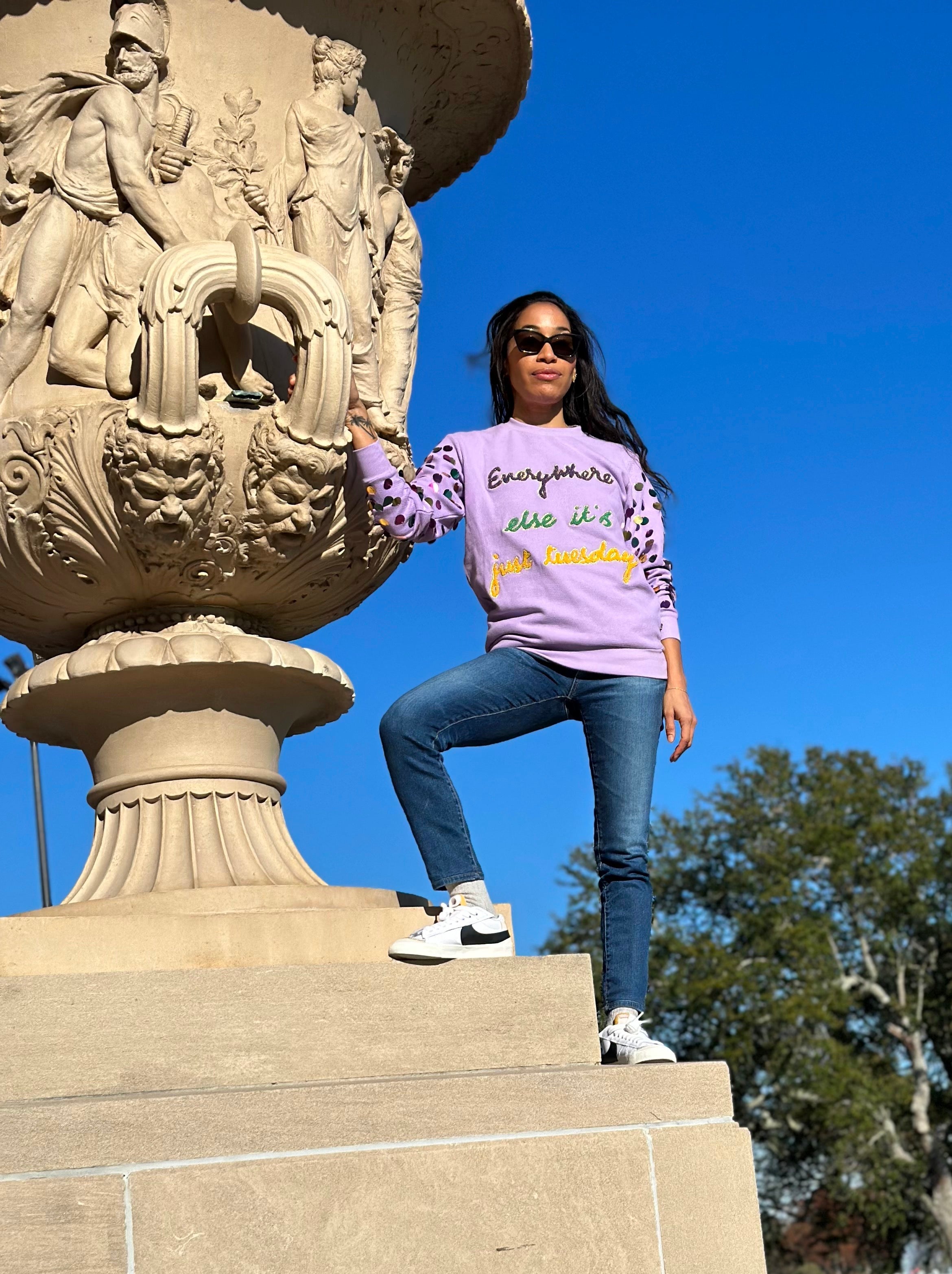 Our ASP Adult JUST TUESDAY Pullover is an absolute Mardi Gras must-have! With its cheeky "Everywhere else it's just Tuesday" embroidery in purples, greens, and golds, you'll be rolling in the good times. Plus, the oversized sequins on the sleeves add an extra touch of flair! Get your festive on!