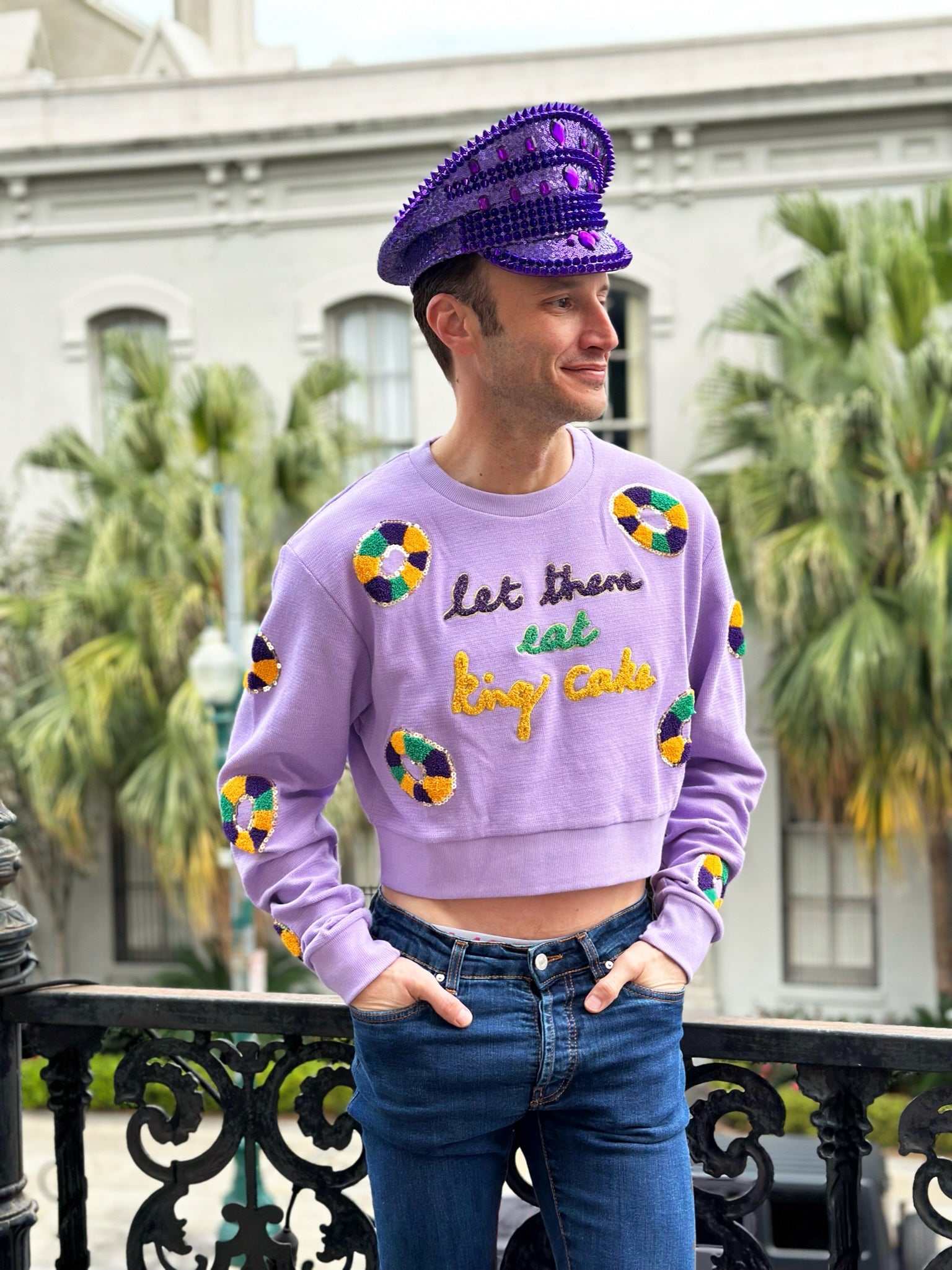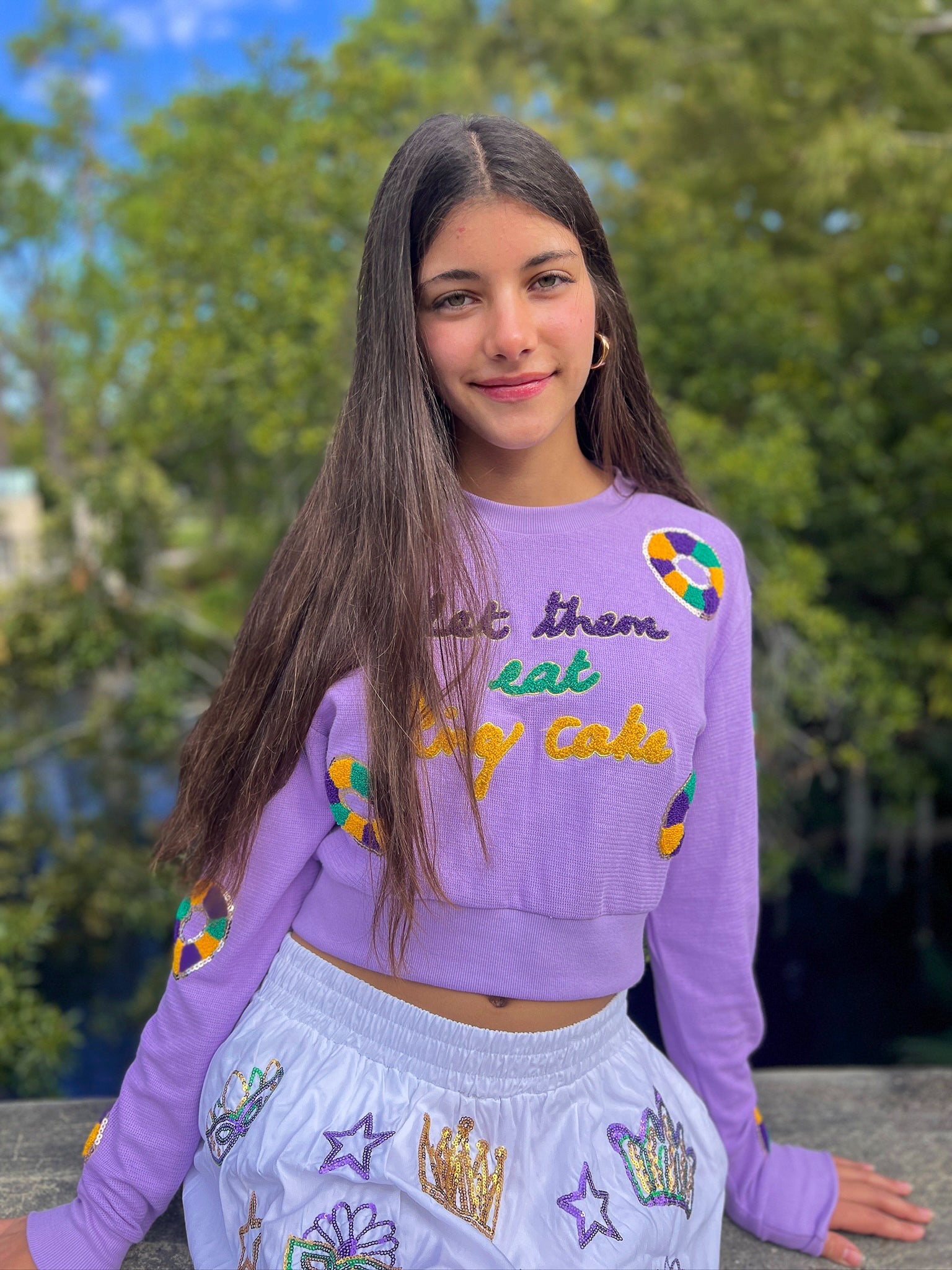 Look your most festive with this Mardi Gras-themed king cake pullover! This lavender pullover is embellished with appliquéd purple, green and gold king cakes and sequins, so you'll be sure to make a royal impression! Bon temps rouler!