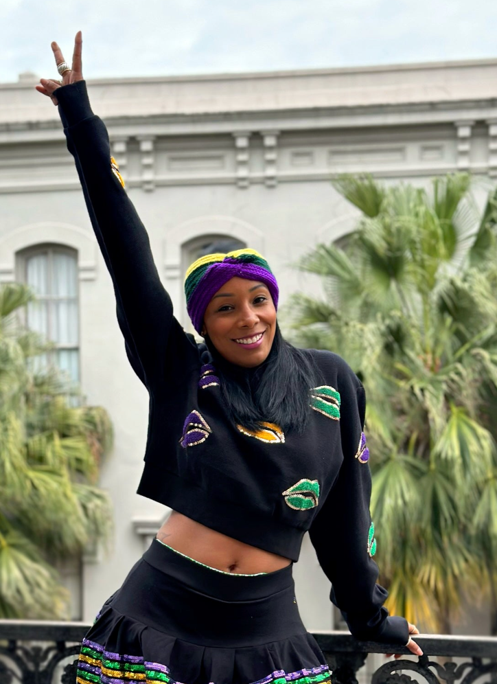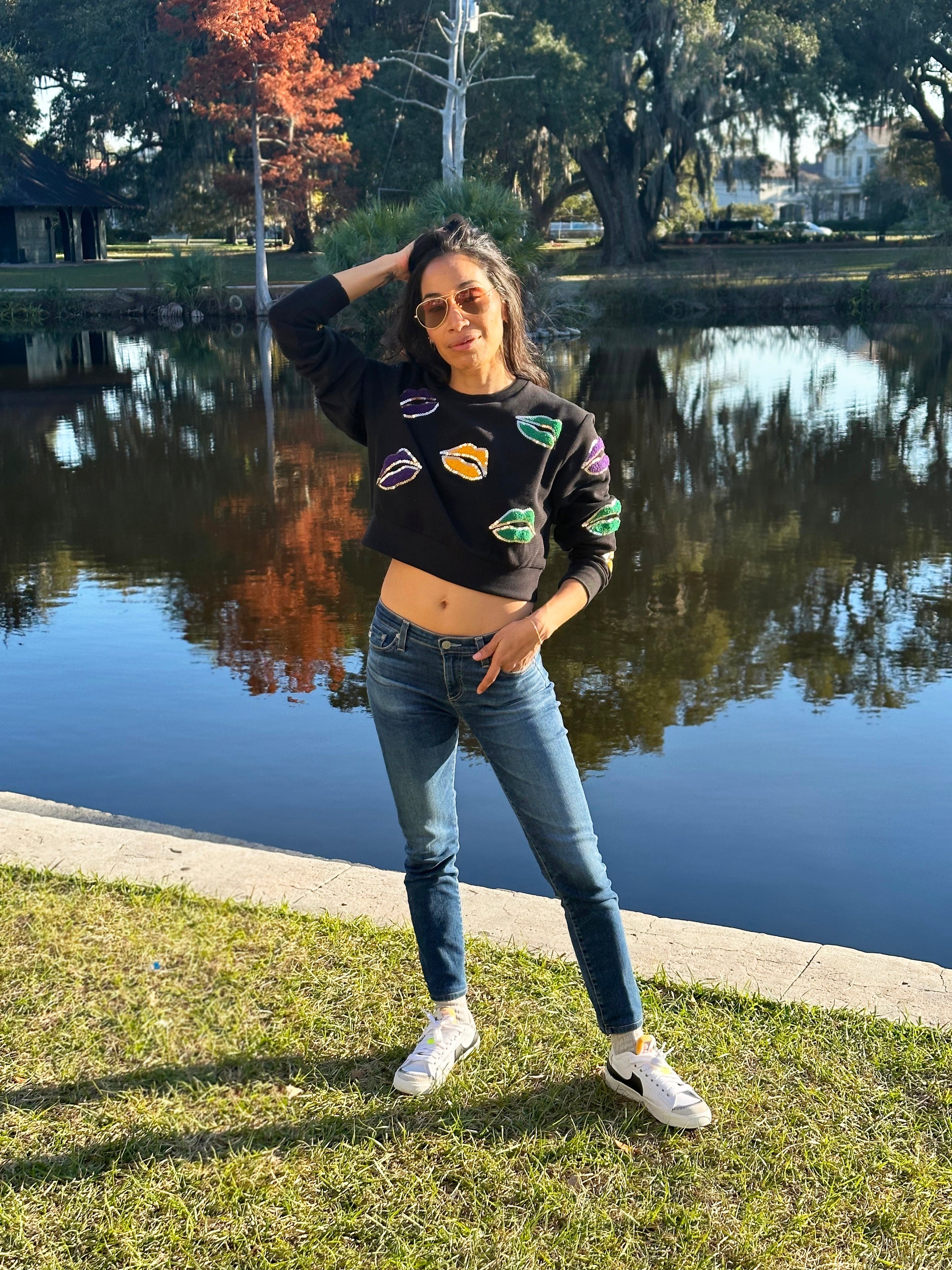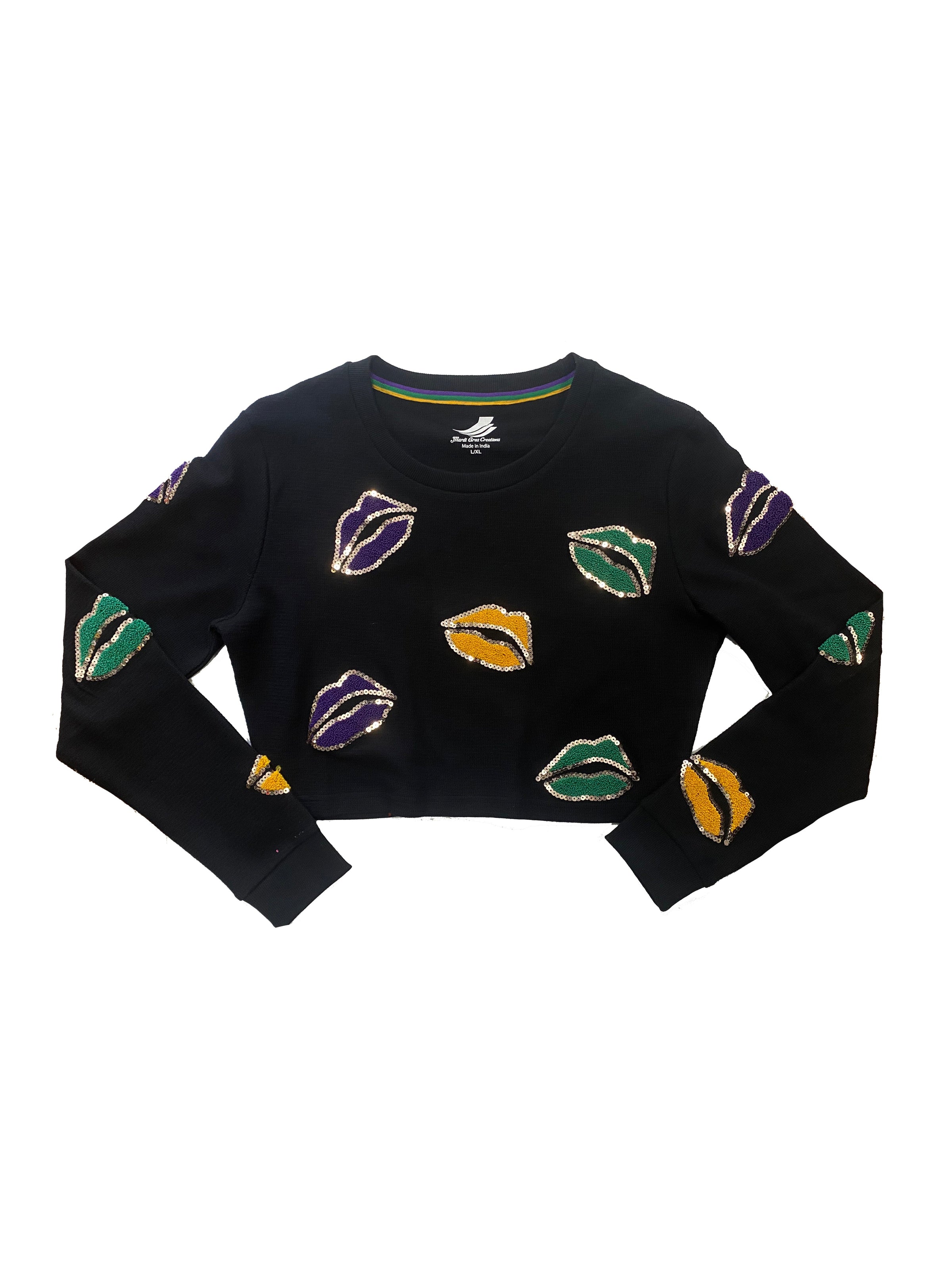 Stay wild and free in this 'ASP All Over Lips Adult Crop Pullover'! It's a perfect way to add some fun, extra kicks to your wardrobe. With a loud and proud Mardi Gras design and chain stitched lips appliqué, this crop pullover will ensure you're the life of the party! Who said being grown up has to be boring?