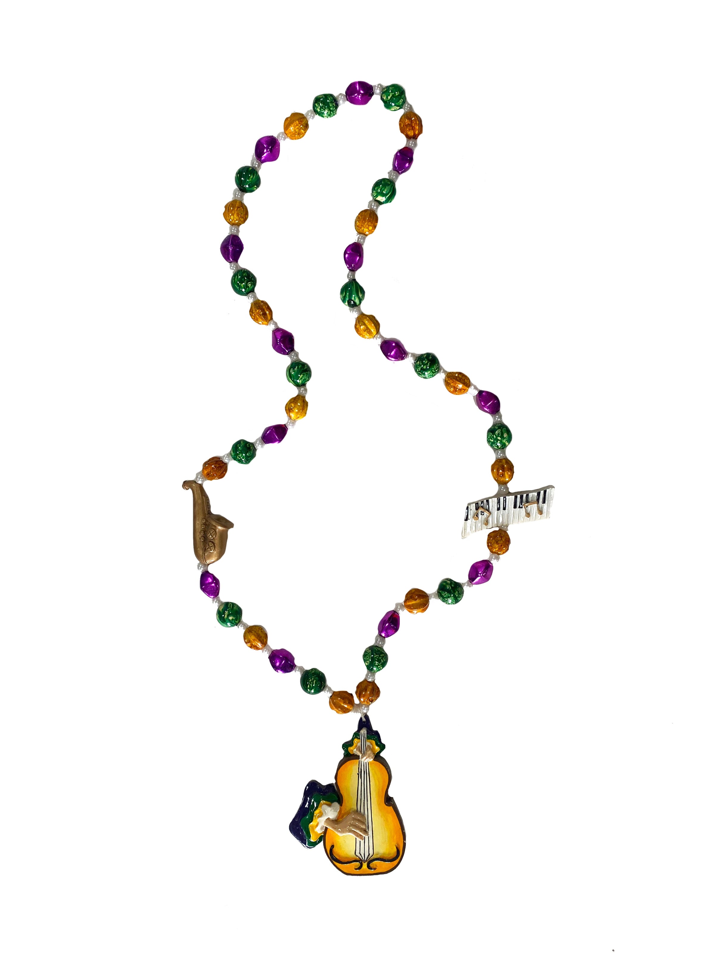 Jazz up your Mardi Gras outfit with our Bass Instruments Trio on Purple Green Gold Specialty Beads! Featuring a playful piano player design, these beads will make you the hit of the party. Get ready to tickle the ivories and show off your musical style!
