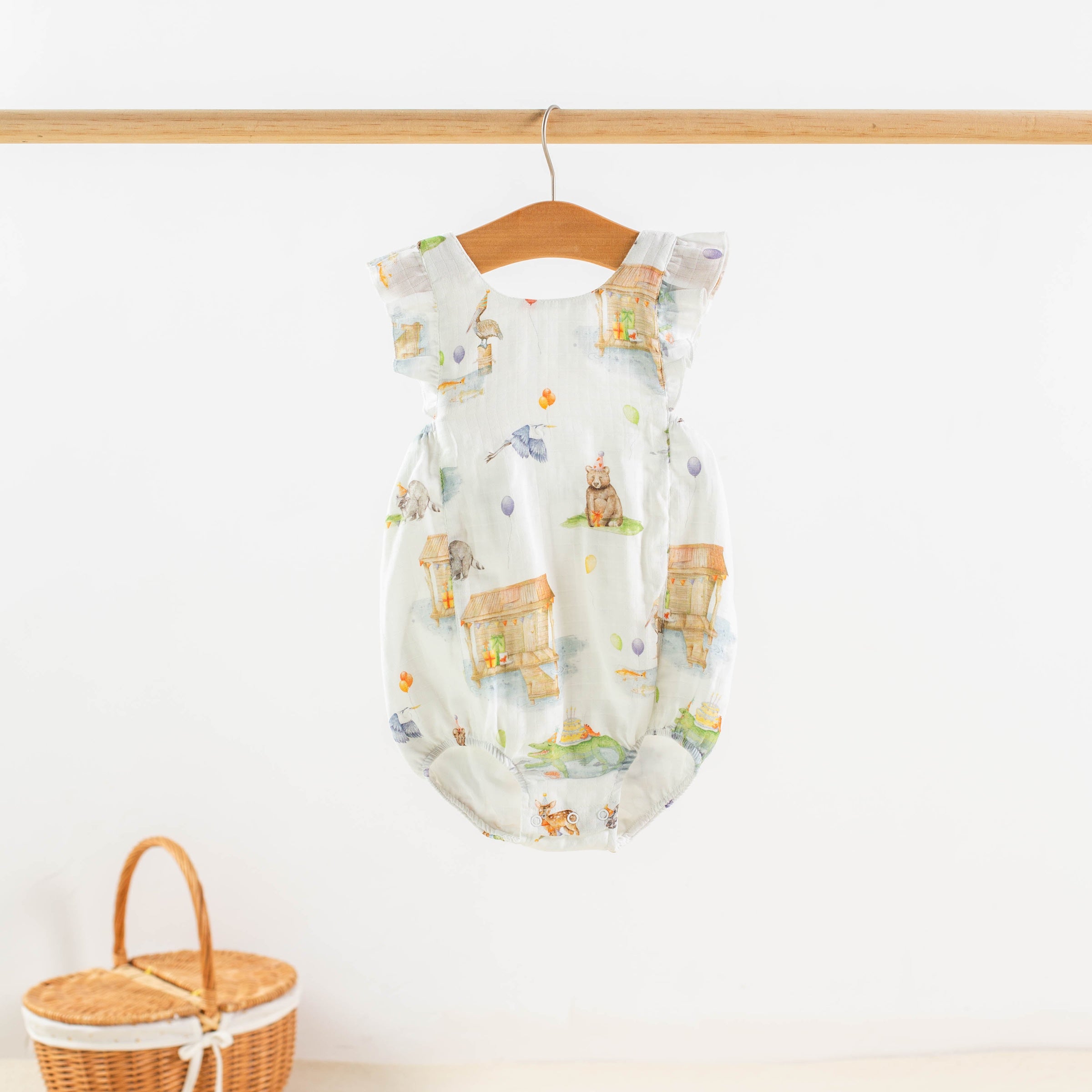 Bring a touch of whimsical charm to your little one's wardrobe with the Bayou Birthday Organic Muslin Bubble Romper! Featuring a playful bayou-inspired print with adorable animals, balloons, and classic Louisiana houseboats, this romper is perfect for special occasions, playdates, and everyday adventures. Made from GOTS-certified 100% organic muslin, it's lightweight, breathable, and oh-so-soft, ensuring your baby stays cool and comfy all day long.