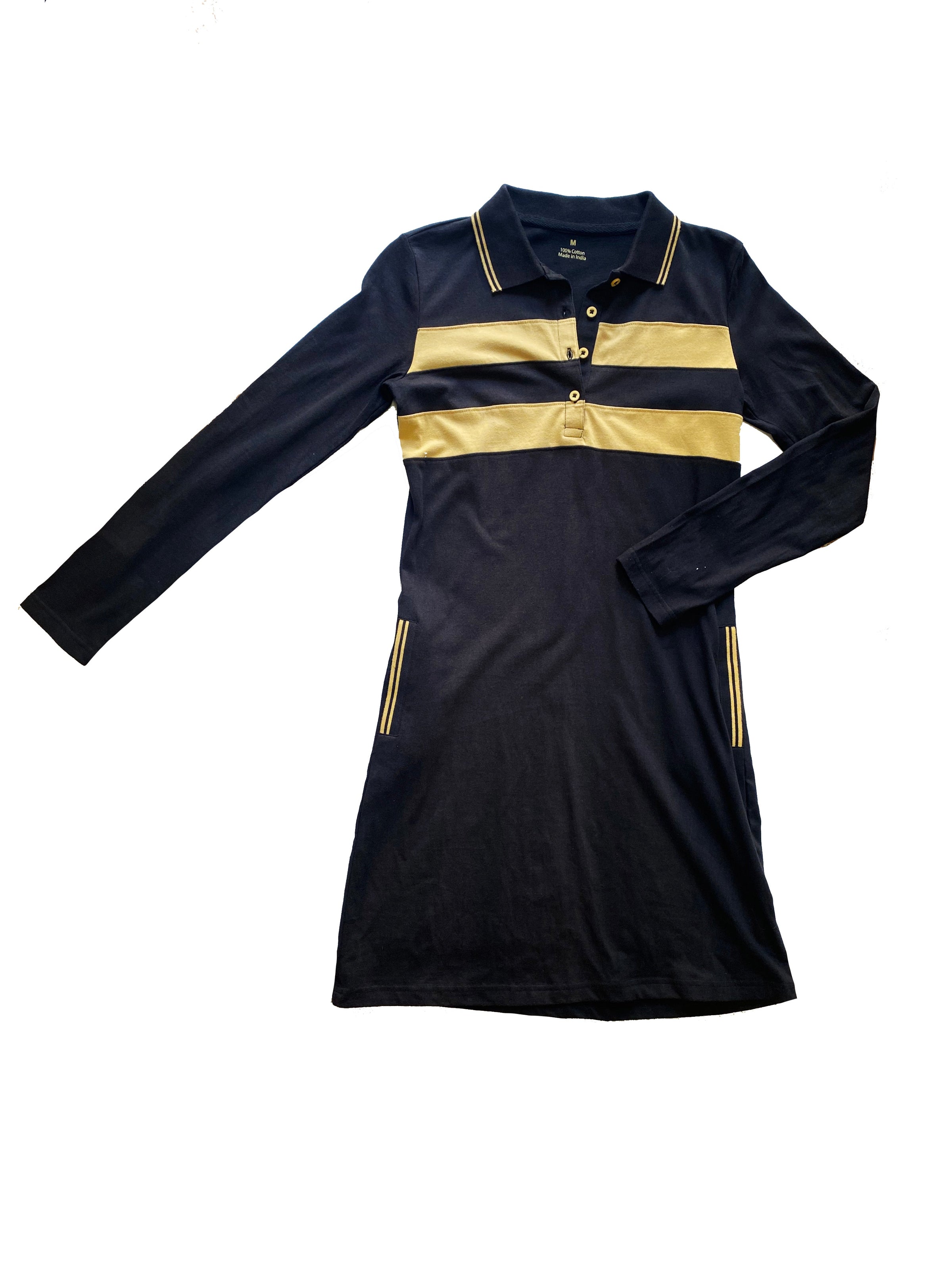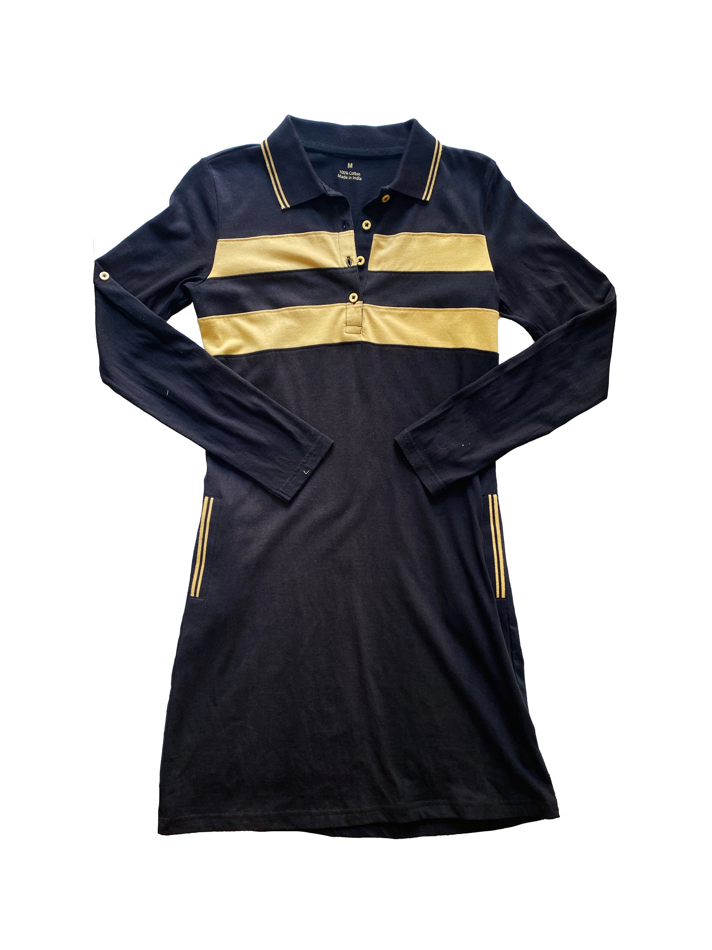 Look your best on game day with this stylish Black and Gold Adult Chest Stripe Dress. Long sleeves keep you warm and comfortable in the cold or can be rolled up and buttoned for those warmer game days. The dress also features gold detailing on the collar and chest, a button collar, and pockets making it the perfect way to show off your team pride.
