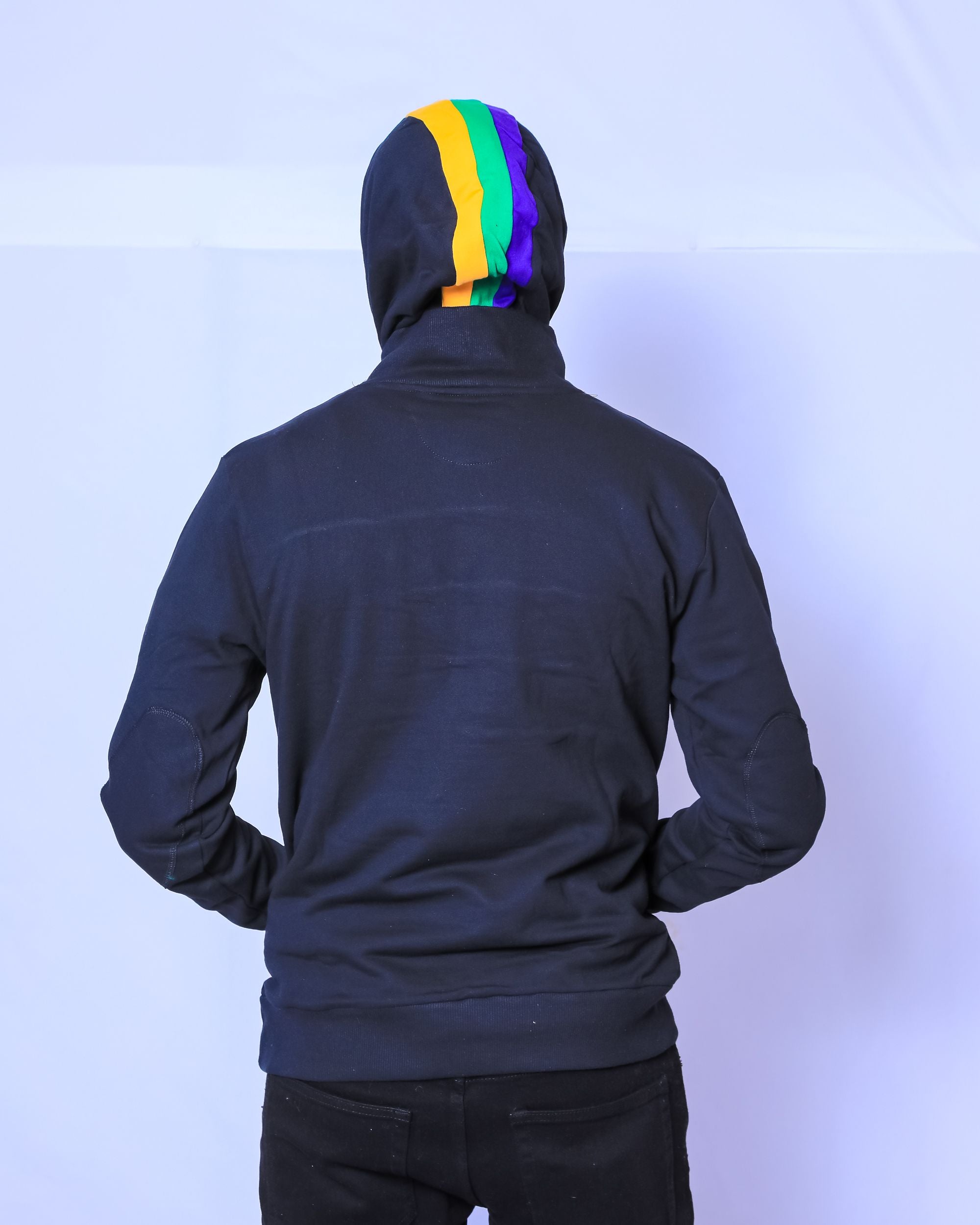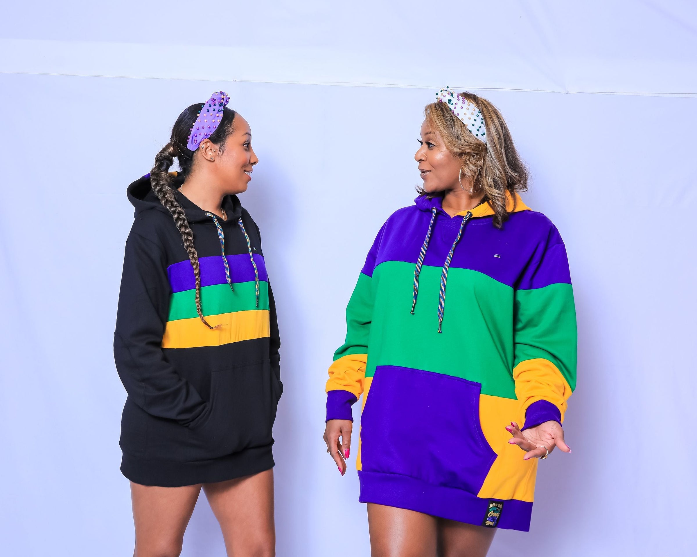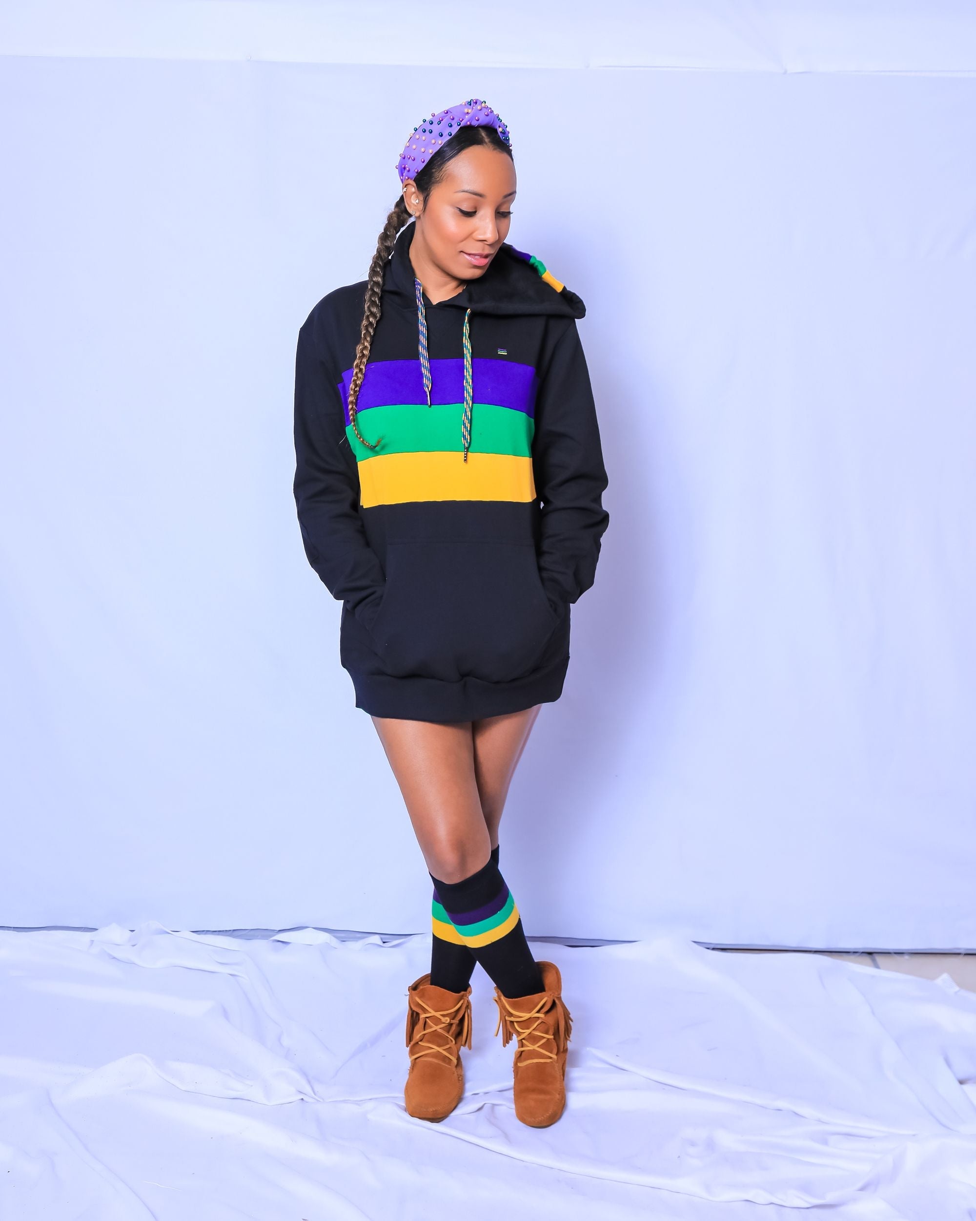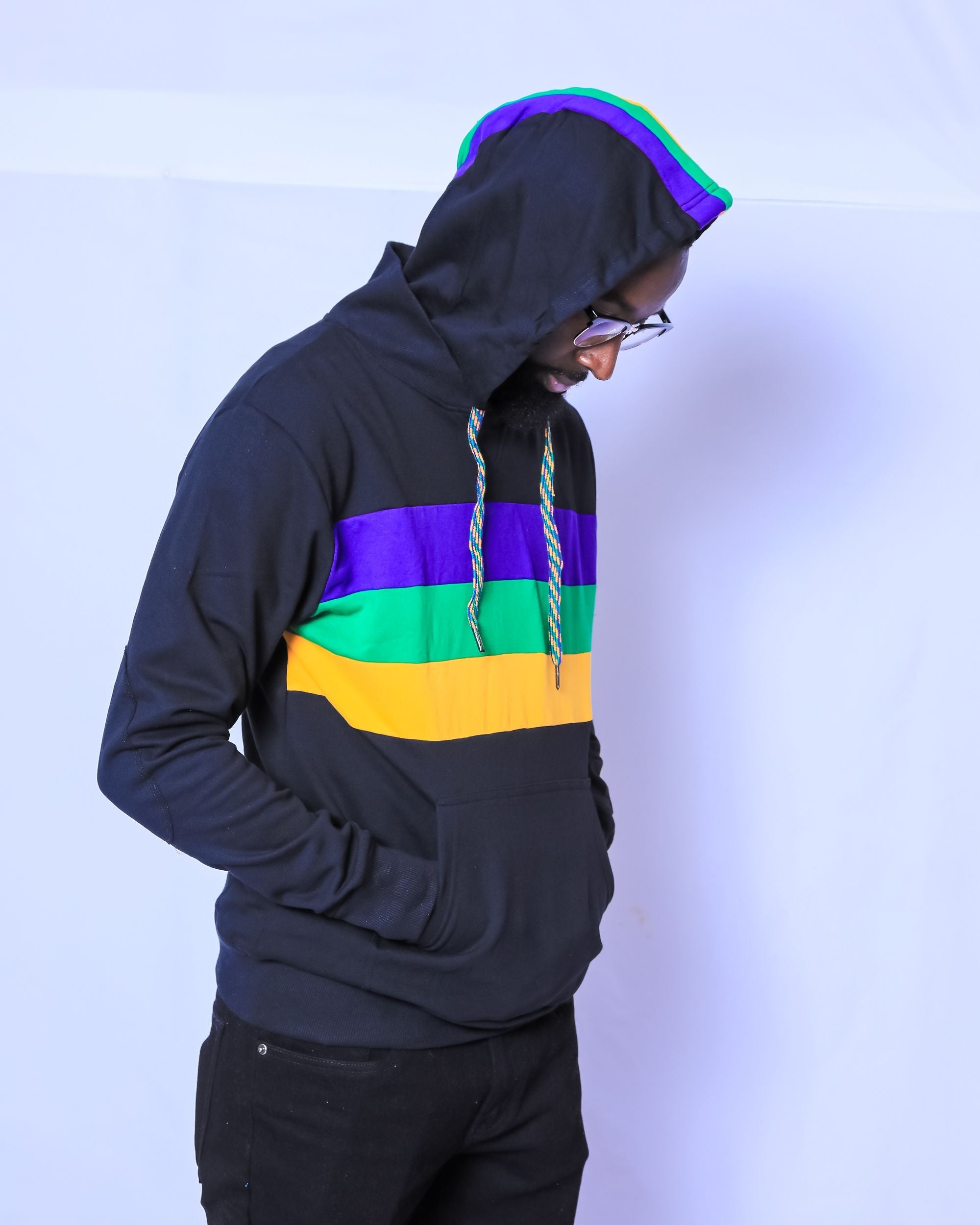 Celebrate Mardi Gras with this stylish black pullover with purple, green and gold stripes. This sweatshirt features wide purple, green and gold prominently and is ideal for men or women as they wait for all the floats to roll!