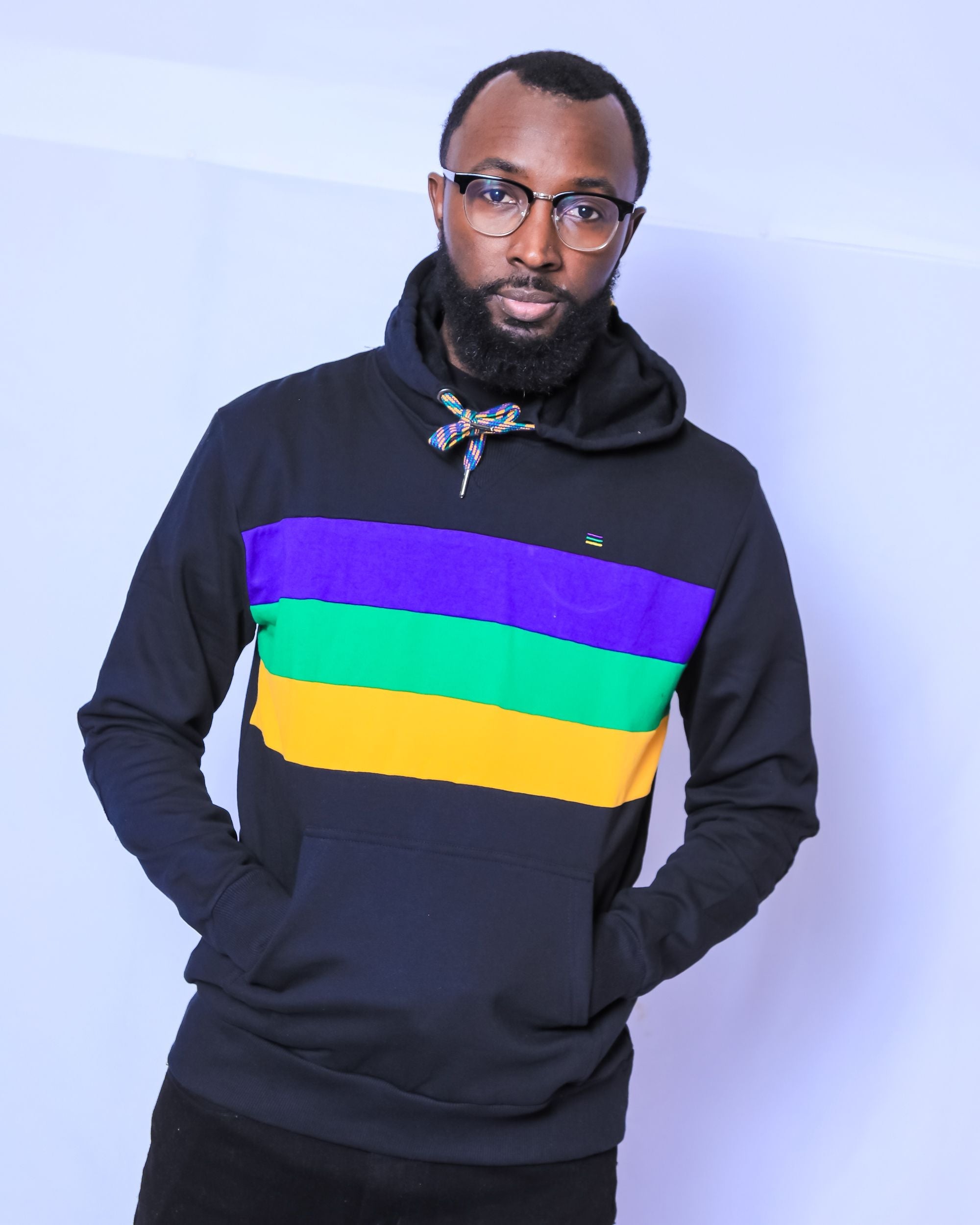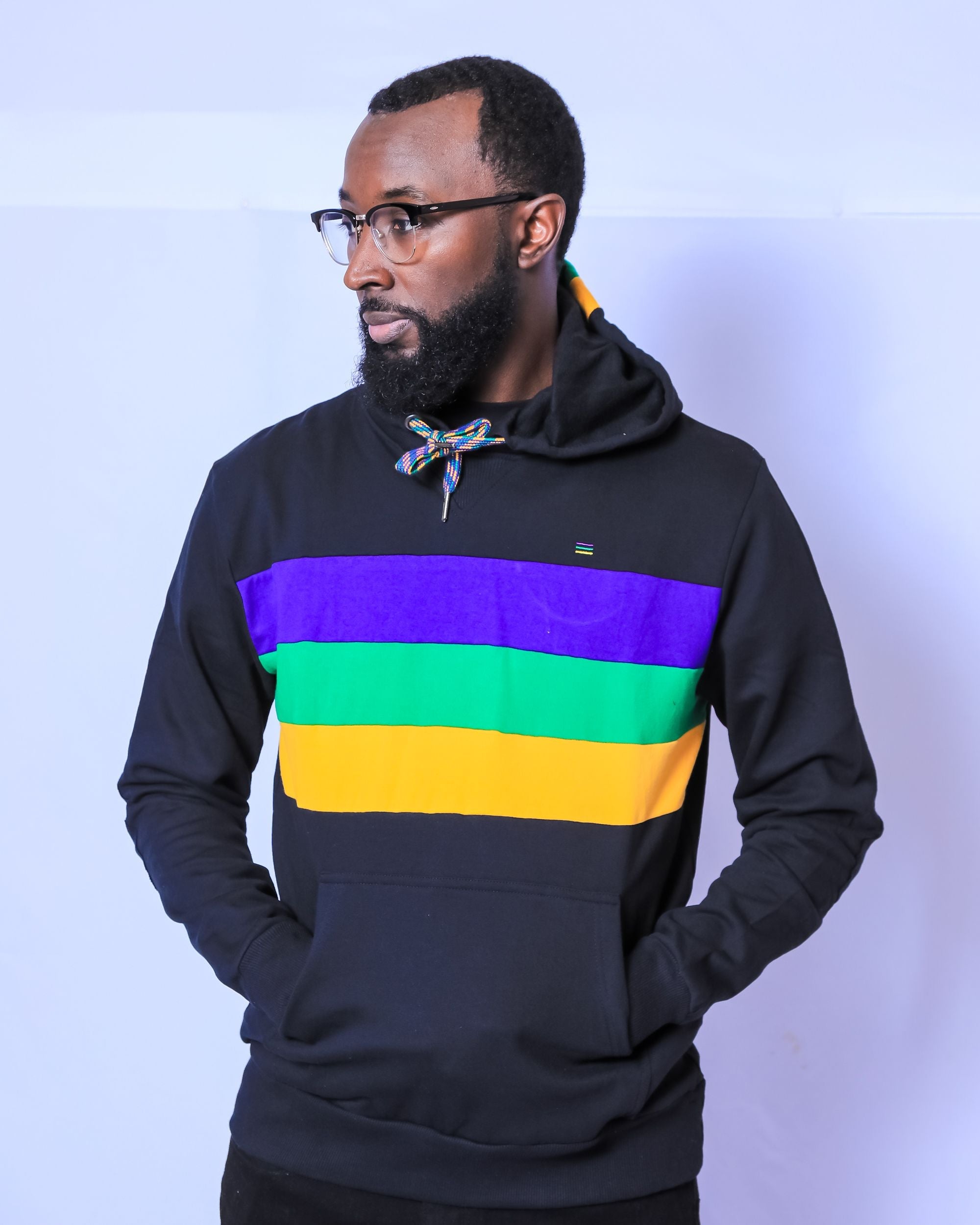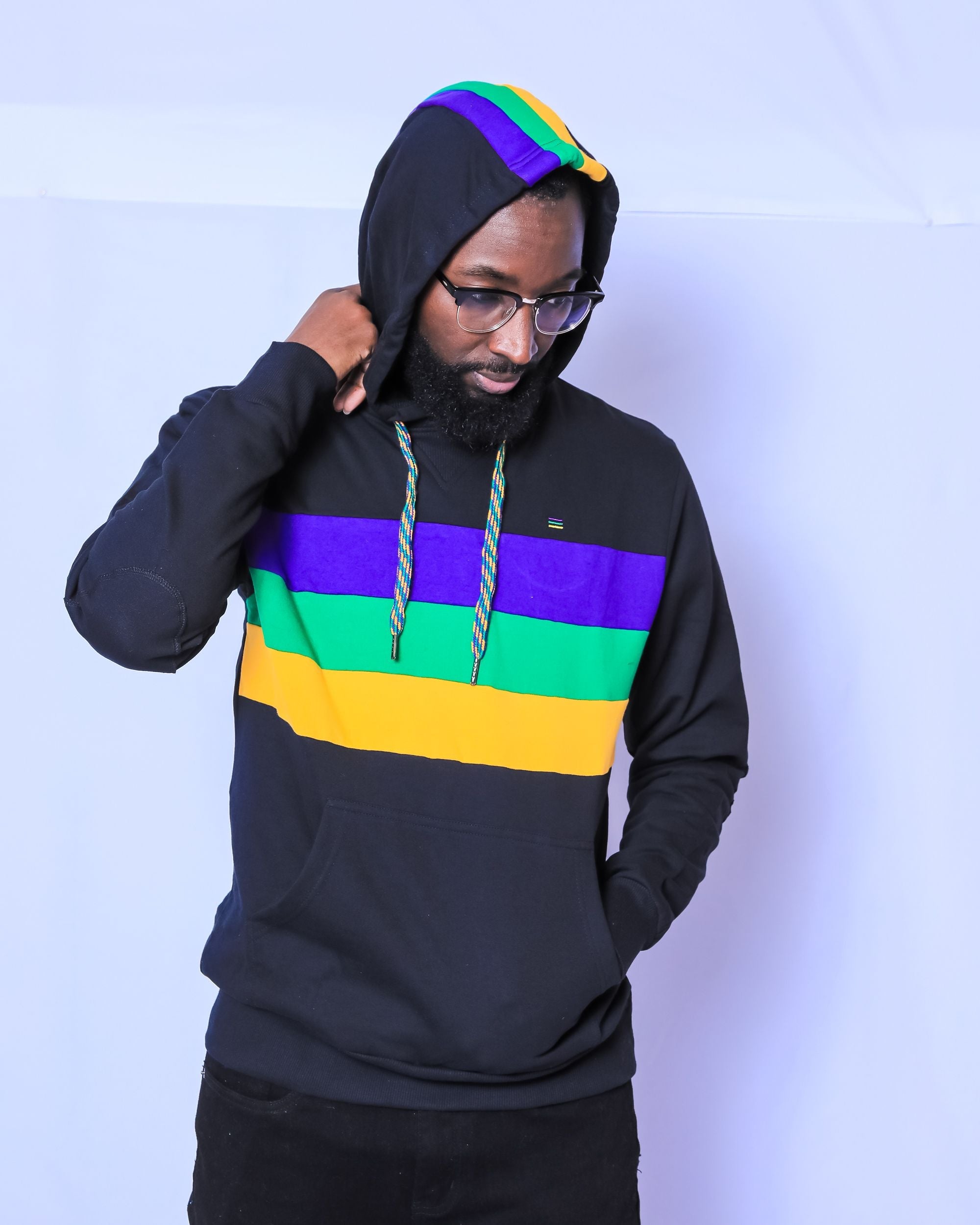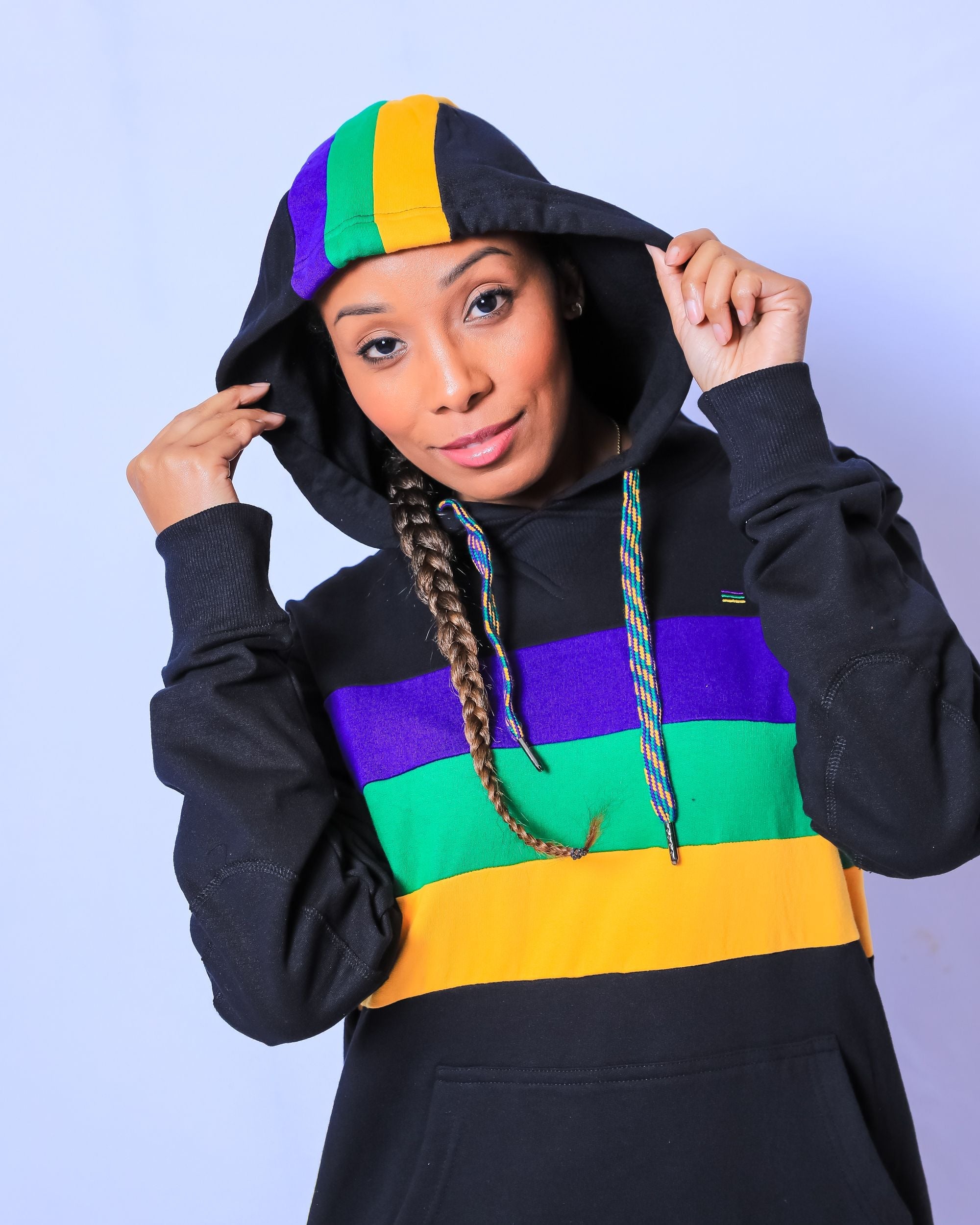 Celebrate Mardi Gras with this stylish black pullover with purple, green and gold stripes. This sweatshirt features wide purple, green and gold prominently and is ideal for men or women as they wait for all the floats to roll!