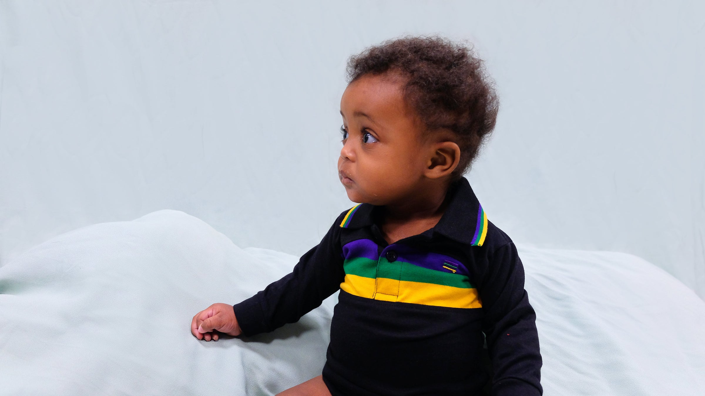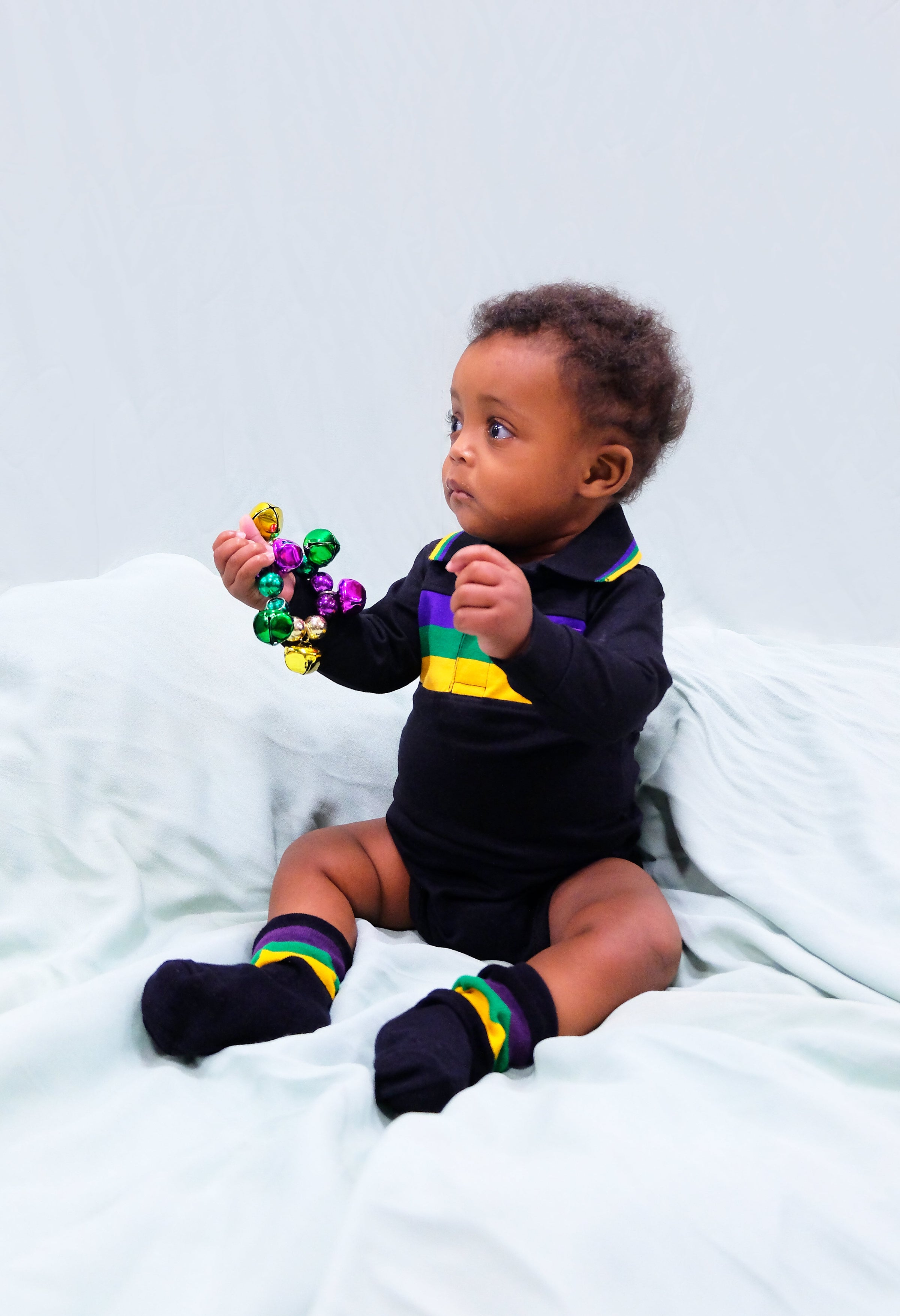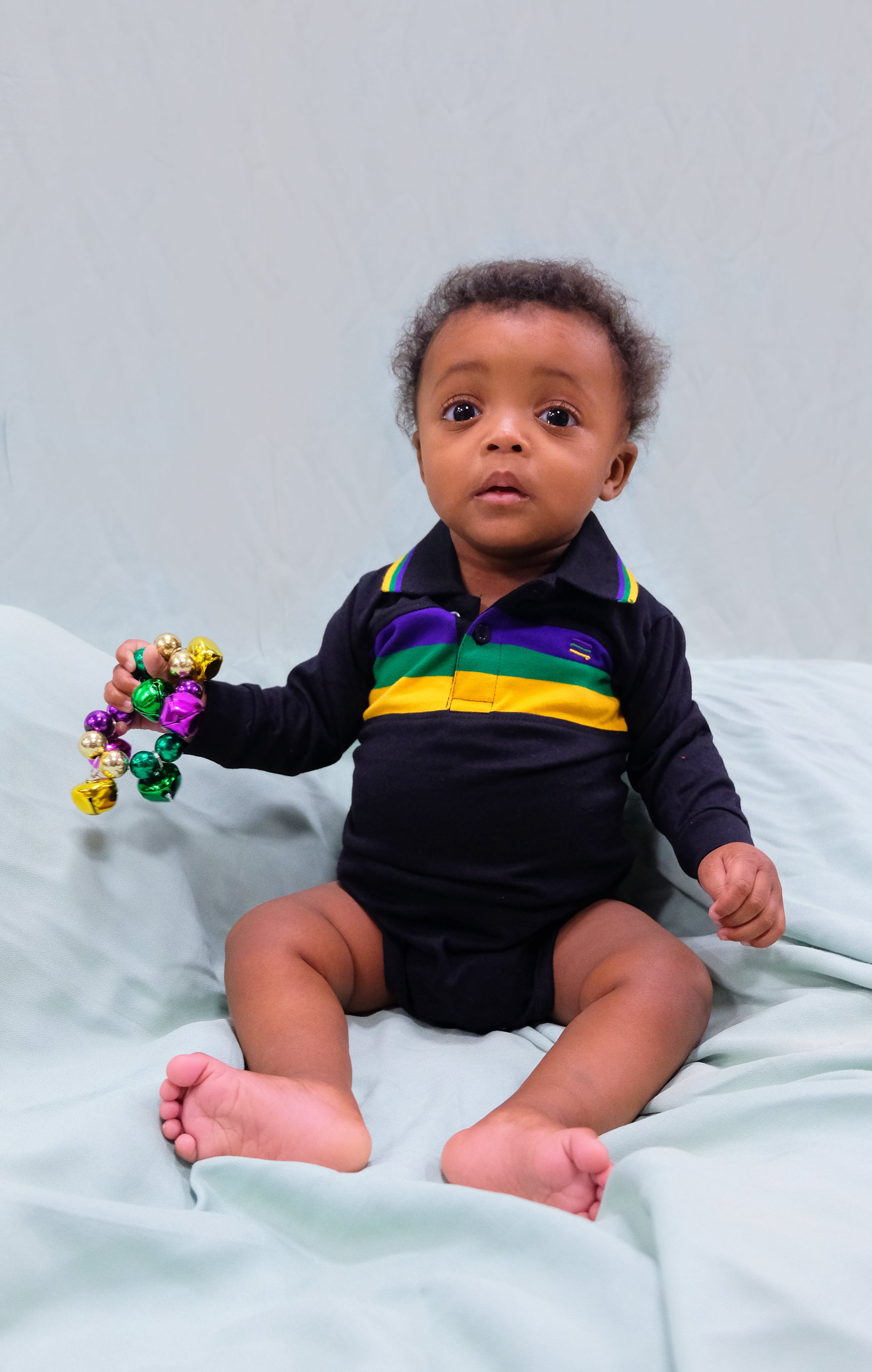 Even the baby can celebrate Mardi Gras with this stylish white short sleeved  onesie. This shirt features purple, green and gold solid stripes across the chest. Collar also has thin stripes/piping around the edges. Three snaps close the bottom.