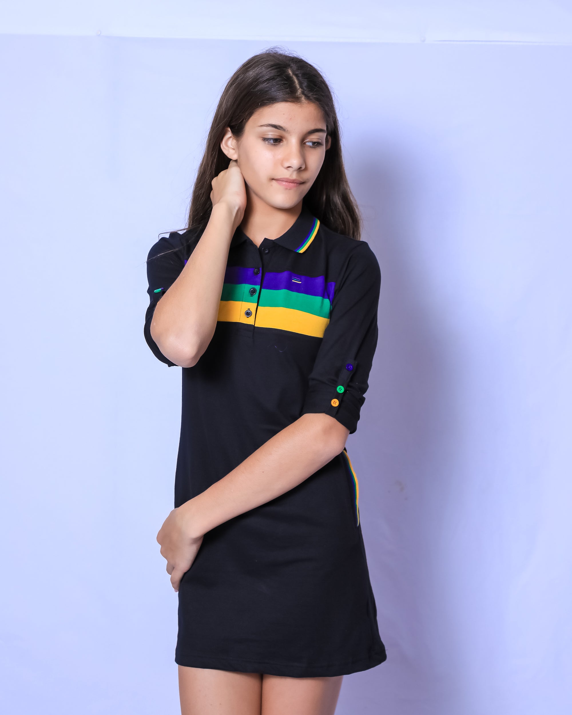 Celebrate Mardi Gras with this beautiful black long sleeved Mardi Gras dress. This dress features purple, green and gold solid stripes across the chest. Small lines of purple, green and gold are around the collar and edges of the pockets. Matching buttons are at the edge of the sleeves. Dress comes to just above the knee.