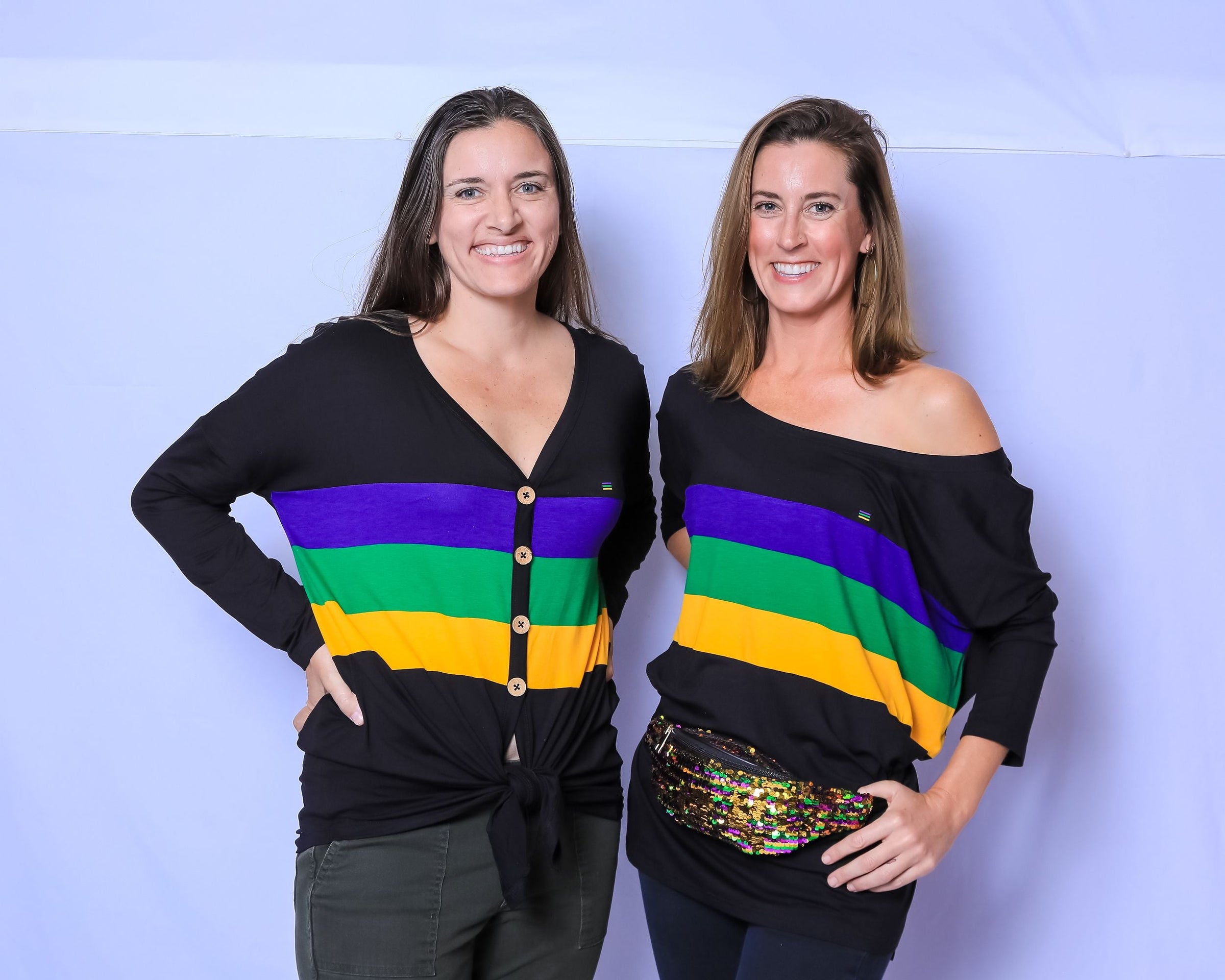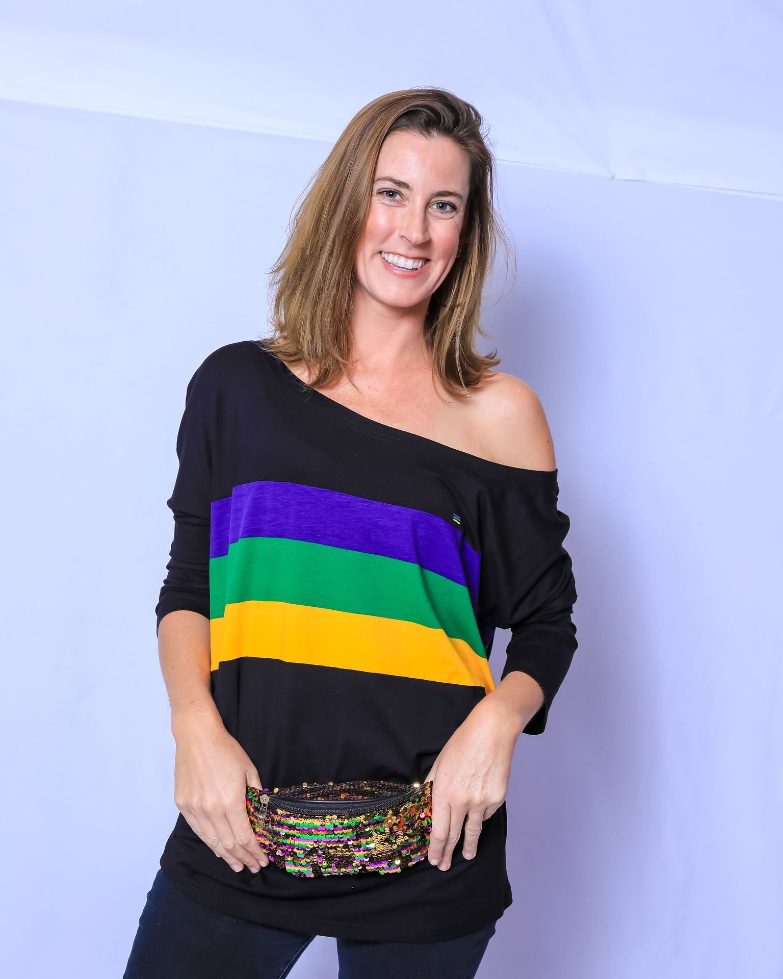 The most comfortable and cutest oversized, off the shoulder top that hits at the perfect length! Slightly longer at the back and extremely flattering this top pairs perfectly with any of our leggings or with skinny jeans! You can mange kids, have all day fun and take part in all the Mardi Gras festivities without restricting movement.