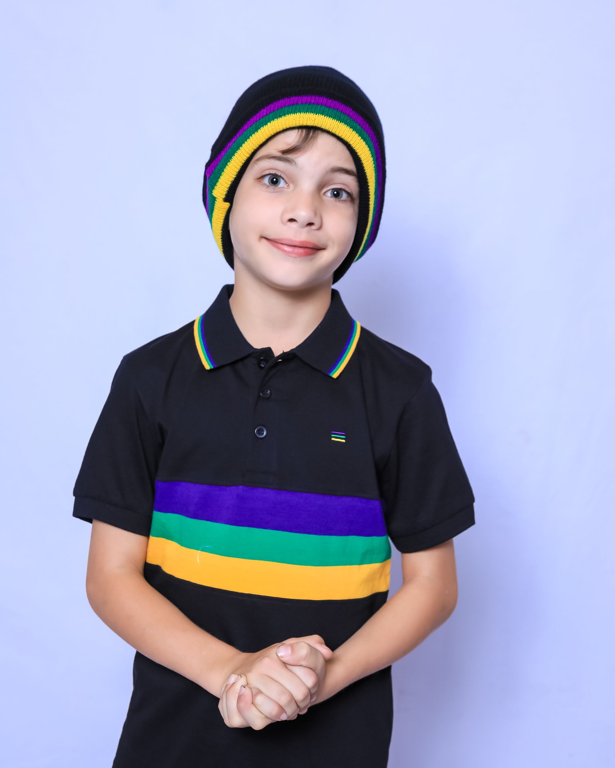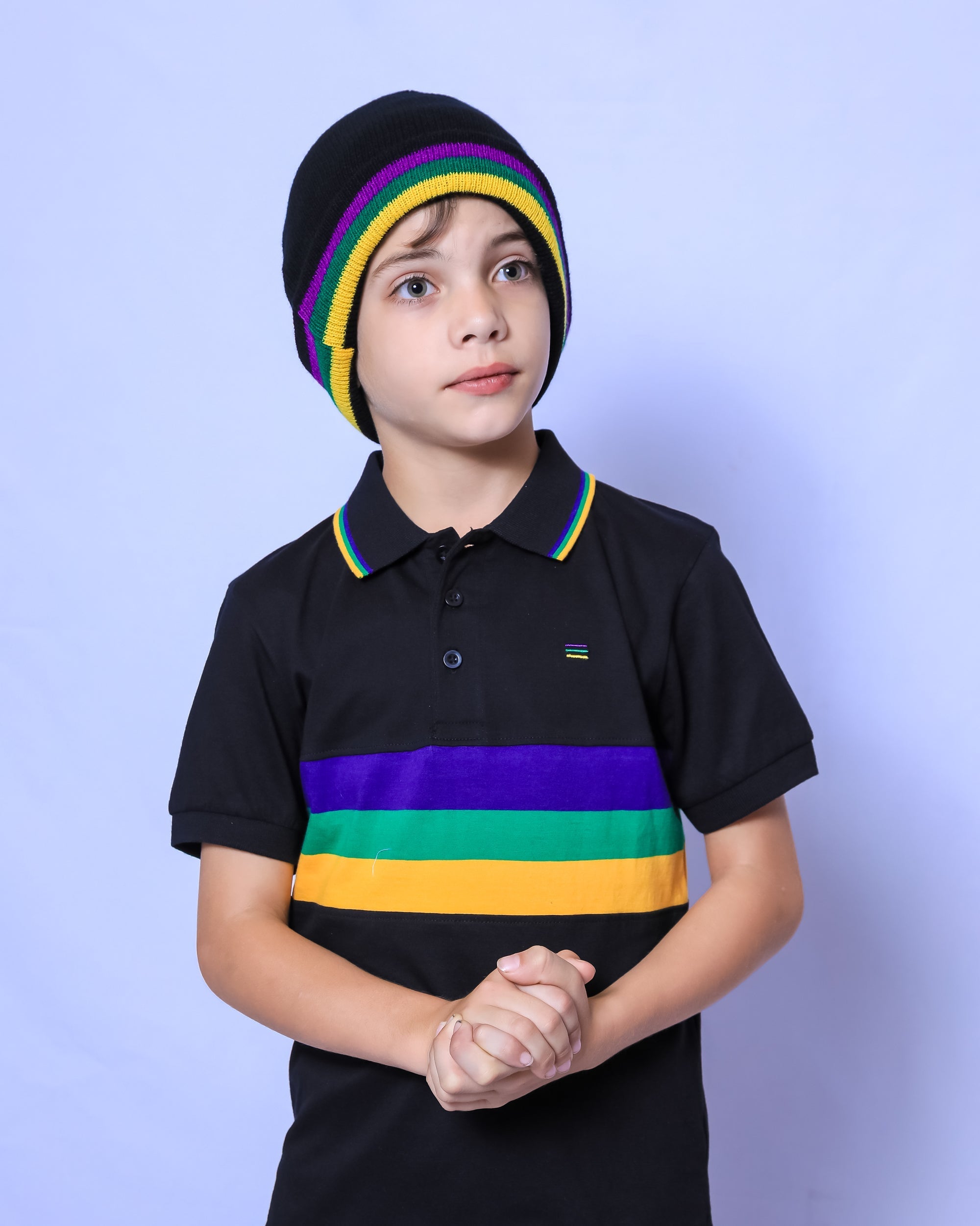 Celebrate Mardi Gras with this stylish kids black short sleeved Mardi Gras shirt. This shirt features purple, green and gold solid stripes across the chest. Small lines of purple, green and gold are around the edge of the collar.