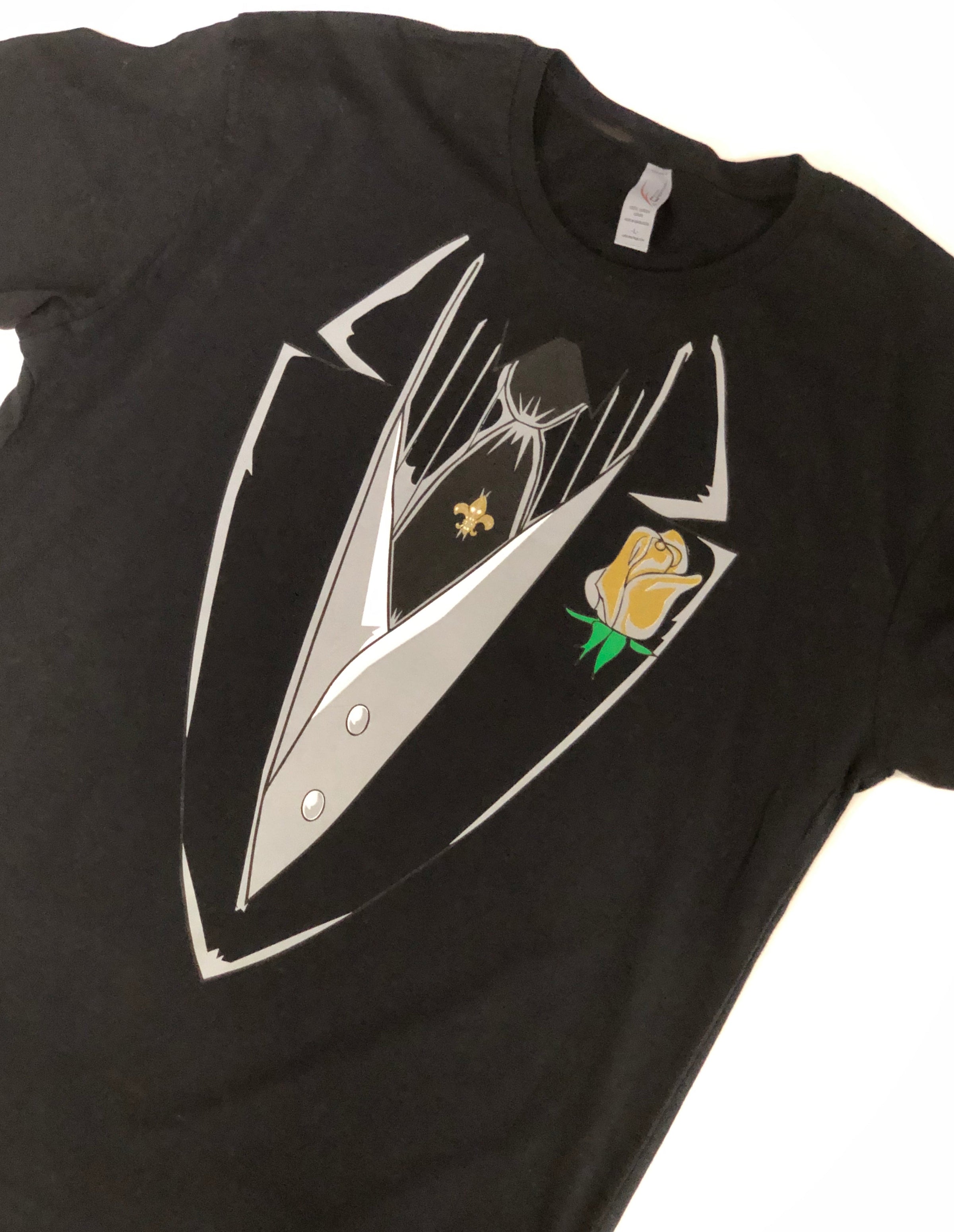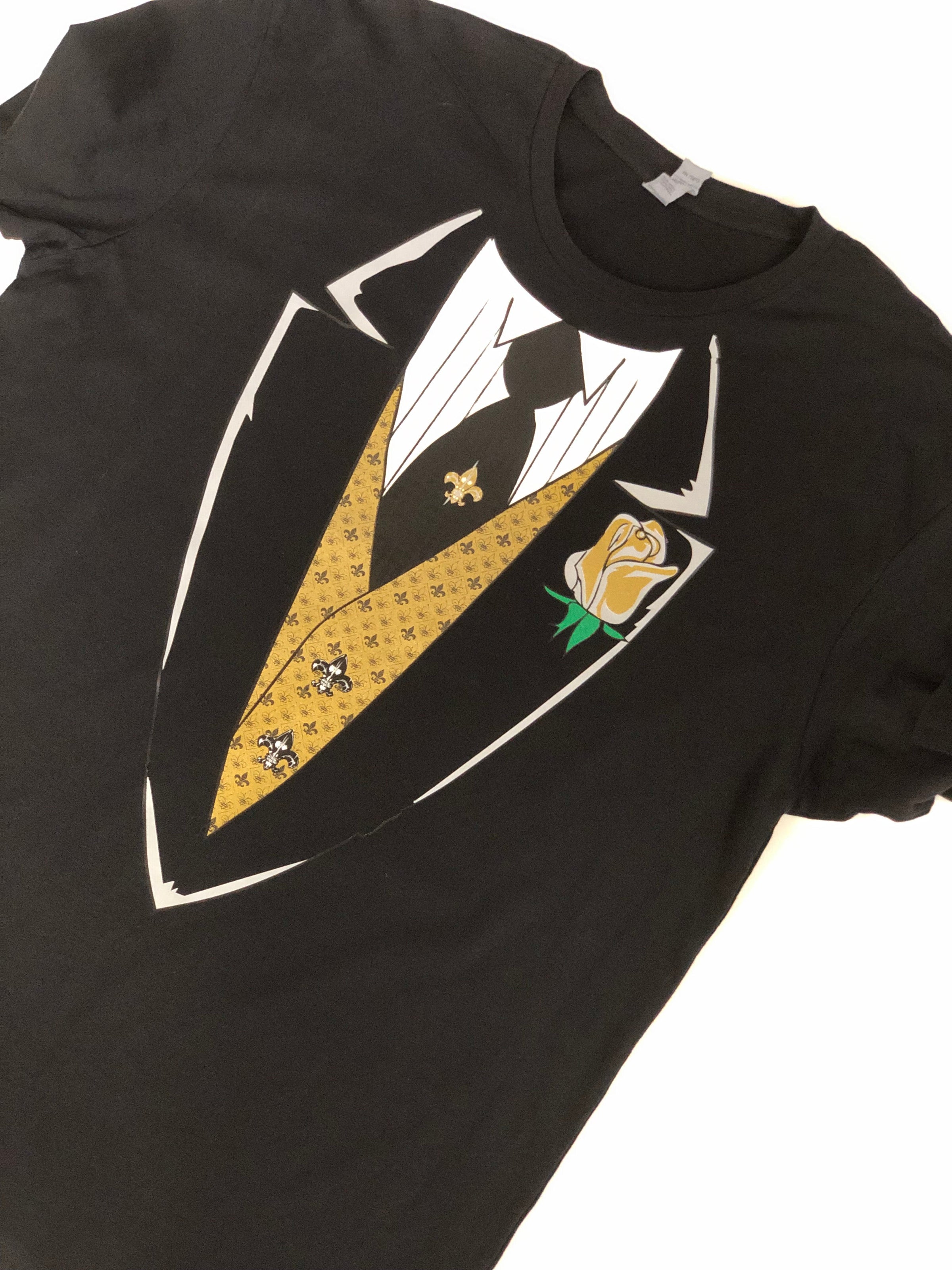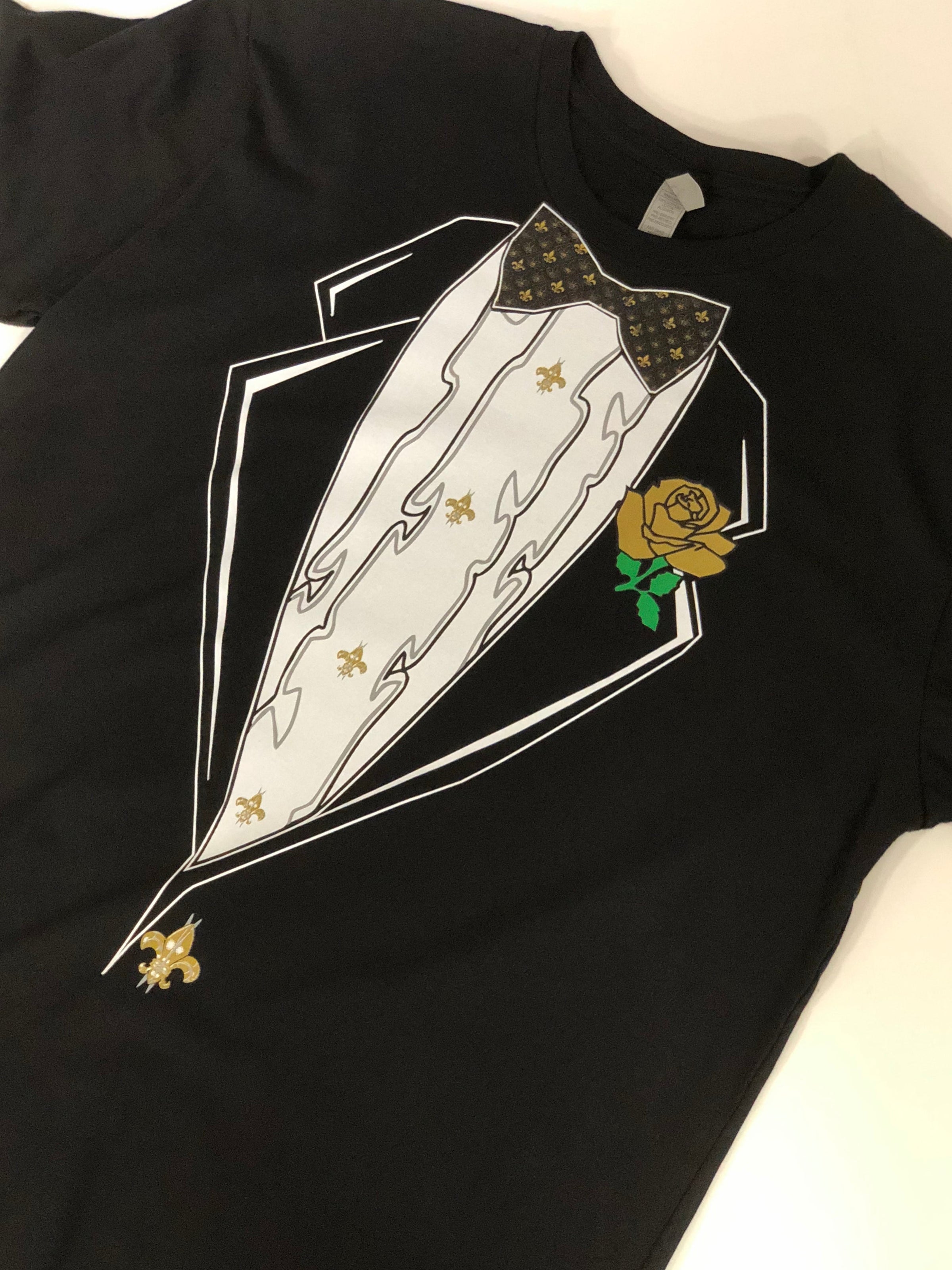 Dress up your T-Shirt game! These Black & Gold T-shirts feature a Tuxedo!