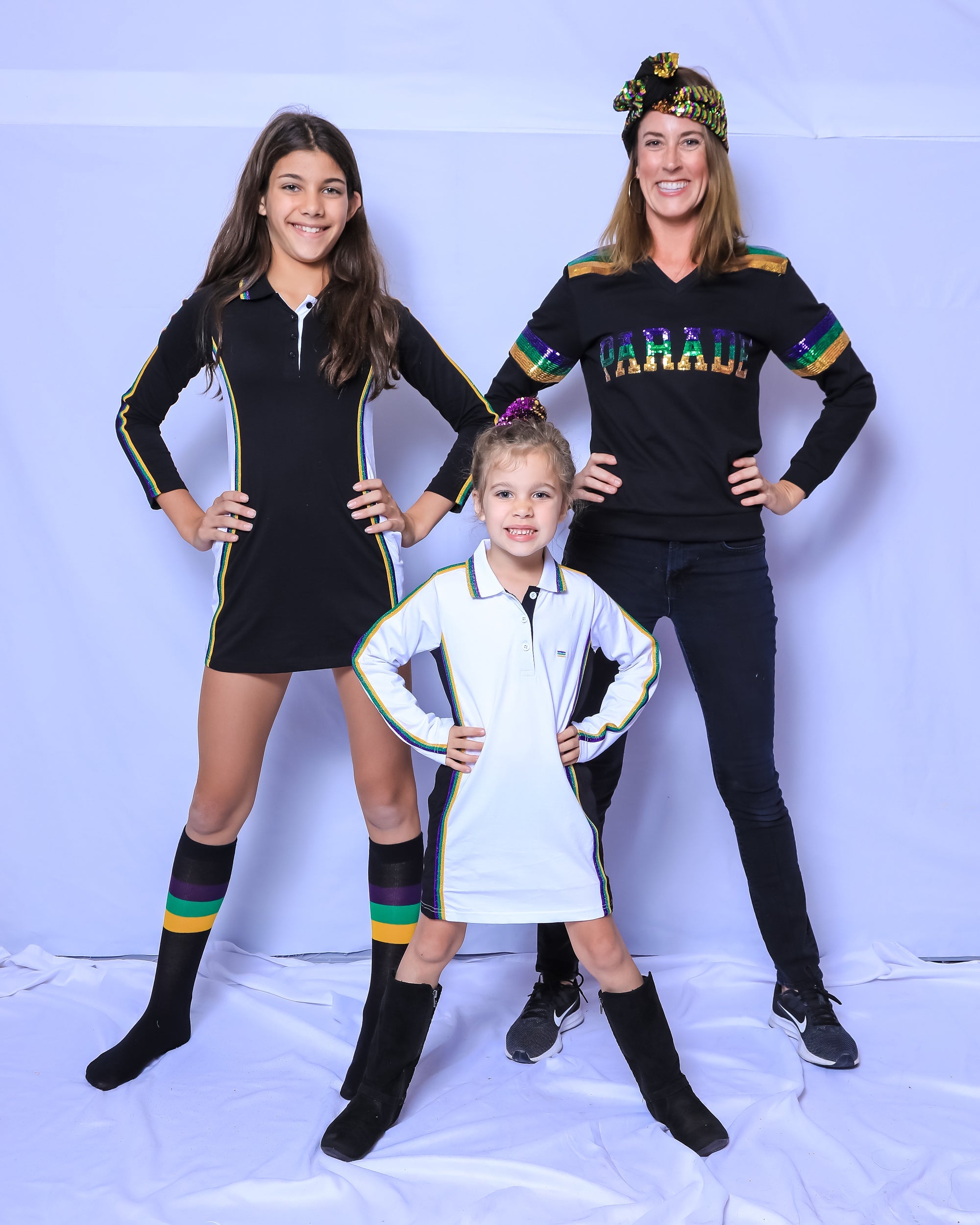 Celebrate Mardi Gras with this stylish black long sleeved Mardi Gras dress. This dress features white side panels and pockets. Small lines of purple, green and gold are around the collar and along the sides of the panels