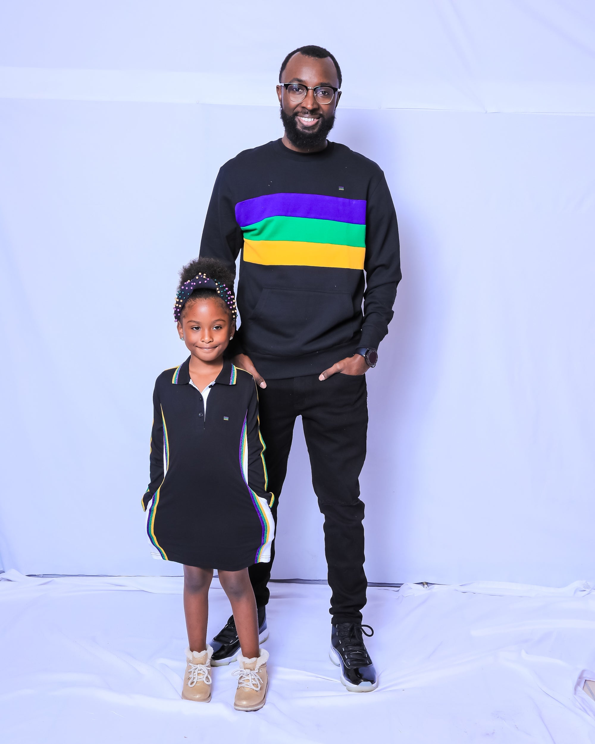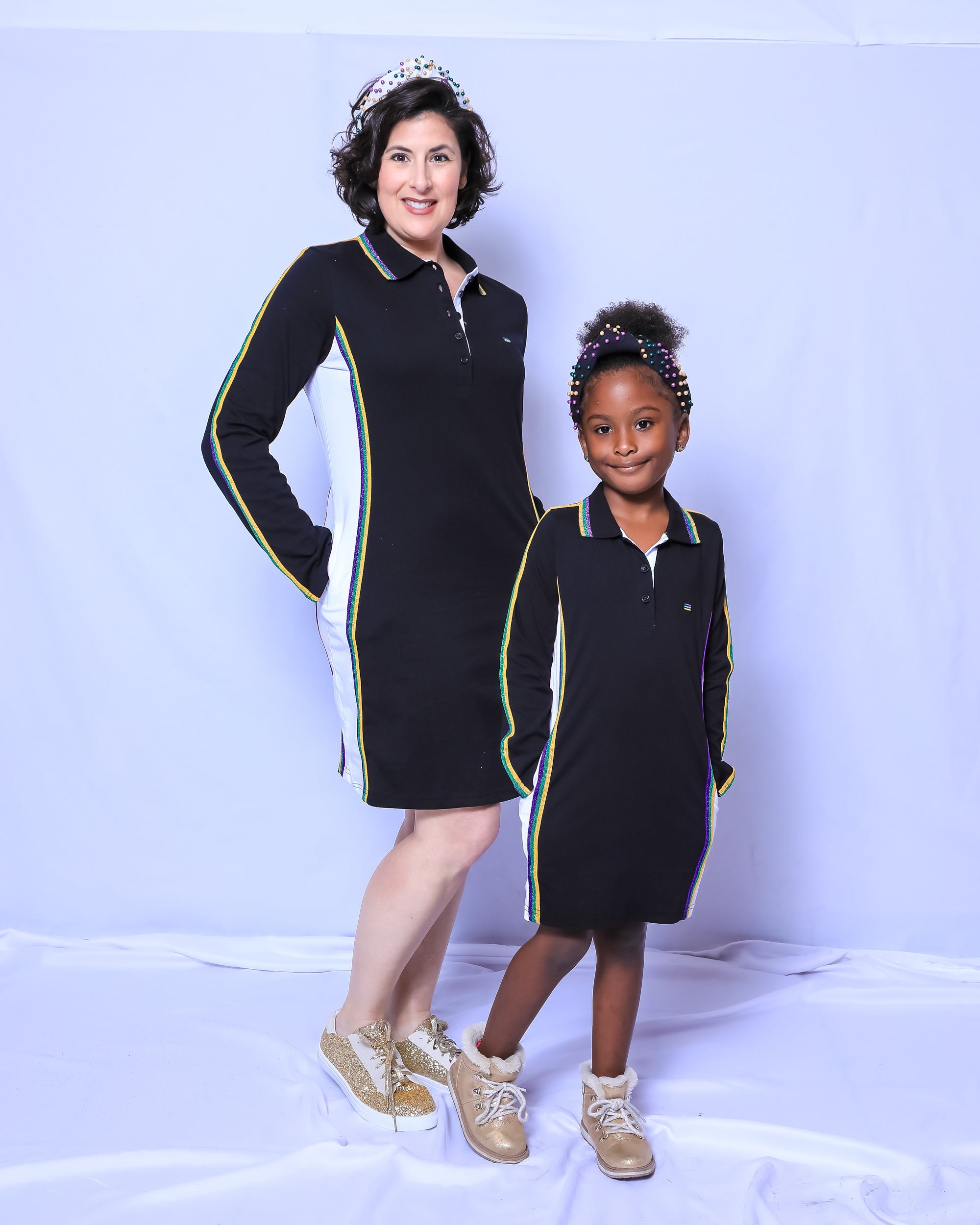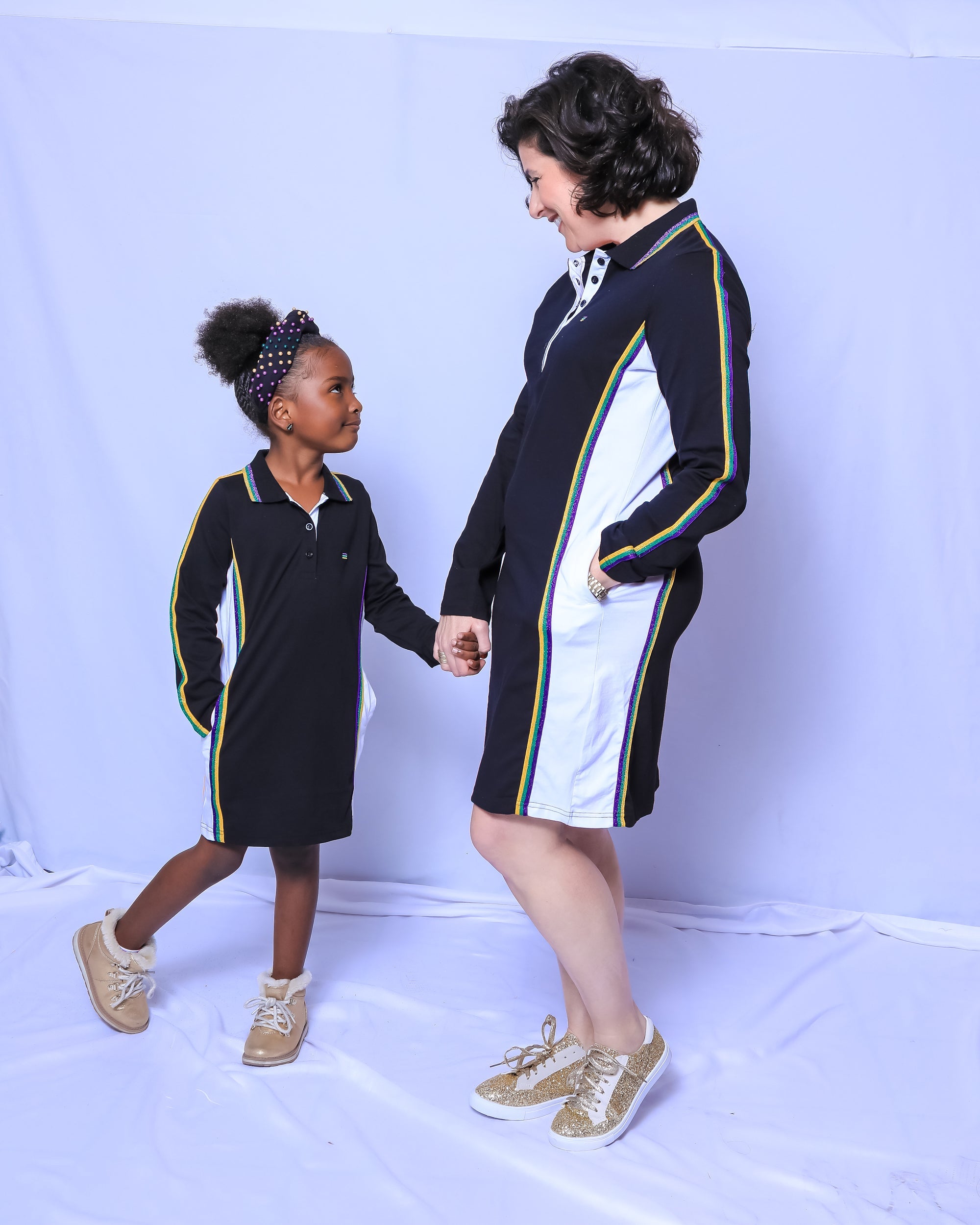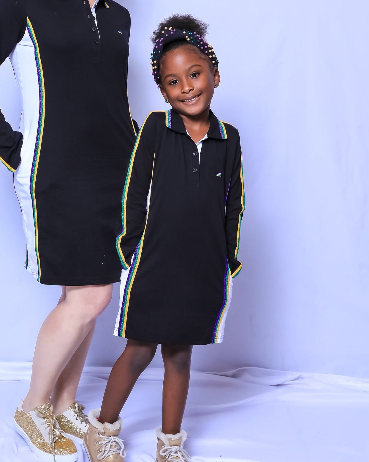 Celebrate Mardi Gras with this kids stylish black long sleeved Mardi Gras dress. This dress features white side panels and pockets. Small lines of purple, green and gold are around the collar and along the sides of the panels