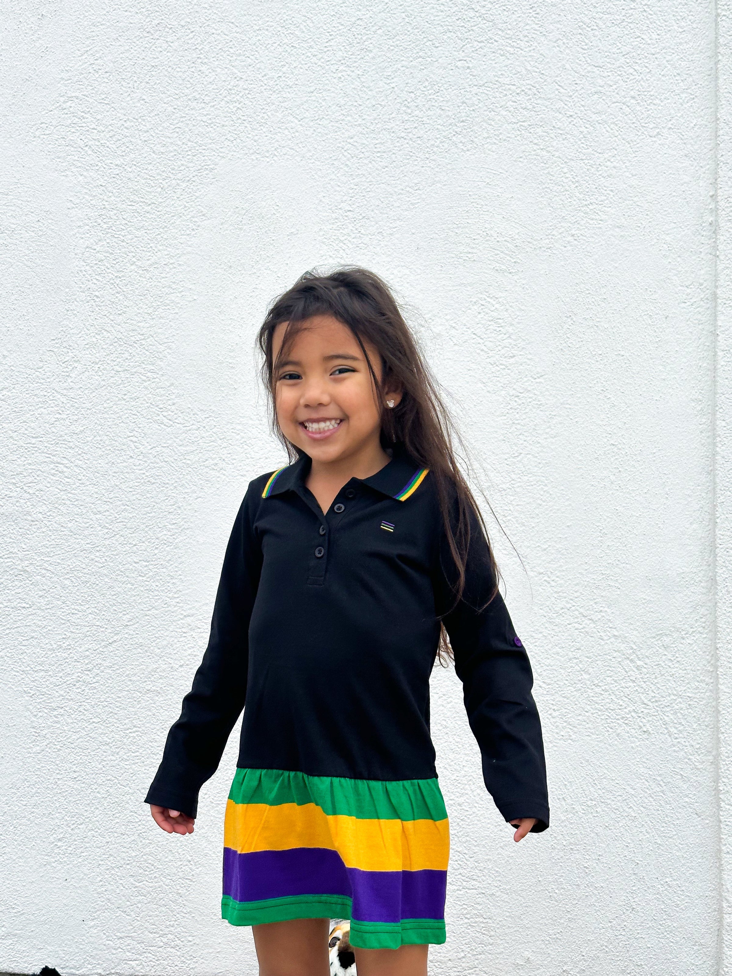 Black polo dress with purple, green, and gold striped skirt and stripes on the collar and buttons on the sleeve.