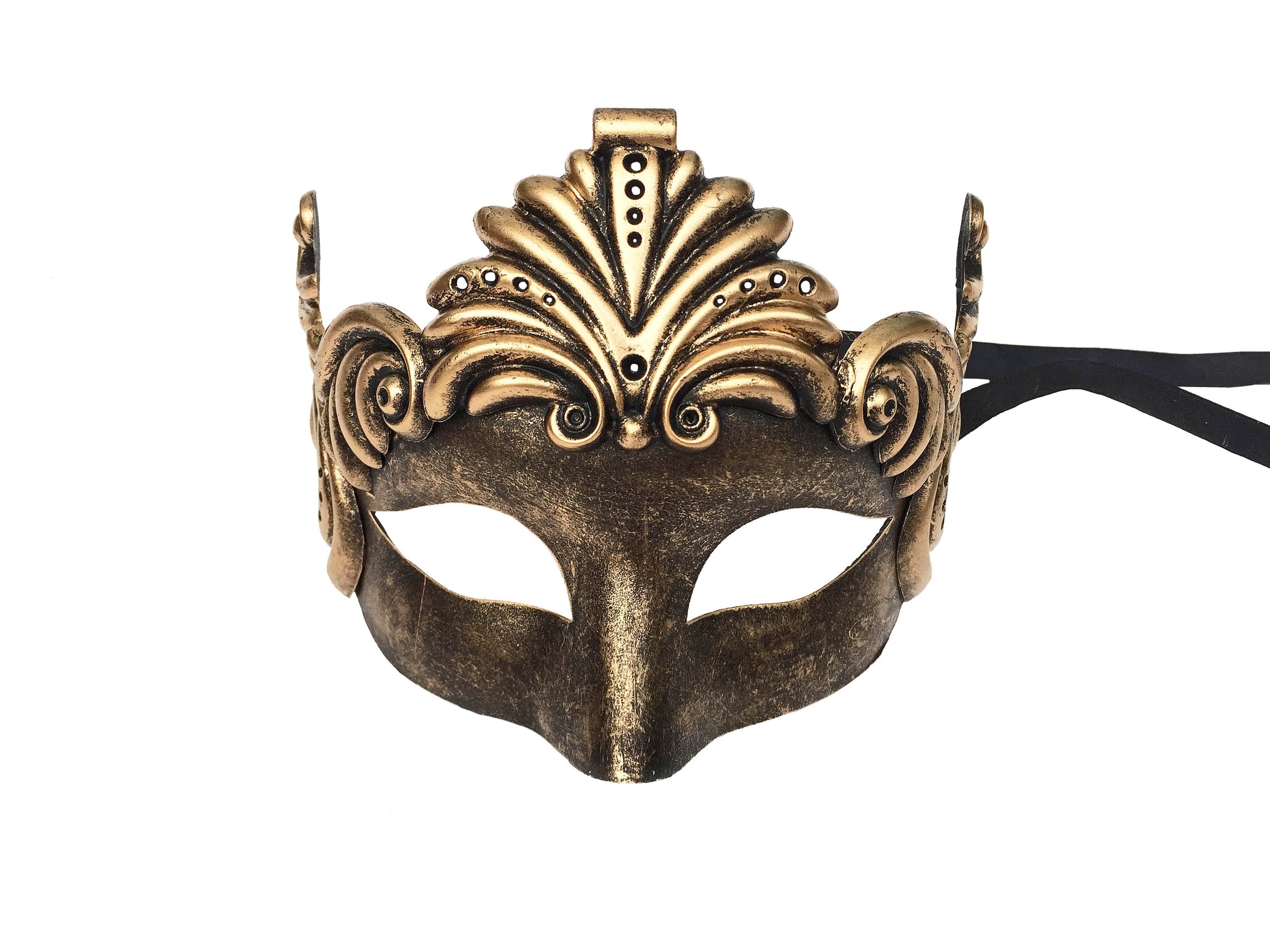This light weight mask gives the wearer the romanesque swirls as the topper to the cat eye cut bronze colored mask. All masks come with black ribbons to tie.