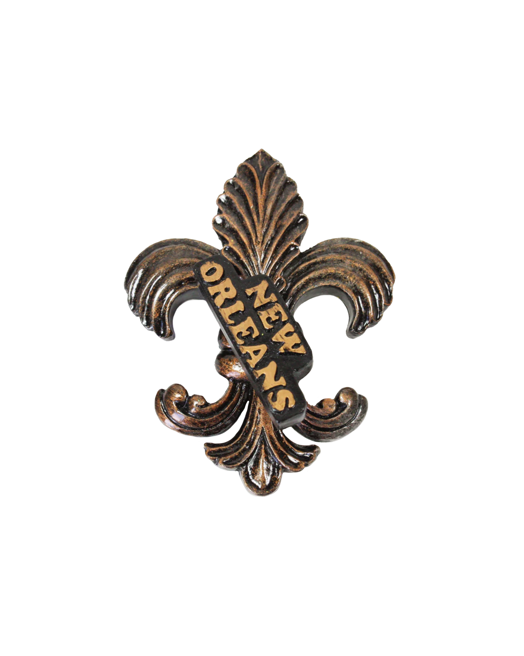 A classic magnet choice. A beautiful and artistic fleur de lis that is a burnished bronze color with a diagonal New Orleans on it. Makes a great, New Orleans themed gift!