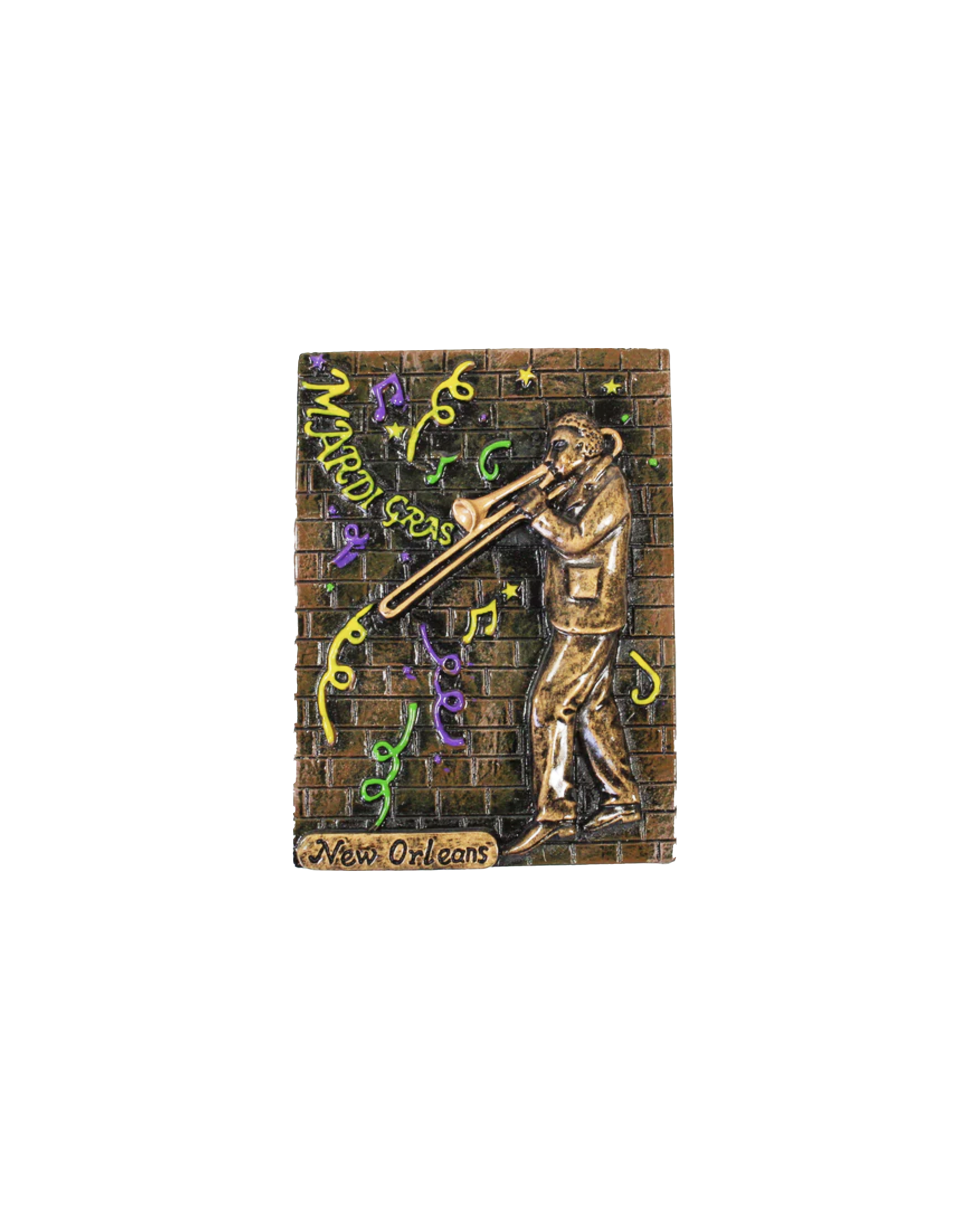 The iconic, New Orleans street musician stands out from his background as he plays his trombone... the music notes are purple, green and gold in color. This is a great gift for any jazz or music lover!