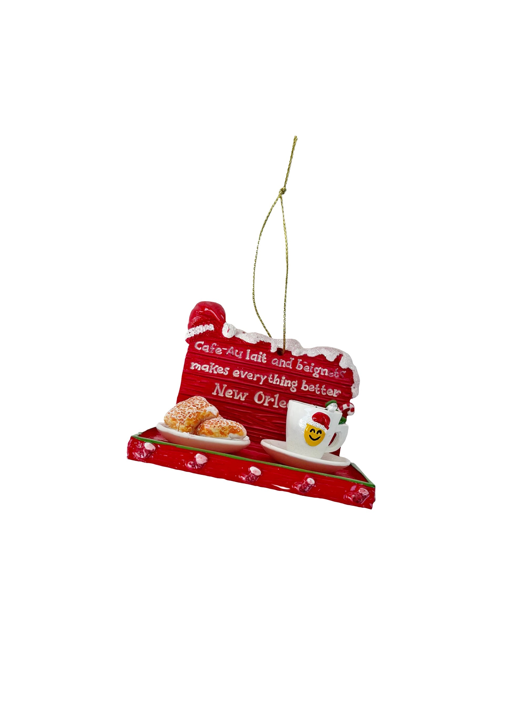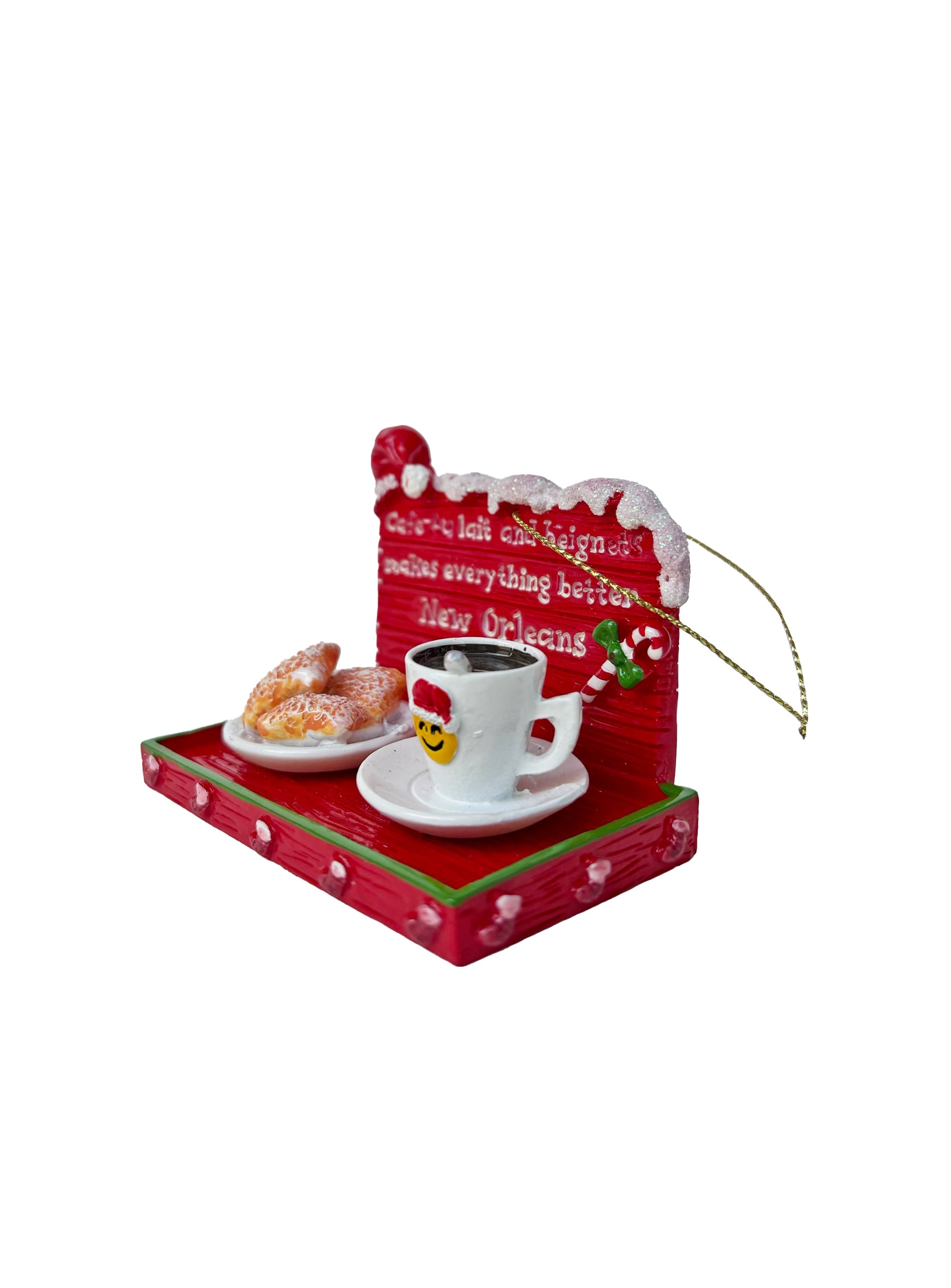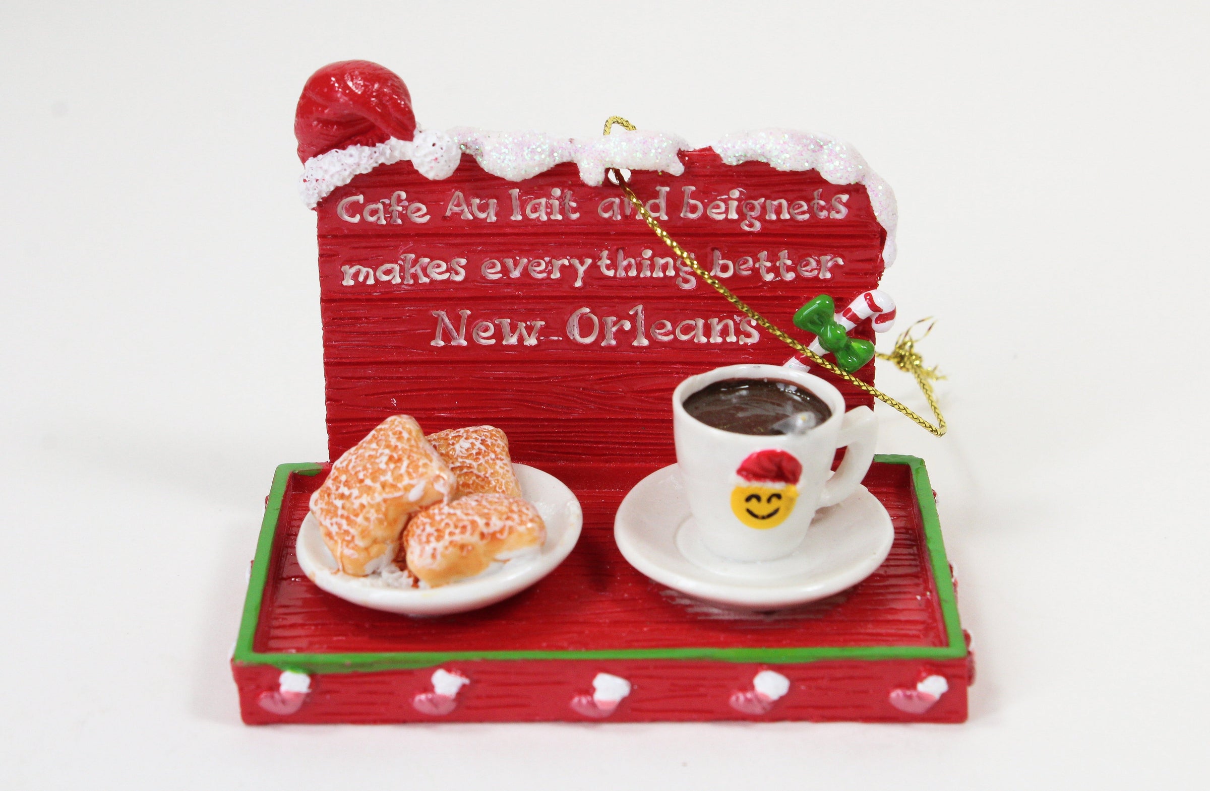 What goes better with a strong cup of cafe au lait coffee than those amazing powered French donuts? Well, nothing of course. This poly resin 3D ornament gives you a tray of individual orders of Cafe au Lait and Beignets to celebrate and reads "Cafe au Lait and Beignets makes everything better." Ornament is 2" high by 3" long by 2" deep with a gold string at the top for hanging.
