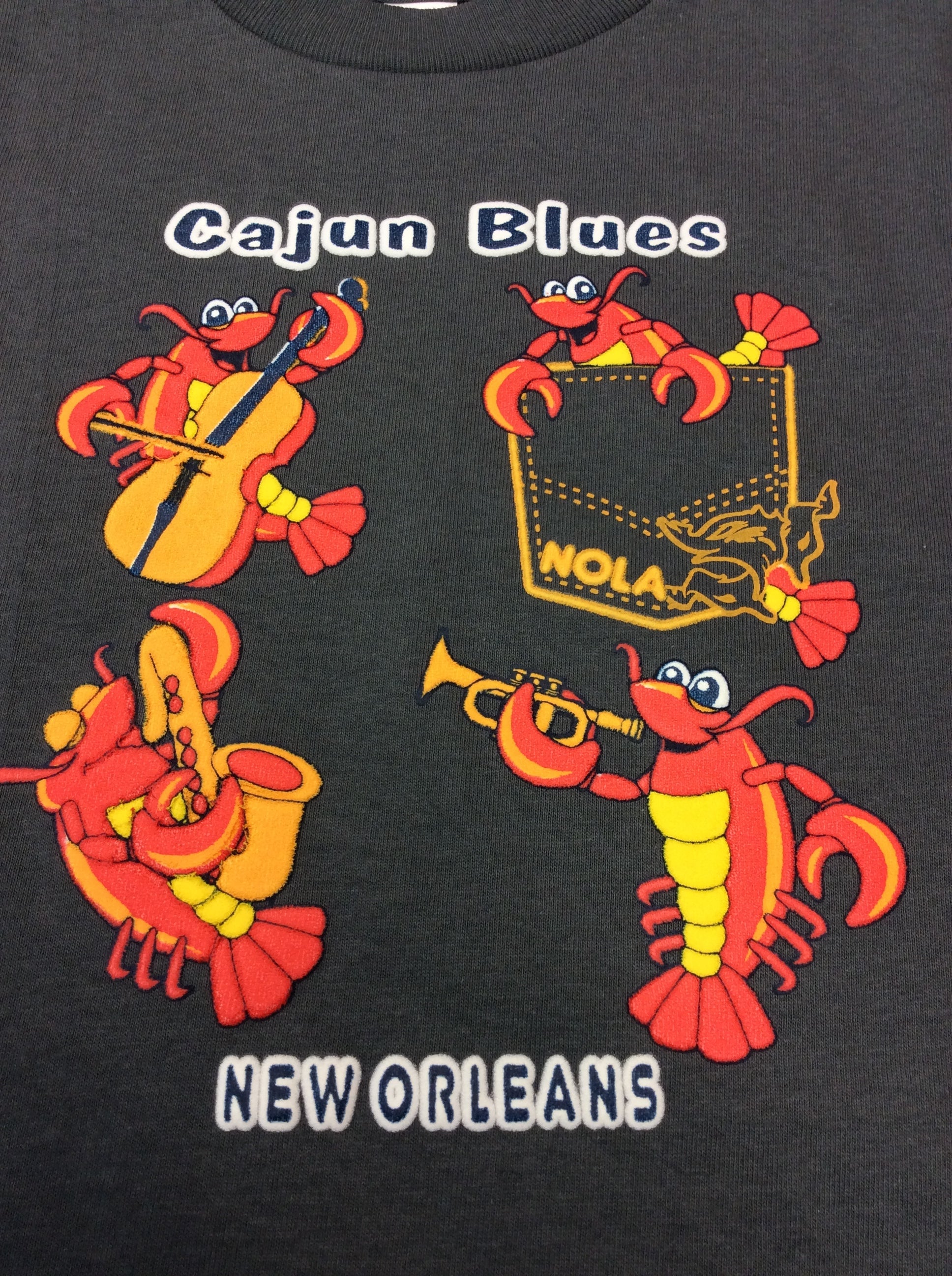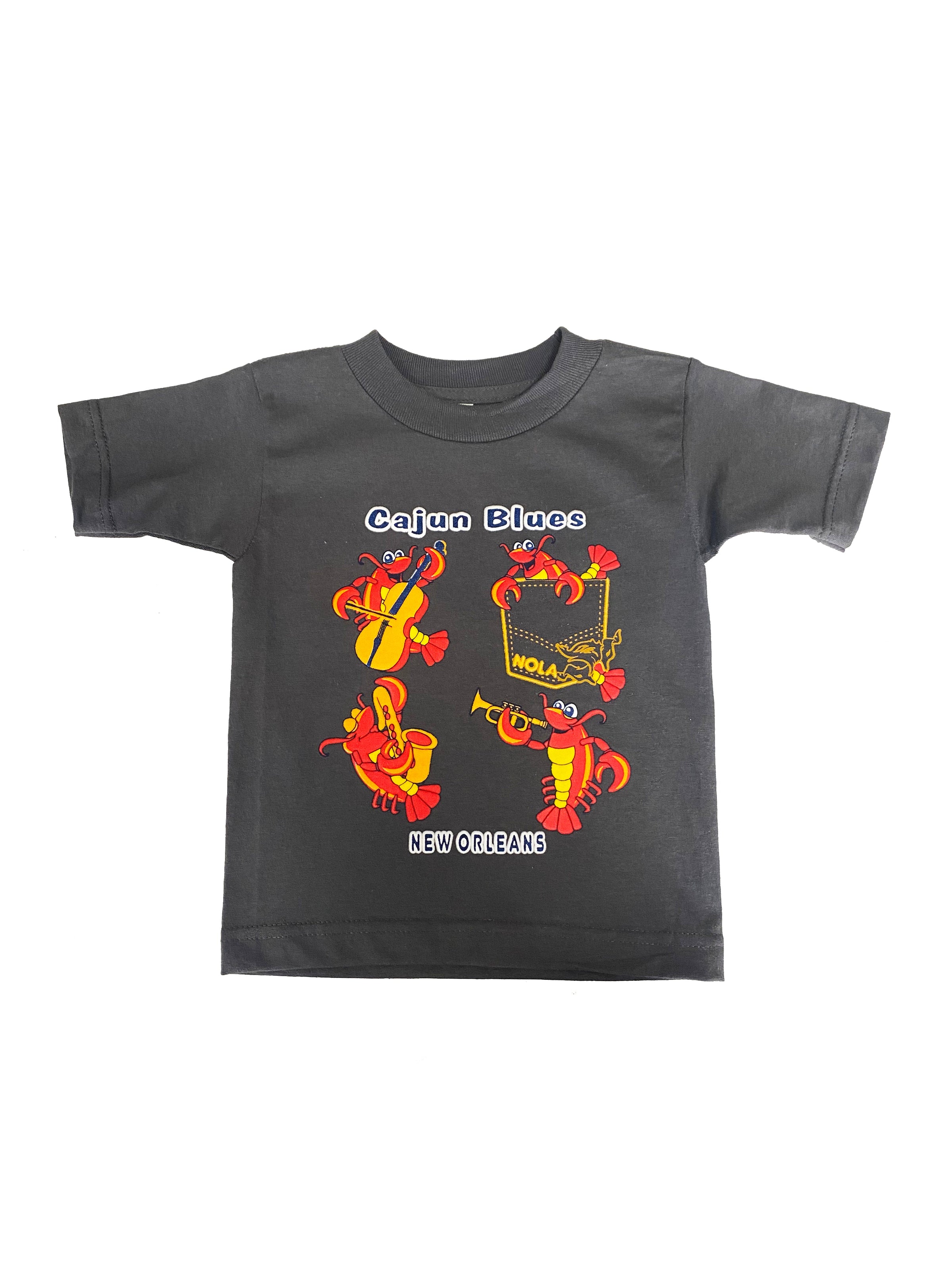 Featuring Cajun Blues graphic with crawfish playing in a jazz band!