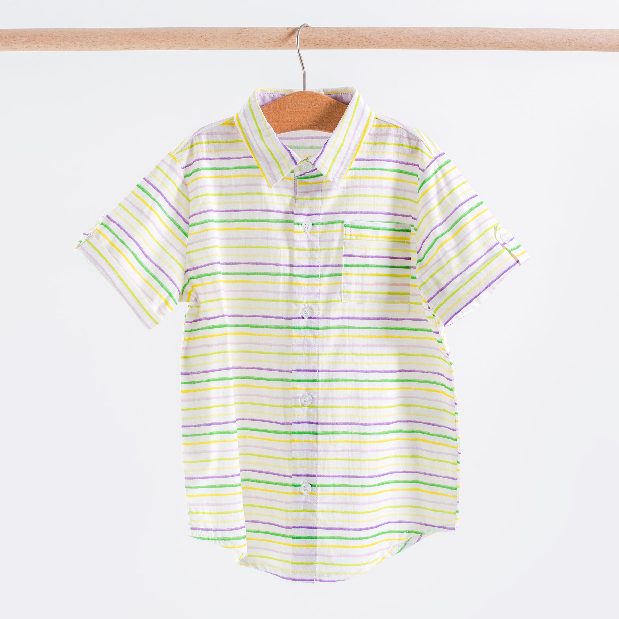 Get your little one parade-ready with the Carnival Time Organic Cotton Boys’ Collared Shirt—a festive must-have for Mardi Gras and Louisiana celebrations. Featuring bold purple, green, and gold stripes, this classic button-down shirt is perfect for parade routes, family parties, game days, and everyday adventures.