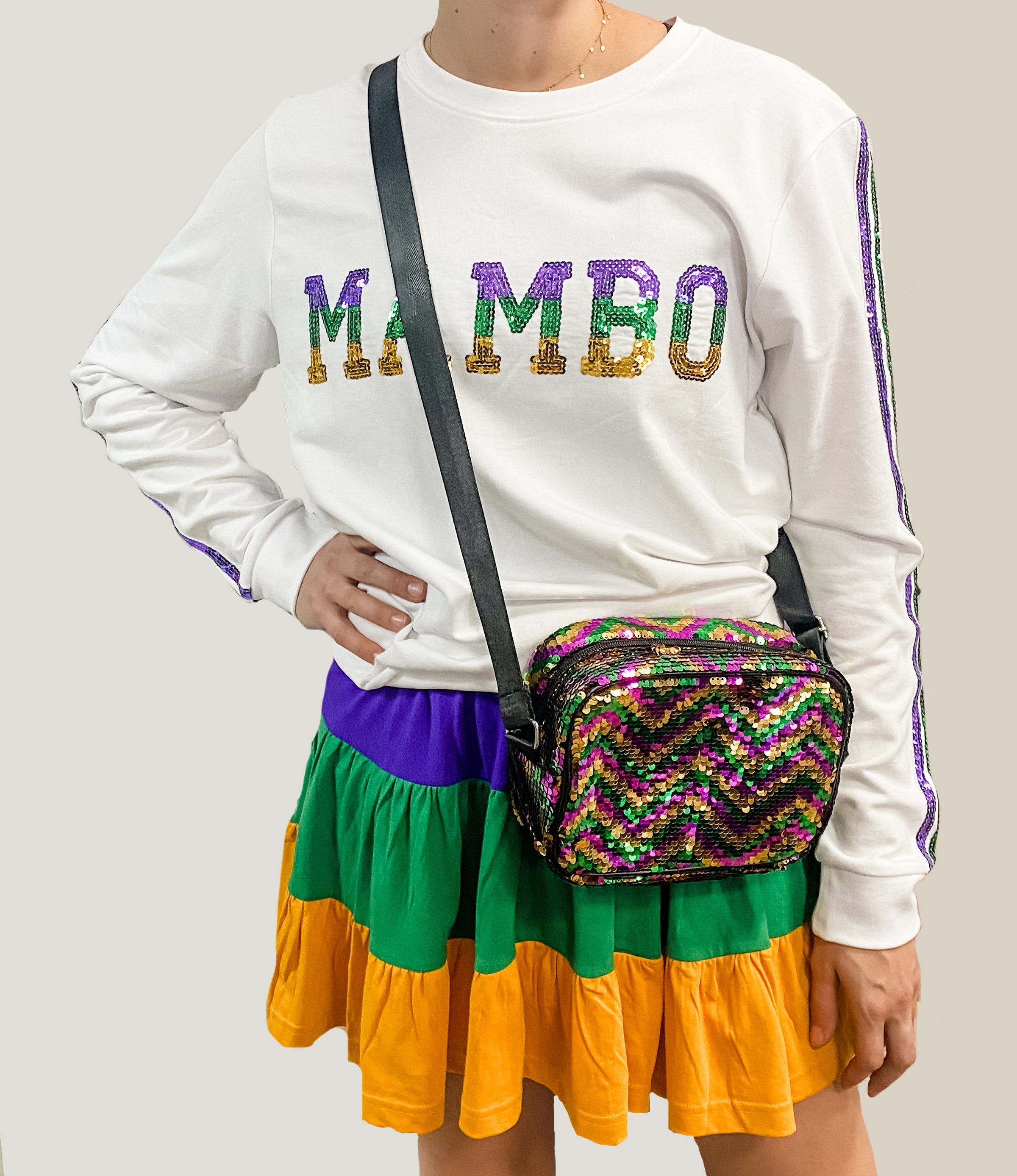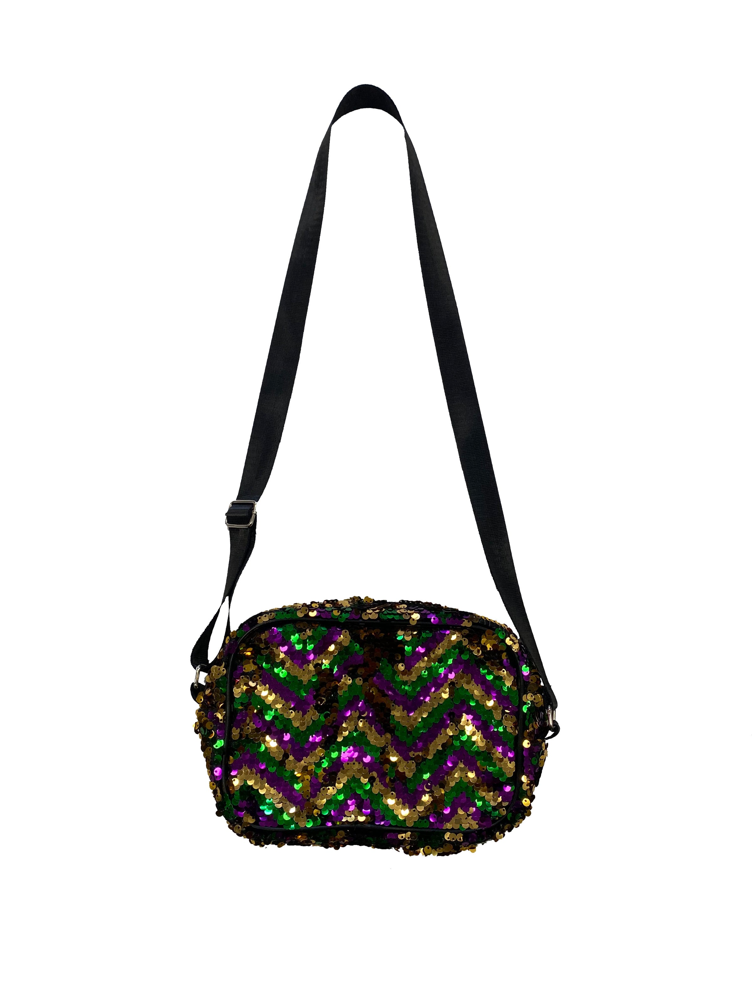 Be bold this Mardi Gras in the Chevron Crossbody Sequin Purse! This colorful, sequined bag is perfect for adding a pop of pizzazz to any outfit. The adjustable crossbody strap provides a secure, yet comfortable fit for every kind of partygoer. Shine bright and show off your parade-worthy style!