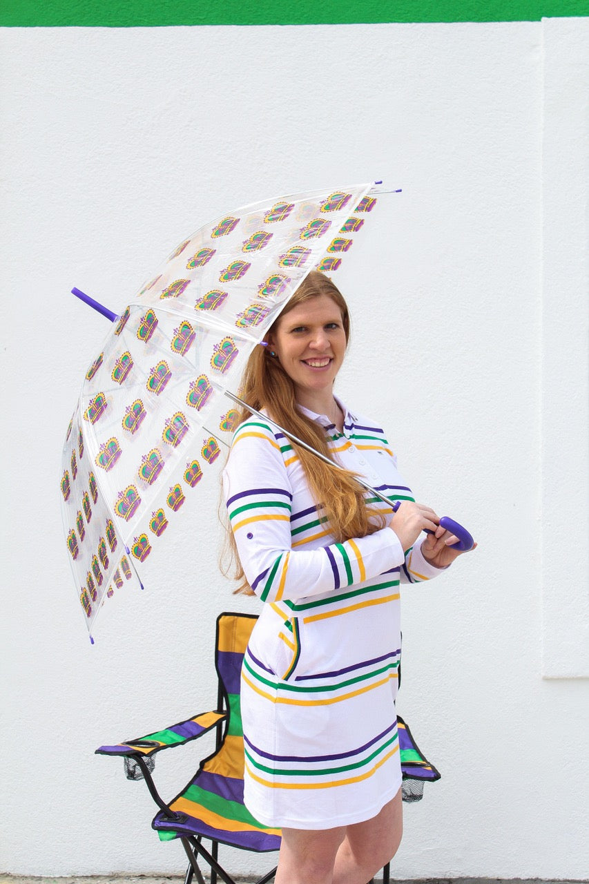 Love this fabulous golf umbrella perfect for the intense monsoon like summer rainfalls! Clear with a purple handle and purple, green and gold crowns. Perfect for Mardi Gras!