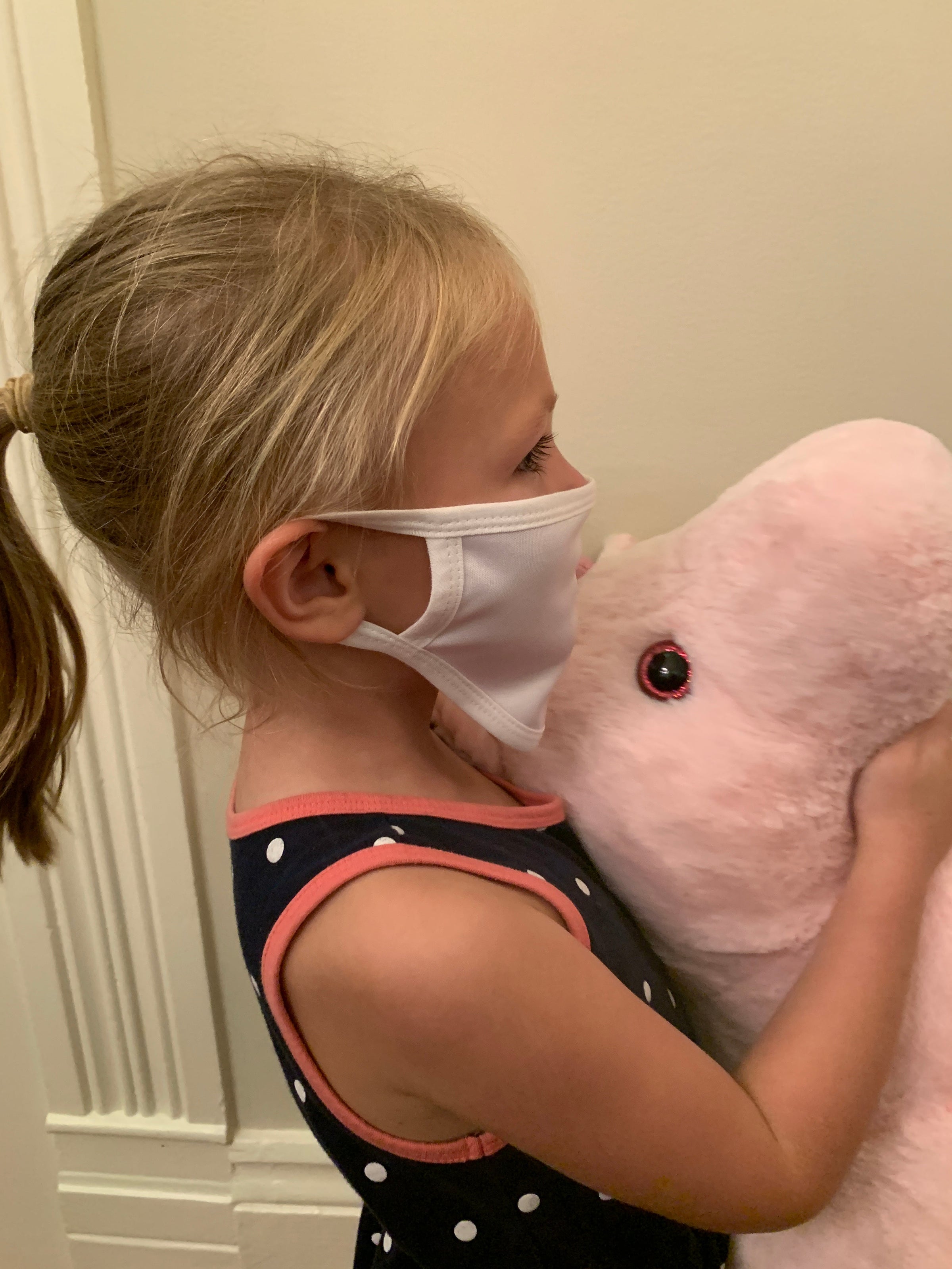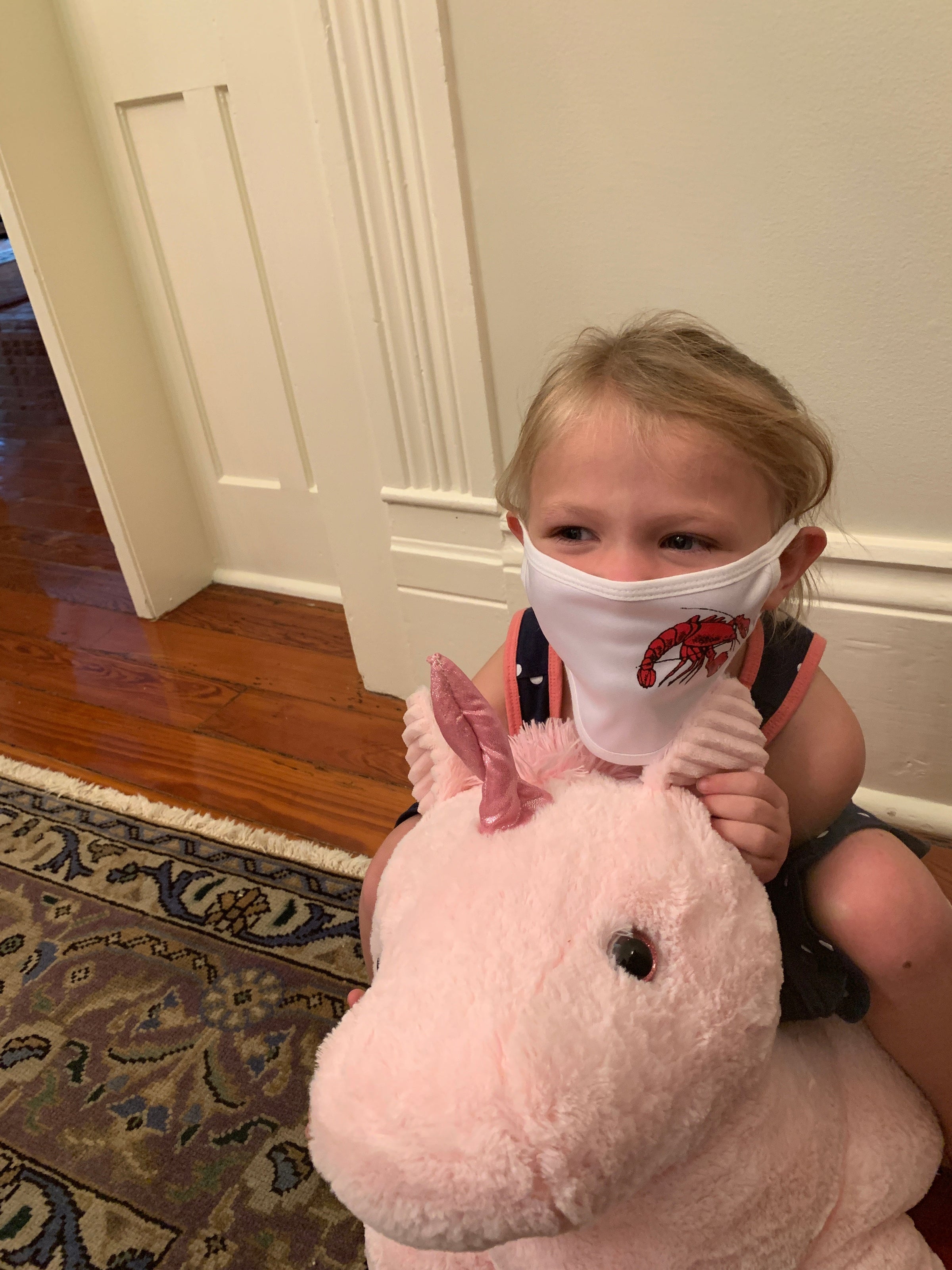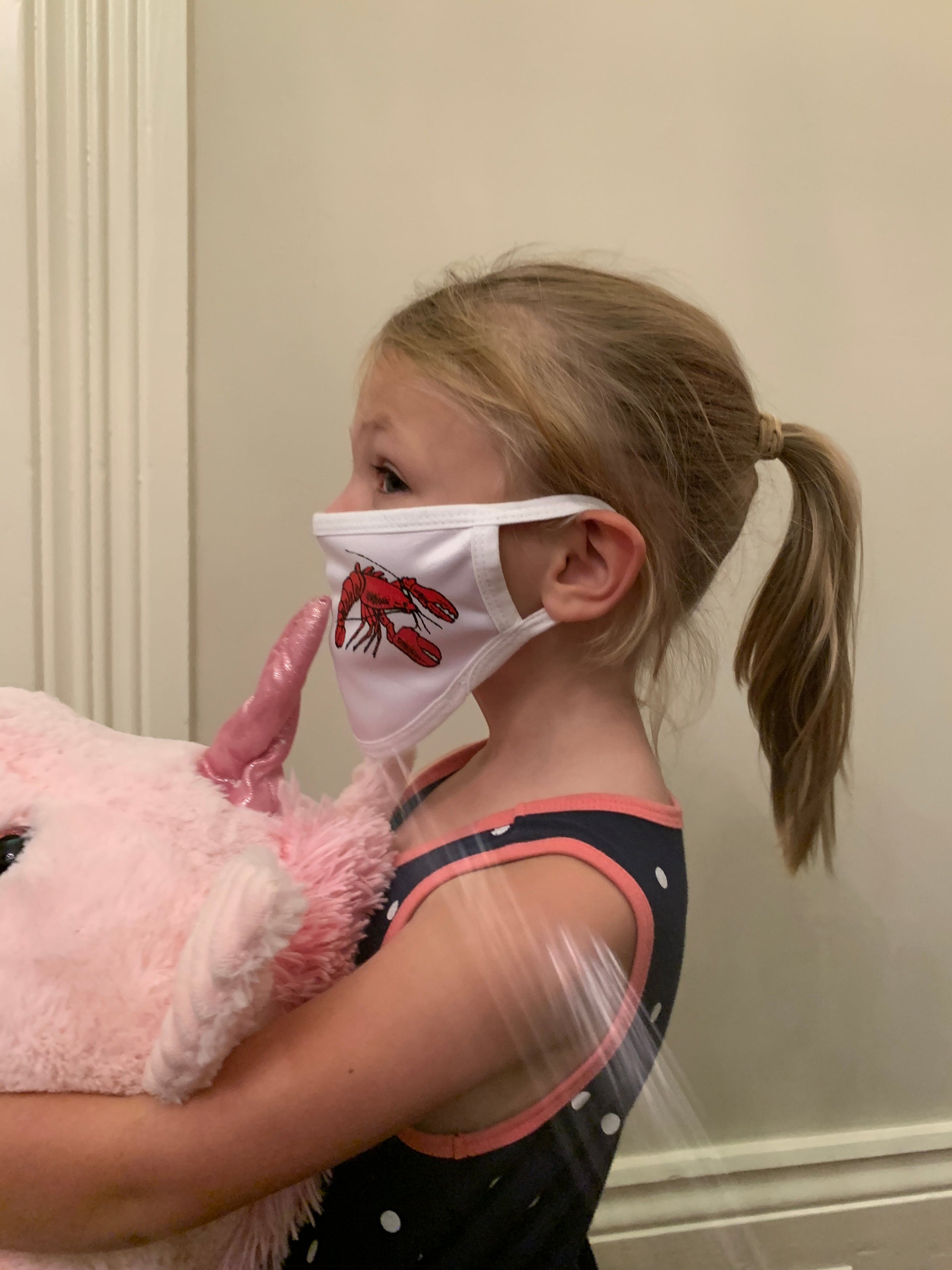 Mask Up in style! This Kids reusable face mask is a white and features a crawfish design on the left cheek and ear loops