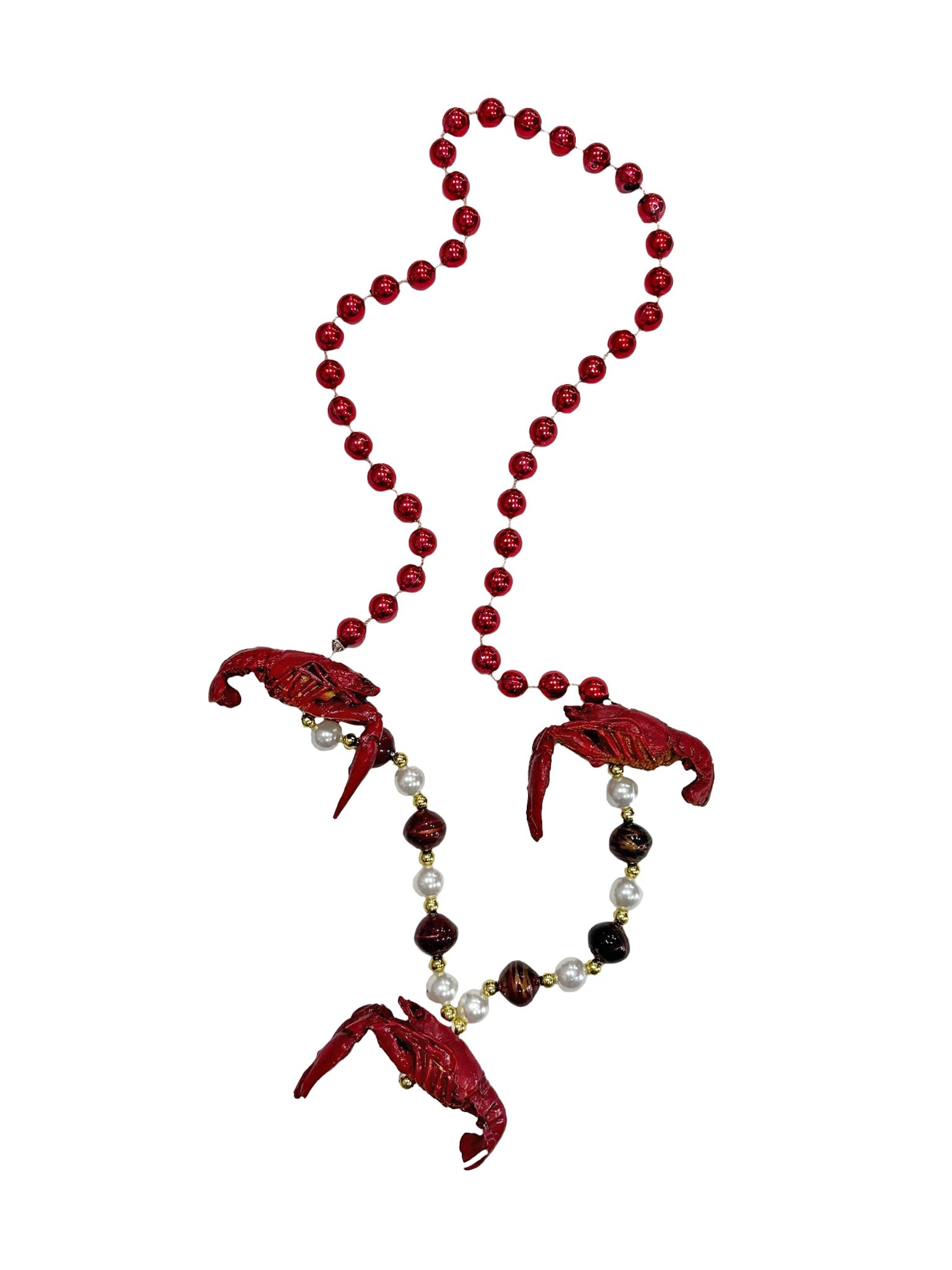 Crawfish, Crawfish and more Crawfish! This specialty bead features 1 large crawfish, measuring 2 1/2" wide x 2" high, and 2 slightly smaller crawfish all with extremely realistic detail. The crawfish are hand strung evenly along the bottom of the bead with custom red and pearl white beads. The necklace is 42" long with 12 mm beads.