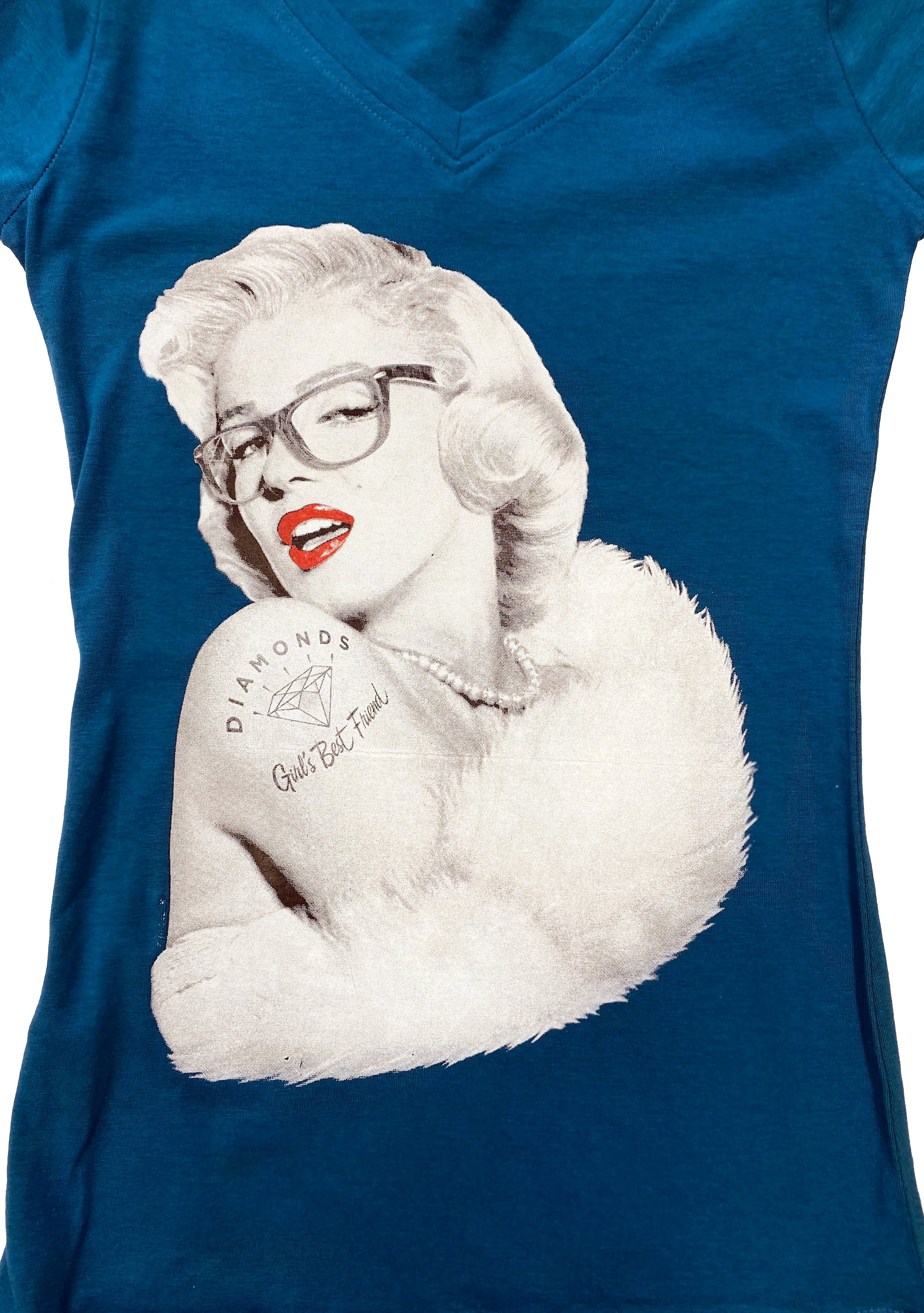 Shine bright like a diamond in our Marilyn Monroe V-neck tee! Featuring Marilyn with glasses and a playful 'diamonds are a girl's best friend' tattoo, this fitted shirt is the perfect blend of glam and sass.