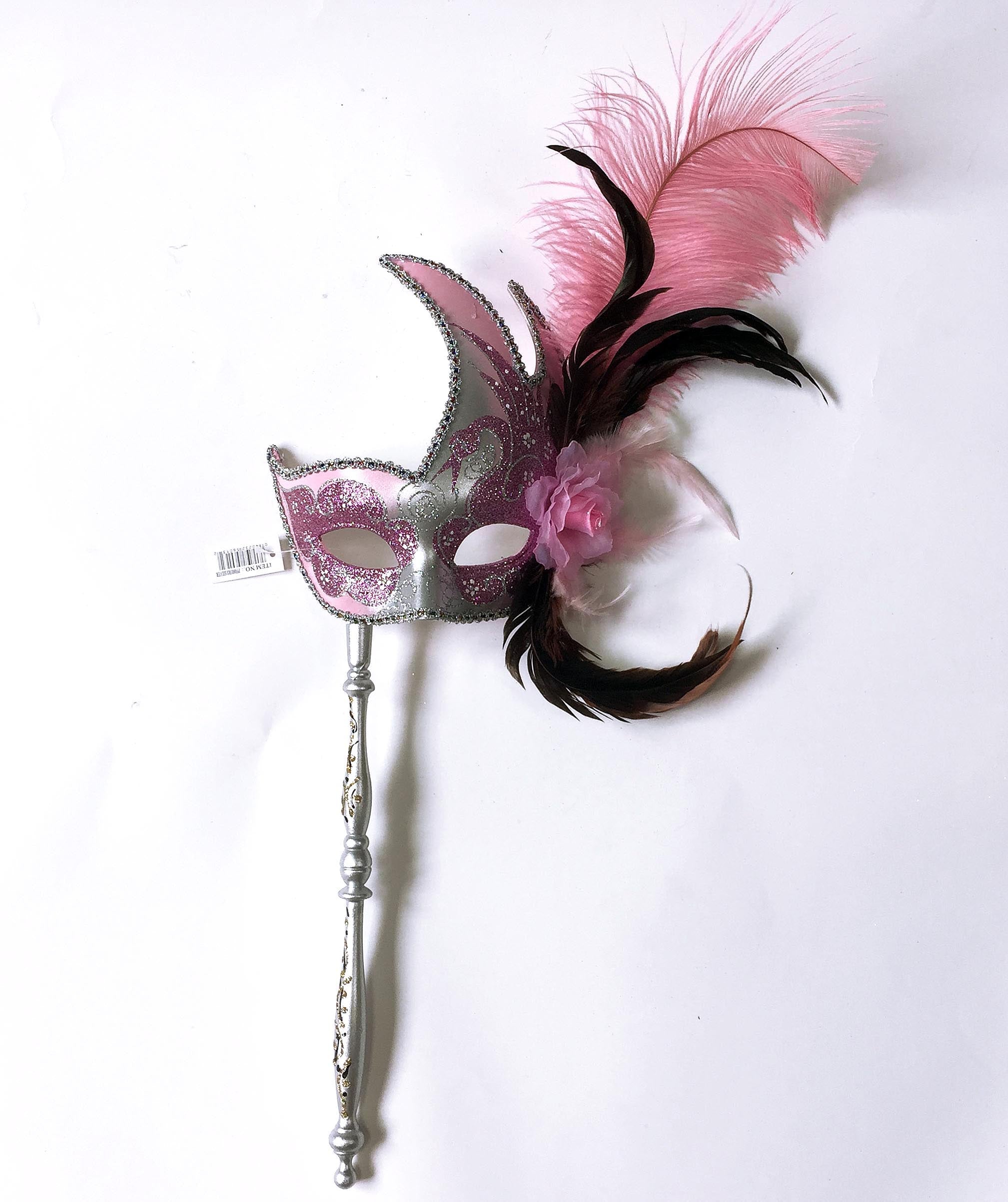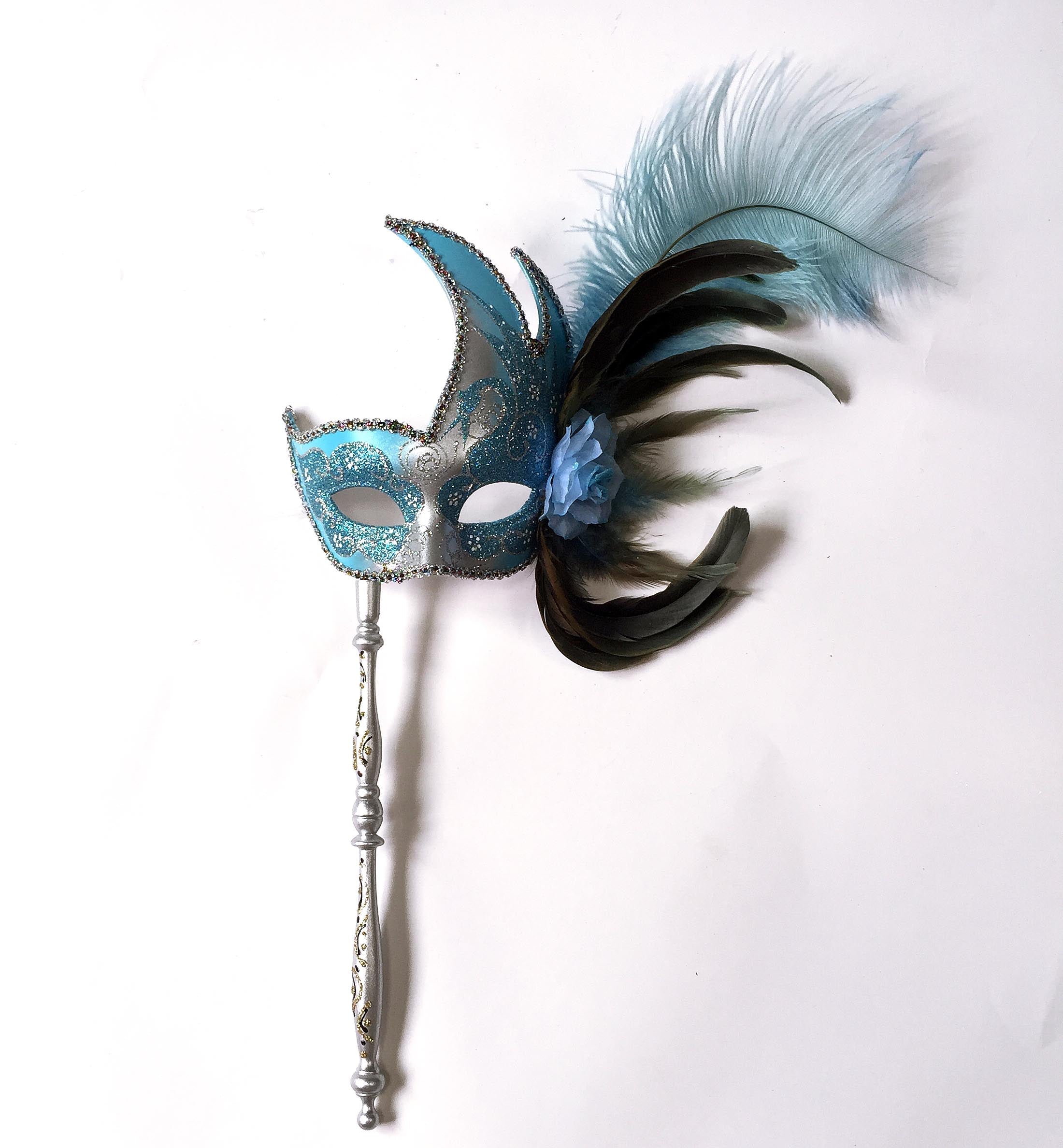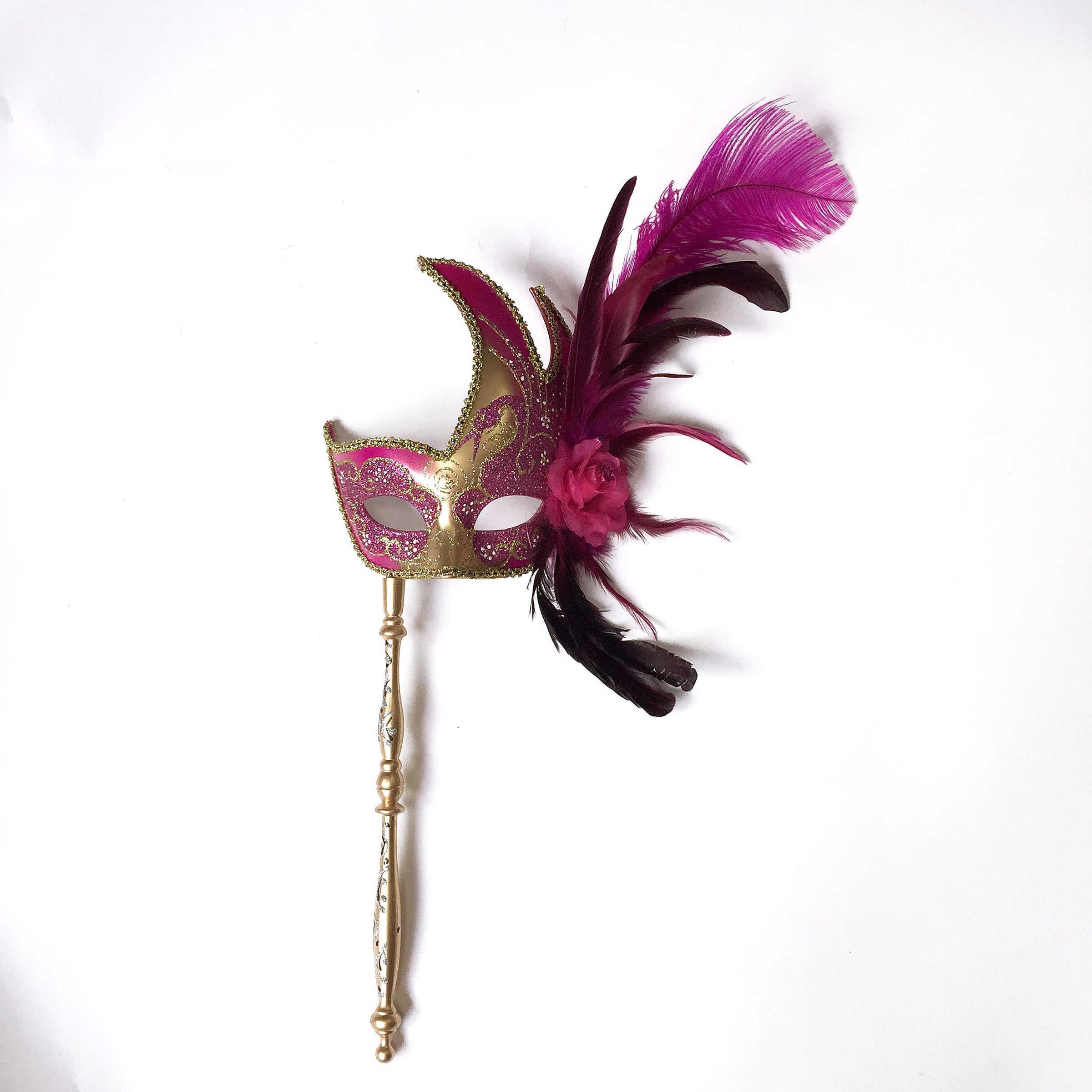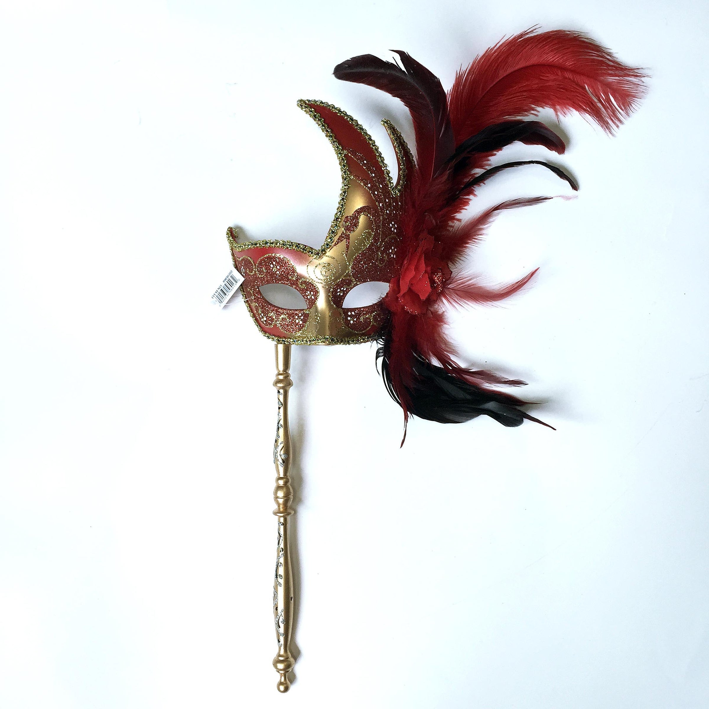 These masks are great for people who wear glasses or don't like things sitting on their face. Stylish colorful masks with side flames up the left side. Masks have correlating glittered color accents across the face of the mask with matching feathers and plumes attached to the left side with a matching rose. Each mask comes with a detachable accented gold or silver stick.