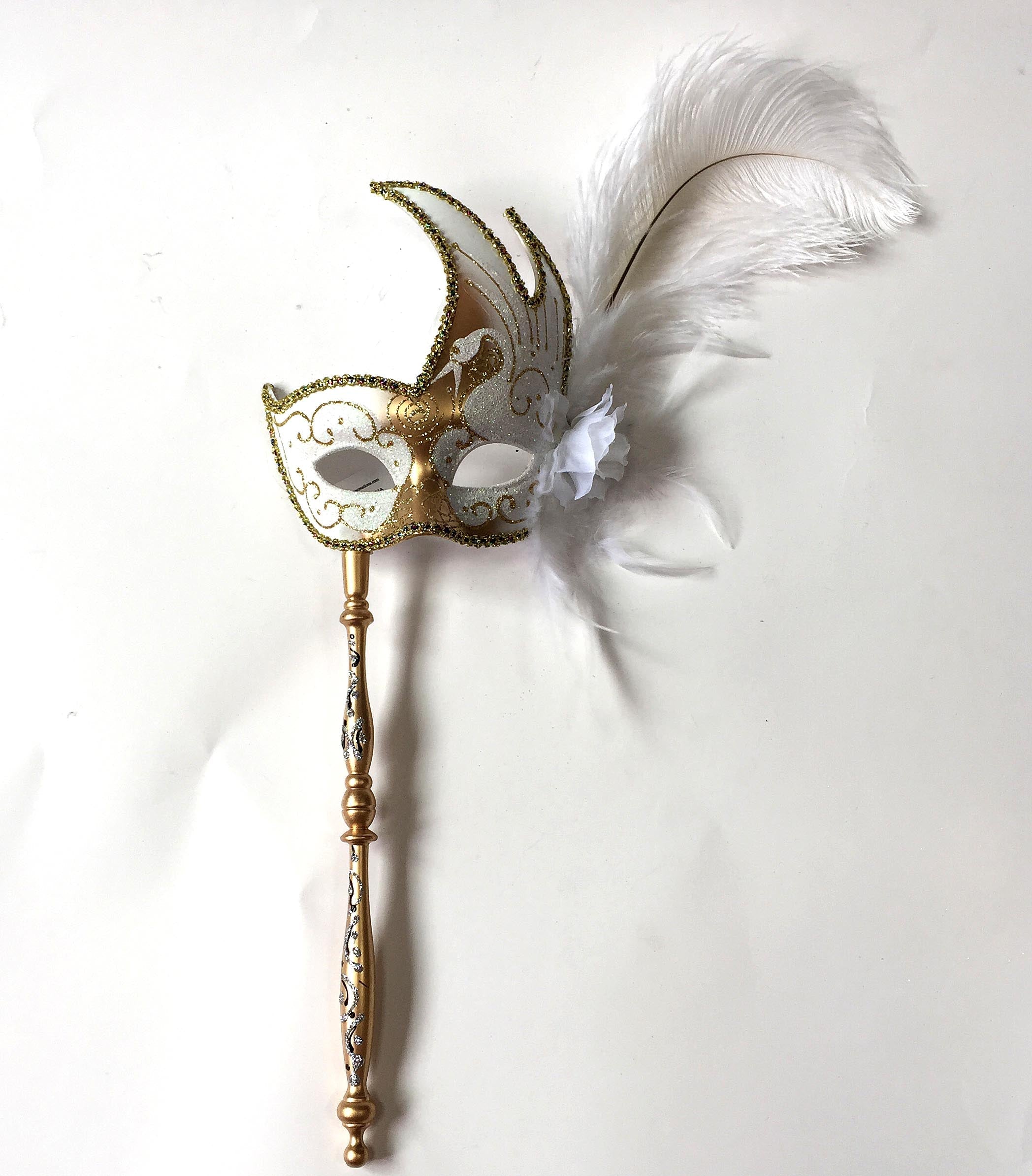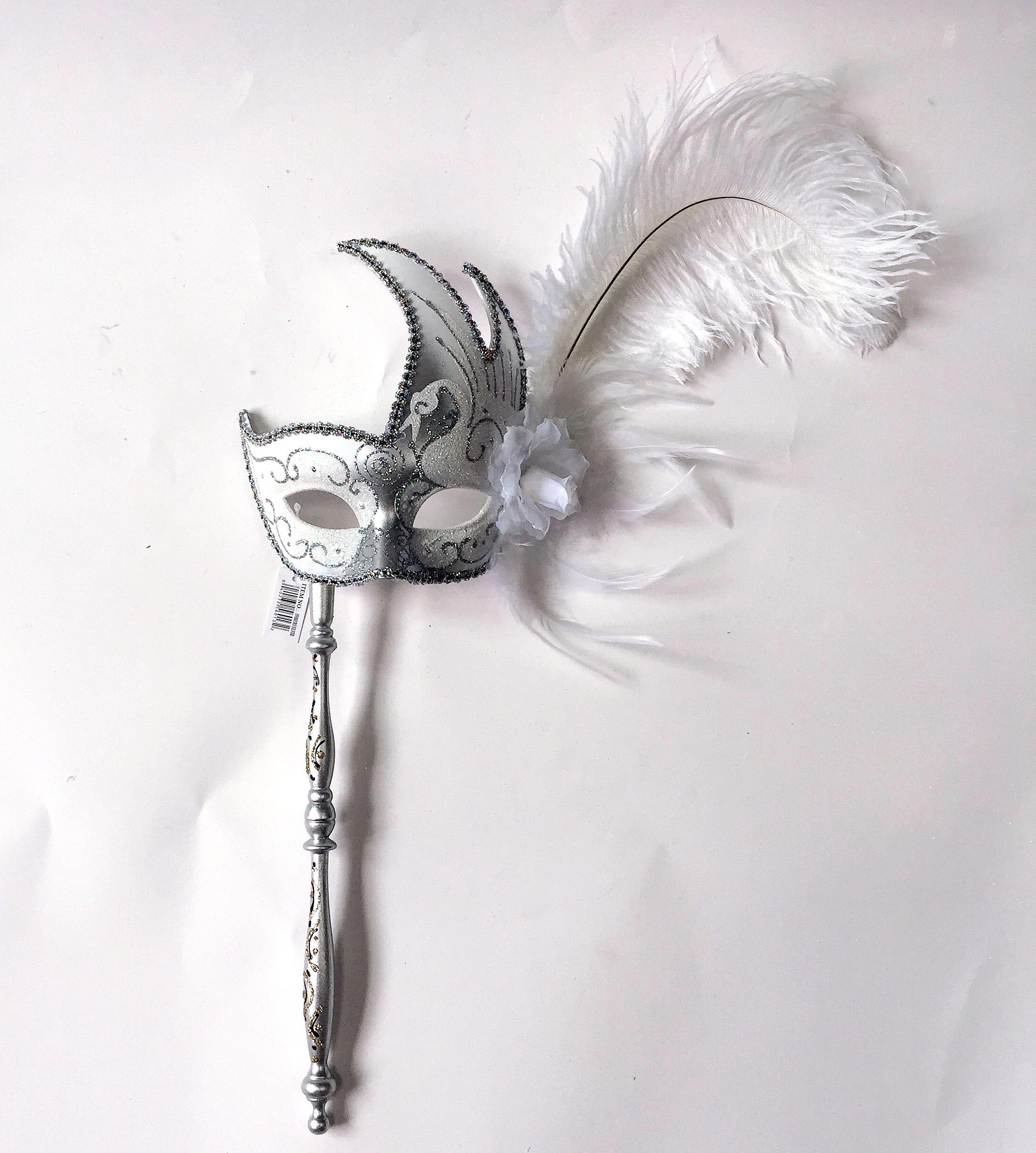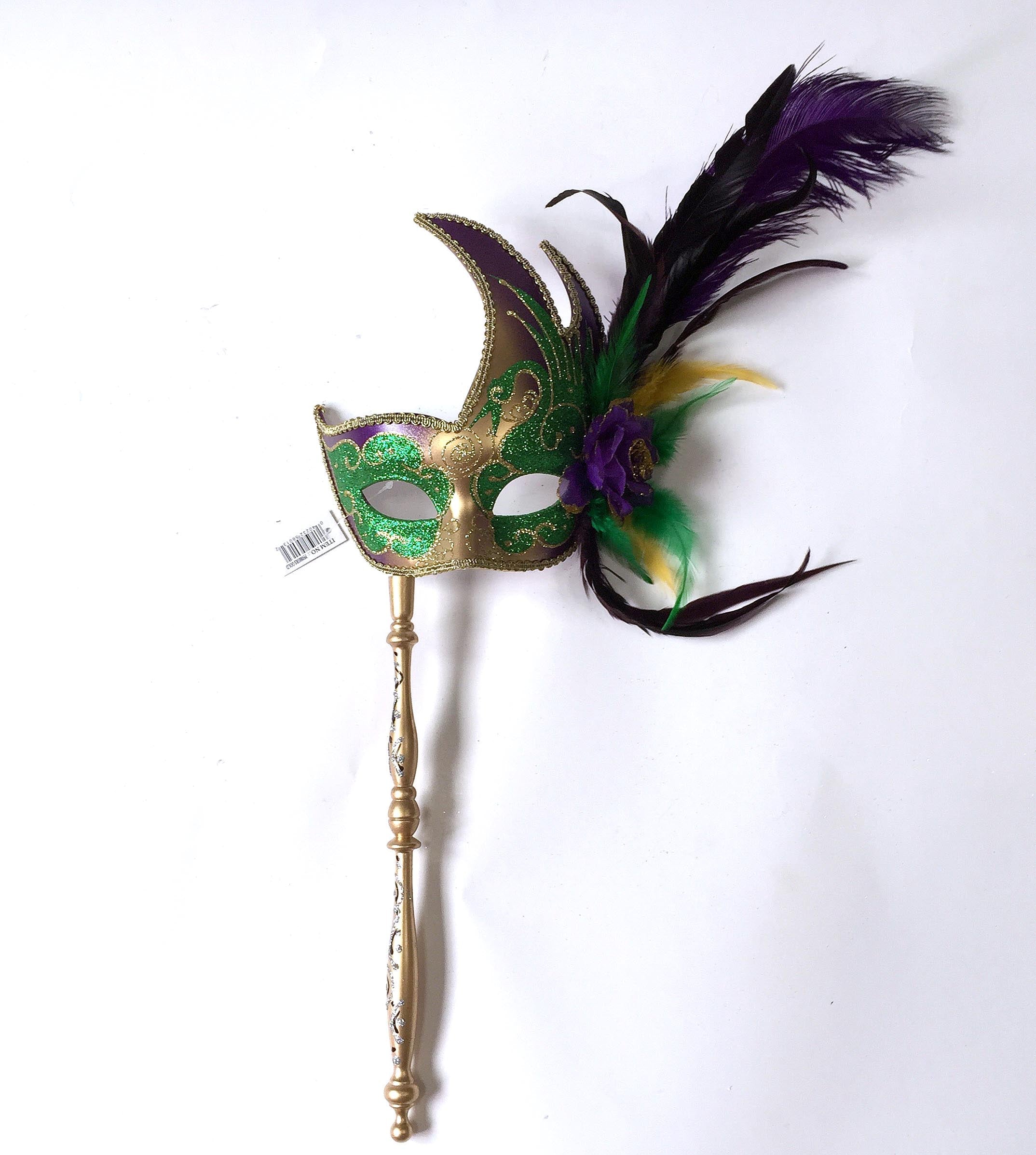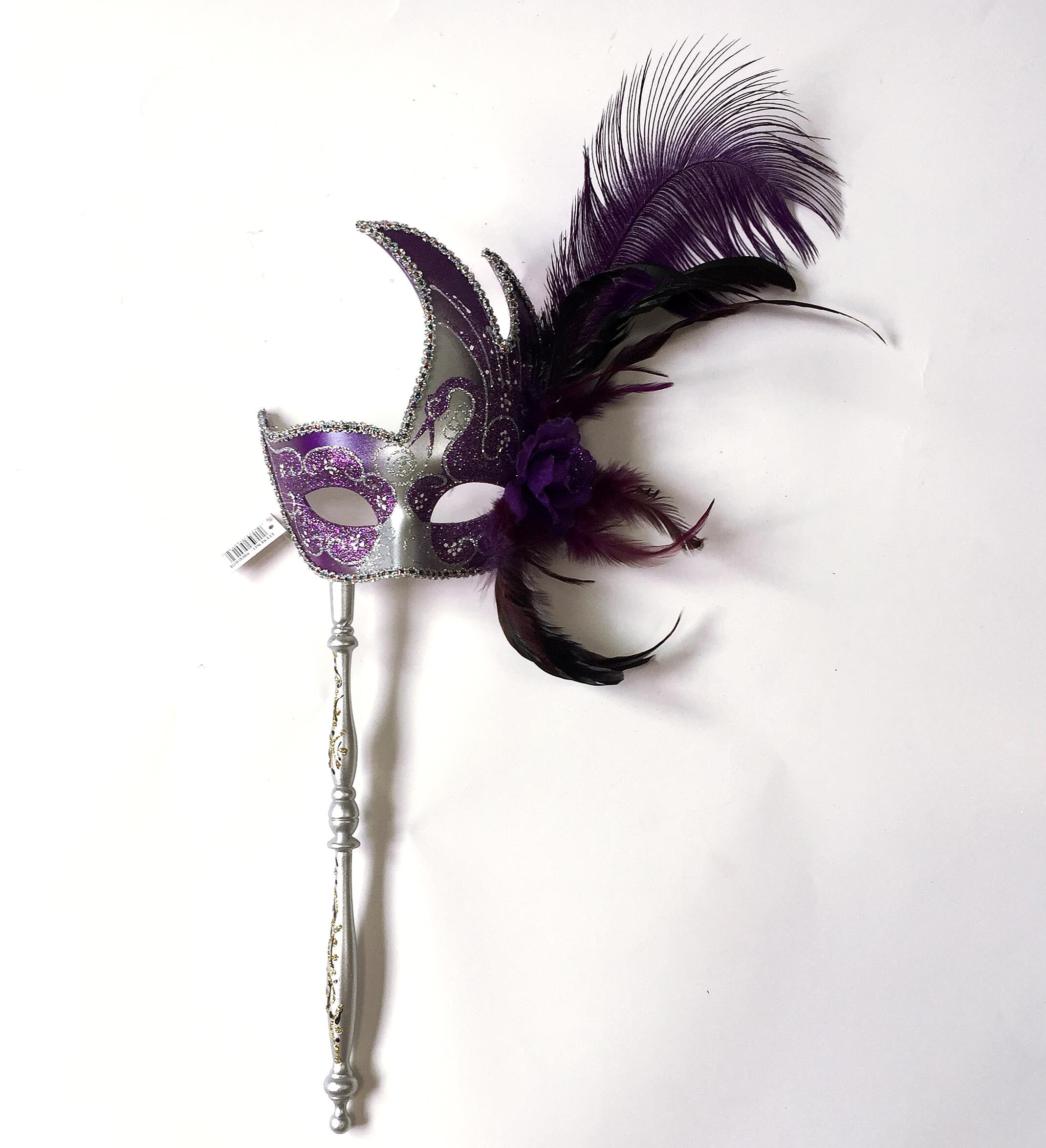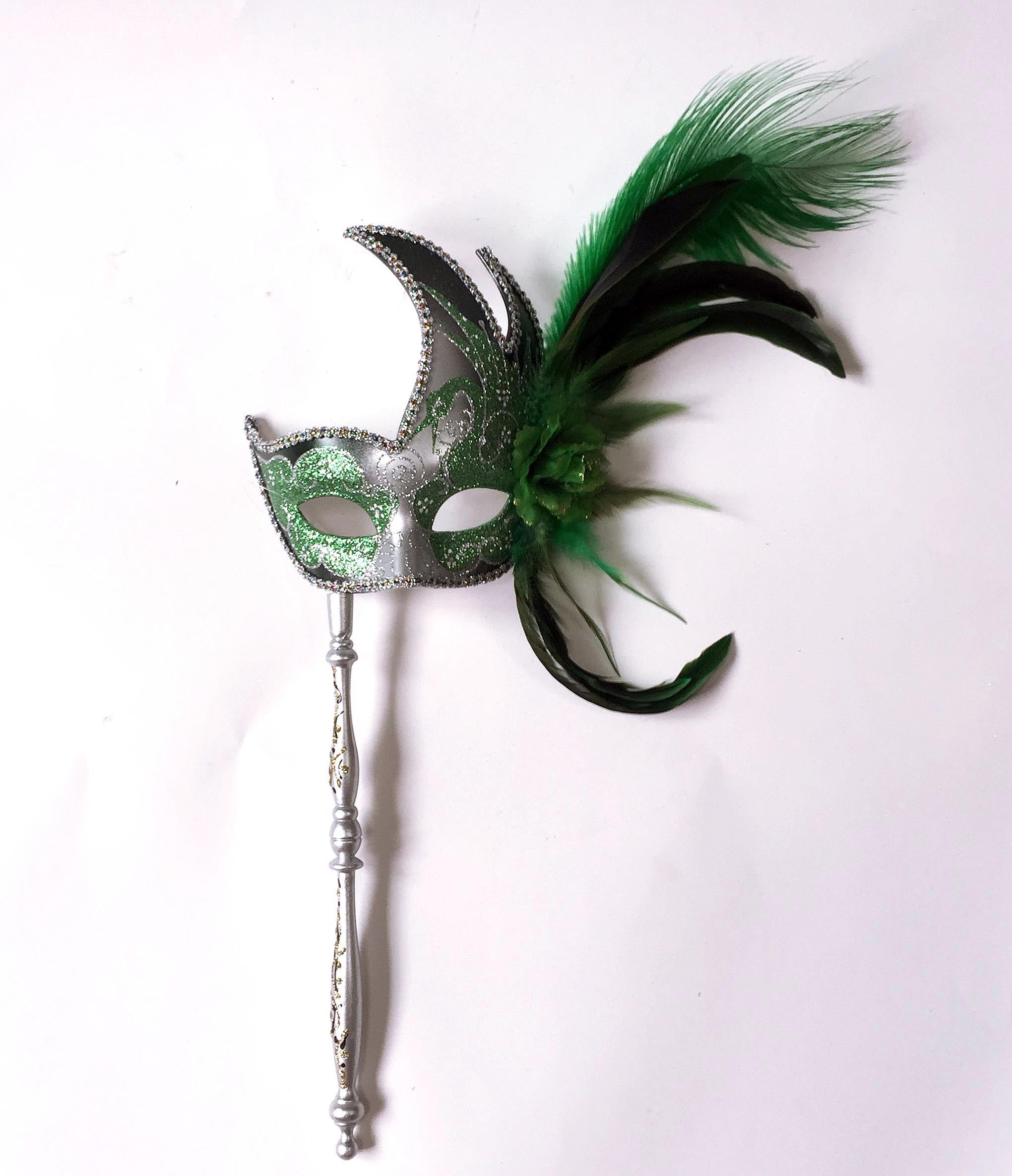 These masks are great for people who wear glasses or don't like things sitting on their face. Stylish colorful masks with side flames up the left side. Masks have correlating glittered color accents across the face of the mask with matching feathers and plumes attached to the left side with a matching rose. Each mask comes with a detachable accented gold or silver stick.