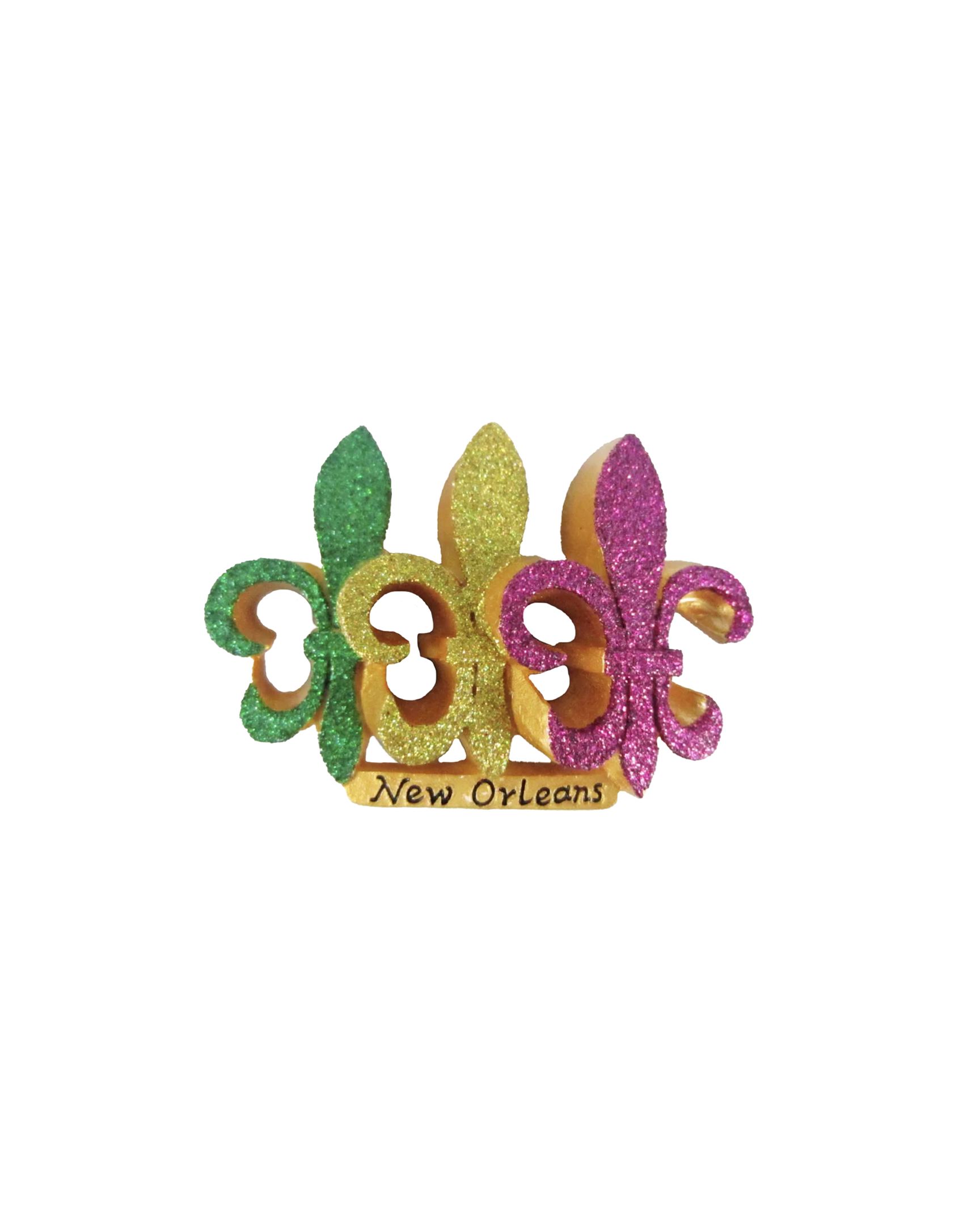 This magnet has three fleur de lis stacked with purple, green and gold glitter with New Orleans written on the bottom. Magnet is approximately 3" wide x 2" high.